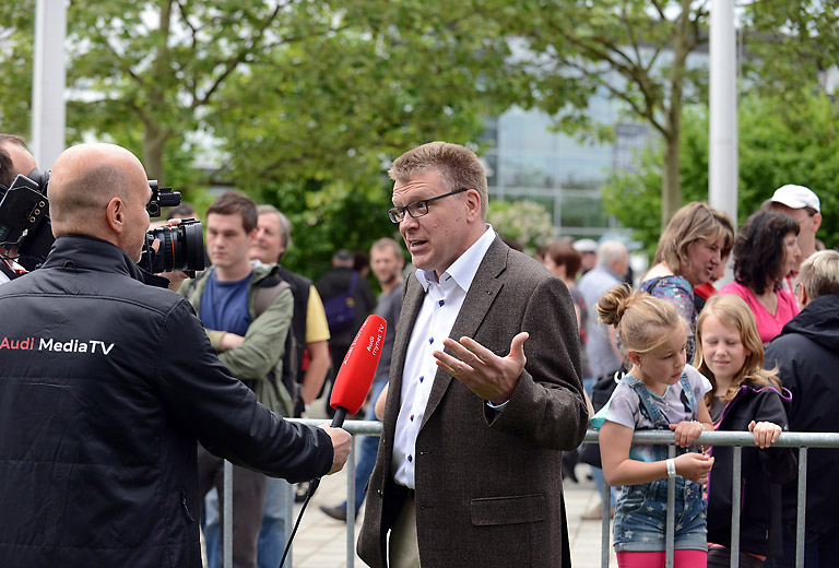 Audi-Personalvorstand und Arbeitsdirektor Thomas Sigi begrüßte die Besucher des Familientages auf der Audi-Piazza: „Audi ist eine starke Marke, getragen von einer starken Mannschaft. Heute öffnen wir die Tore des Standortes für ein buntes Familienfest: Eine ideale Gelegenheit, um die Faszination der Marke mit den Angehörigen unserer Audianer hautnah zu teilen und ihnen einen exklusiven Einblick hinter die Kulissen zu geben.“