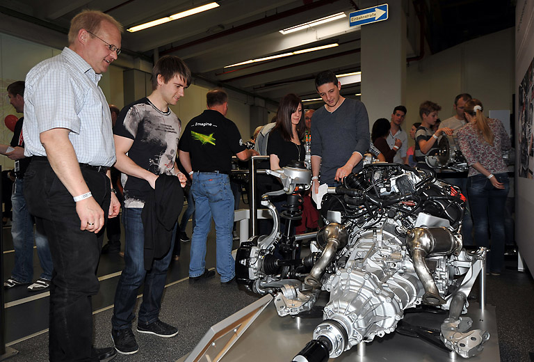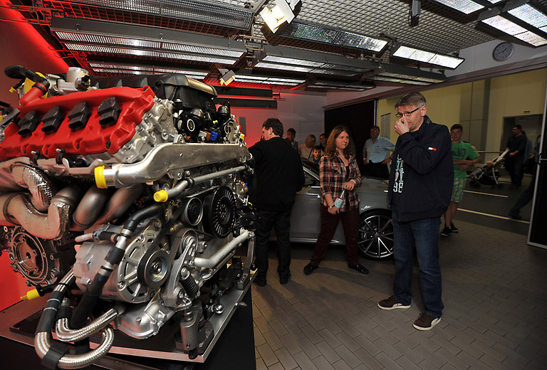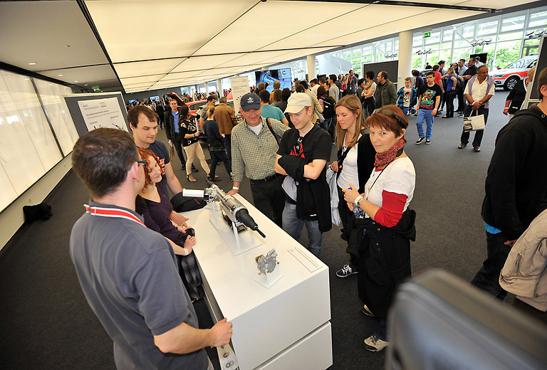 Wo sonst neue Audi-Modelle ausgeliefert werden, präsentierte die Technische Entwicklung ihre Highlights. Im Kundencenter veranschaulichten Exponate neueste Technologien, wie zum Beispiel die innovativen Lichttechniken Matrix Beam und Laserlight sowie automobilen Leichtbau und alternative Antriebskonzepte. Außerdem stellten die Entwickler das Showcar Audi TT quattro sport concept, den Audi A3 Sportback e-tron und den Audi A3 Sportback g-tron vor.