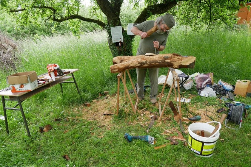 Ab 14 Uhr läuft demnach am Samstagnachmittag die Vernissage. Um 17 Uhr beginne die Finissage, die nahtlos in die Abschluss-Feier übergehe. Diese dauere bis 21 Uhr. Sie werde von der Gruppe "Tumblinweed" musikalisch umrahmt; außerdem gebe es ein Lagerfeuer. "Alle Interessierten sind eingeladen und können mitwirken", wird betont. Eröffnet worden war das Kunst-Symposium am Montagnachmittag. Seither konnte und kann man den Künstlern bei ihrem Tun über die Schulter schauen und sich auch selbst an dem "Welt-Lebensbaum" durch die Gestaltung eines Blattes aus Ton beteiligen. Am heutigen Freitag besteht die Möglichkeit zur Mitwirkung noch bis 17 Uhr.