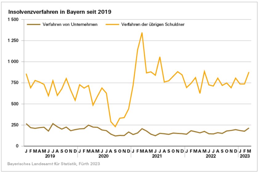 (ty) Wie das bayerische Landesamt für Statistik mitgeteilt hat, registrierten im ersten Quartal dieses Jahres die Insolvenz-Gerichte im Freistaat insgesamt 2927 Verfahren, darunter 577 Unternehmens-Insolvenzen und 2350 Verfahren der übrigen Schuldner (darunter 1422 Verbraucher-Insolvenzen). Im Vergleich zum Vorjahres-Zeitraum waren das insgesamt 6,6 Prozent mehr Insolvenz-Verfahren.