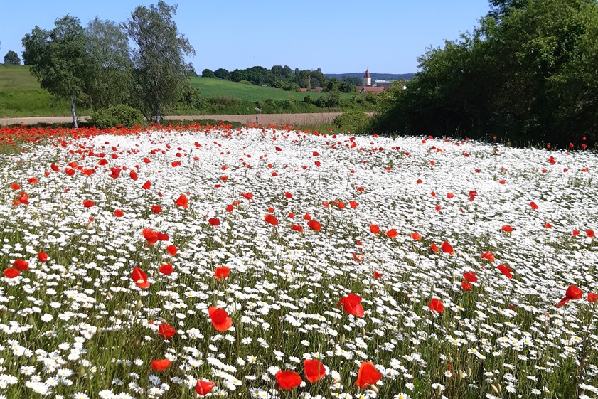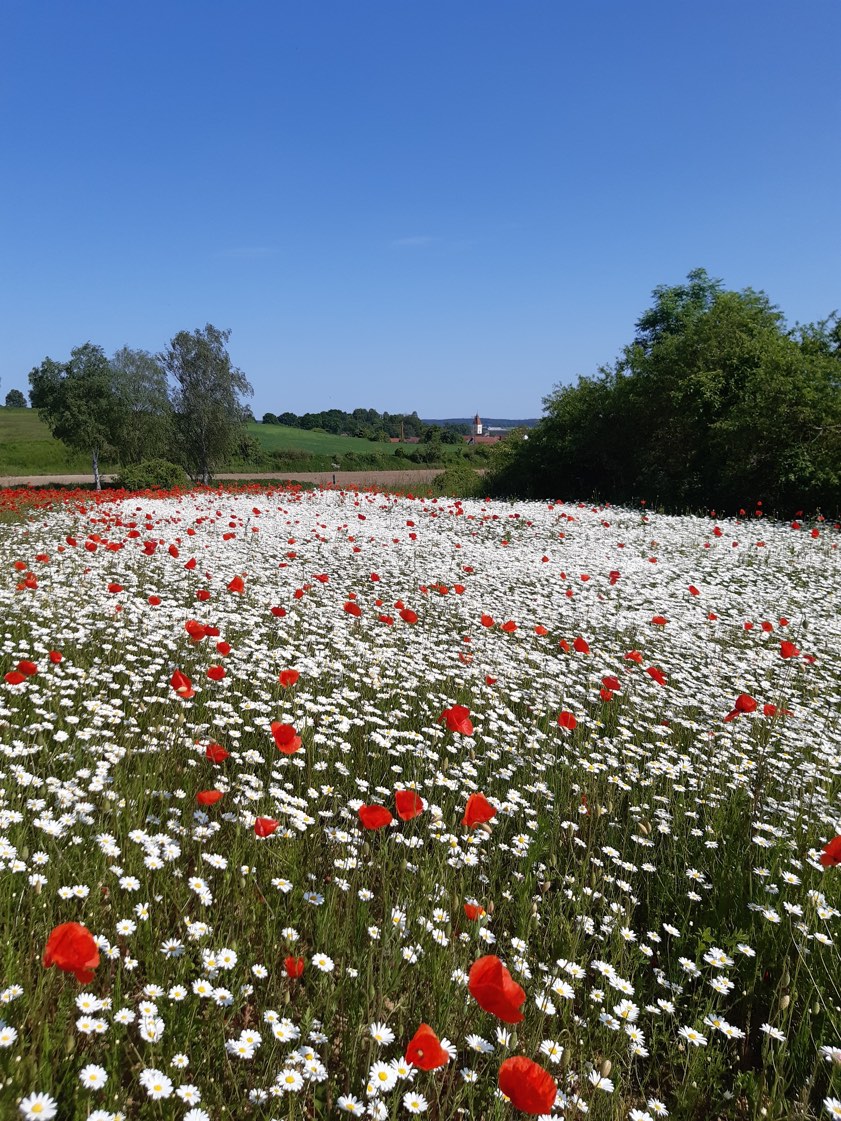 (ty) Und schon geht sie weiter, die Serie von beeindruckenden und interessanten Fotos aus der Region, die uns unsere Leserinnen und Leser nach wie vor übermitteln. Das Motiv, das wir ihnen am heutigen Pfingst-Montag zeigen können, hat uns Karin Utaszewski zukommen lassen. Sie wohnt in Maushof im Gemeinde-Gebiet von Pörnbach, das Bild entstand aber ihren Worten zufolge bei Freinhausen in der Gemeinde Hohenwart. "Mohnbilder gibt es ja öfter, aber Margeriten leuchten mit ihren weißen Blüten noch mehr", schreibt sie uns. Oben sehen Sie einen Ausschnitt, unten das komplette Motiv.
