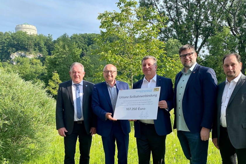 (ty) Raus aus dem Zug am Bahnhof von Saal an der Donau, rein in die Seilbahn und damit über den Fluss sowie bis nach Kelheim – das ist die Idee hinter dem Projekt "Smart Urban Connection". Der Landkreis Kelheim will untersuchen, ob und wie eine Seilbahn die Anbindung des Bahnhofs von Saal an der Donau an die Stadt Kelheim verbessern kann. Das bayerische Verkehrs-Ministerium unterstützt diese Machbarkeit-Studie nach eigenem Bekunden mit insgesamt 107 250 Euro. Verkehrs-Minister Christian Bernreiter (CSU) hat jetzt in der Kreisstadt den Förder-Bescheid übergeben.