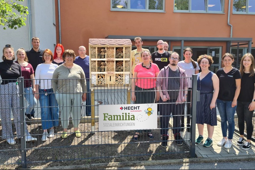 (ty) Die Klienten und Betreuer der "Familia"-Sozial-Einrichtungen in Pfaffenhofen haben im Rahmen eines "We care"-Projekts" der hiesigen Firma Hecht tatkräftige Unterstützung bei der gemeinsamen Errichtung eines Insekten-Hotels erhalten. Dazu waren drei Mitarbeiterinnen und zwei Mitarbeiter des Unternehmens angerückt. "Nach intensiver Recherche und reiflicher Überlegung, was ein sinnvolles Projekt in der aktuellen Zeit wäre, fiel die Wahl auf ein Insekten-Hotel", berichtet "Familia"-Chefin Julia Menzel. Das Insekten-Domizil sei nach einer Vorstellungsrunde sowie vielen handwerklichen Vorbereitungen schließlich direkt vor der Einrichtung an der Hohenwarter Straße errichtet worden (Foto oben).