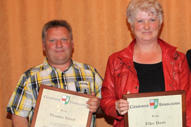 Dankurkunden und Geschenke für ihre zwölfjährige Mitgliedschaft im Kommunalparlament von Ernsgaden erhielten die beiden ausgeschiedenen Mitglieder des Gemeinderats, Elke Daut und Thomas Kund. Bürgermeister Huber würdigte deren kommunalpolitische Tätigkeit und ihr Wirken. Daut sei ein Vorbild an Loyalität und Hilfsbereitschaft gewesen und habe sich neben ihrer Arbeit im Gemeinderat besonders um die Belange des Schulverbands Ernsgaden gekümmert, in dessen Verbandsversammlung sie zwölf Jahre Mitglied war. Thomas Kund war nach den Worten des Gemeindechefs ein „Aktivposten“ im Gemeinderat und habe seinen technischen Sachverstand und seine langjährige Erfahrung bei Entscheidungen über gemeindliche Liegenschaften, zum Kanal und zur Wasserversorgung beigetragen.