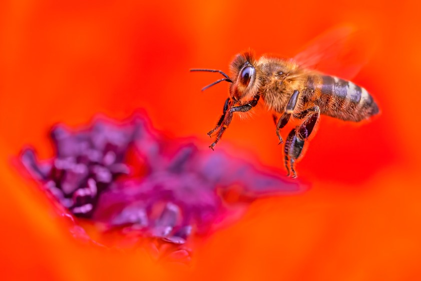 "Modere Kameras bieten heute Möglichkeiten, um Aufnahmen zu machen, welche vor einigen Jahren so noch nicht machbar gewesen wären", berichtet Rainer Schaaf. "Zum Beispiel ein Augen-Autofokus, welcher es ermöglicht, Tiere – in diesem Fall eine Biene – im Flug relativ einfach und scharf aufzunehmen." Das hier gezeigte Bild entstand seinen Worten zufolge vor einigen Tagen in den Morgenstunden, noch vor Sonnenaufgang, in seinem Garten. "Die Mohnblumen ziehen die Bienen, Wespen und Hummeln magisch an", weiß Schaaf.