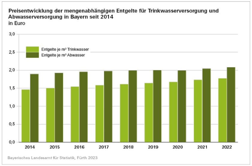 Nach Mitteilung des Landesamts für Statistik lag in Bayern der Preis pro Kubikmeter im Frischwasser-Bezug im Jahr 2019 bei 1,65 Euro für das Wasser-Entgelt und bei 2,01 Euro für das Abwasser-Entgelt. Der Mischpreis, also mengenabhängiges Wasser- und Abwasser-Entgelt summiert, lag somit bei 3,66 Euro. Im Jahr 2022 kostete der Kubikmeter Frischwasser-Bezug bei den Wasser-Entgelten 1,78 Euro (plus 7,9 Prozent) und bei den Abwasser-Entgelten 2,09 Euro (plus 4,0 Prozent). Der Mischpreis hat sich damit um durchschnittlich 21 Cent auf 3,87 Euro pro Kubikmeter oder um 5,7 Prozent erhöht. Die Preisspanne reichte beim Mischpreis im Jahr 2022 von 54 Cent bis zu 9,13 Euro pro Kubikmeter. Dies ist auf unterschiedliche geografische, topografische und infrastrukturelle Verhältnisse der einzelnen Tarifgebiete zurückzuführen.