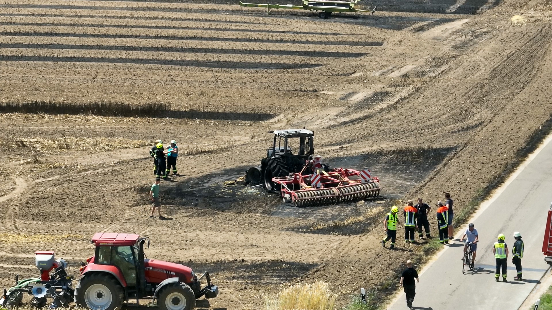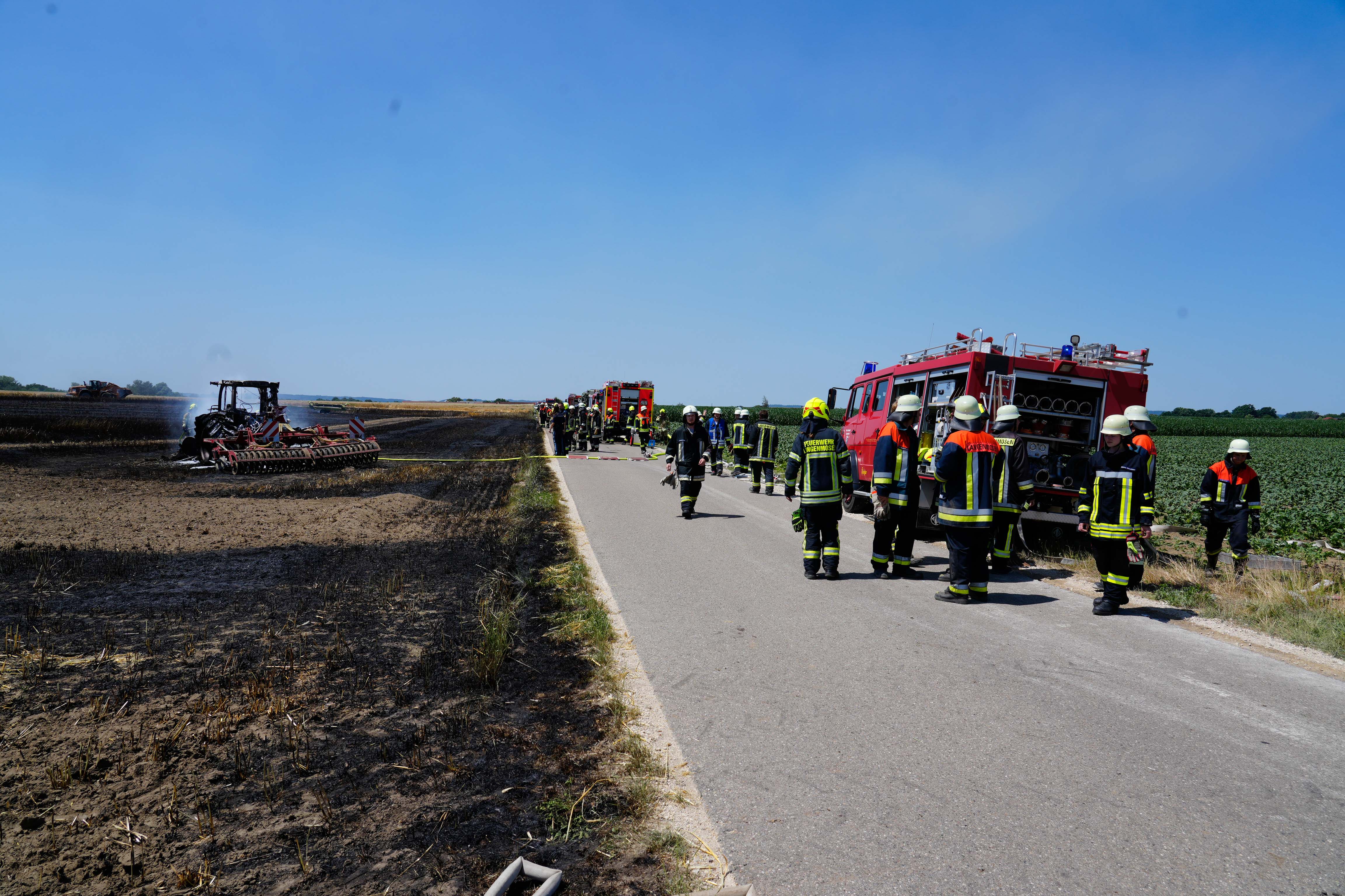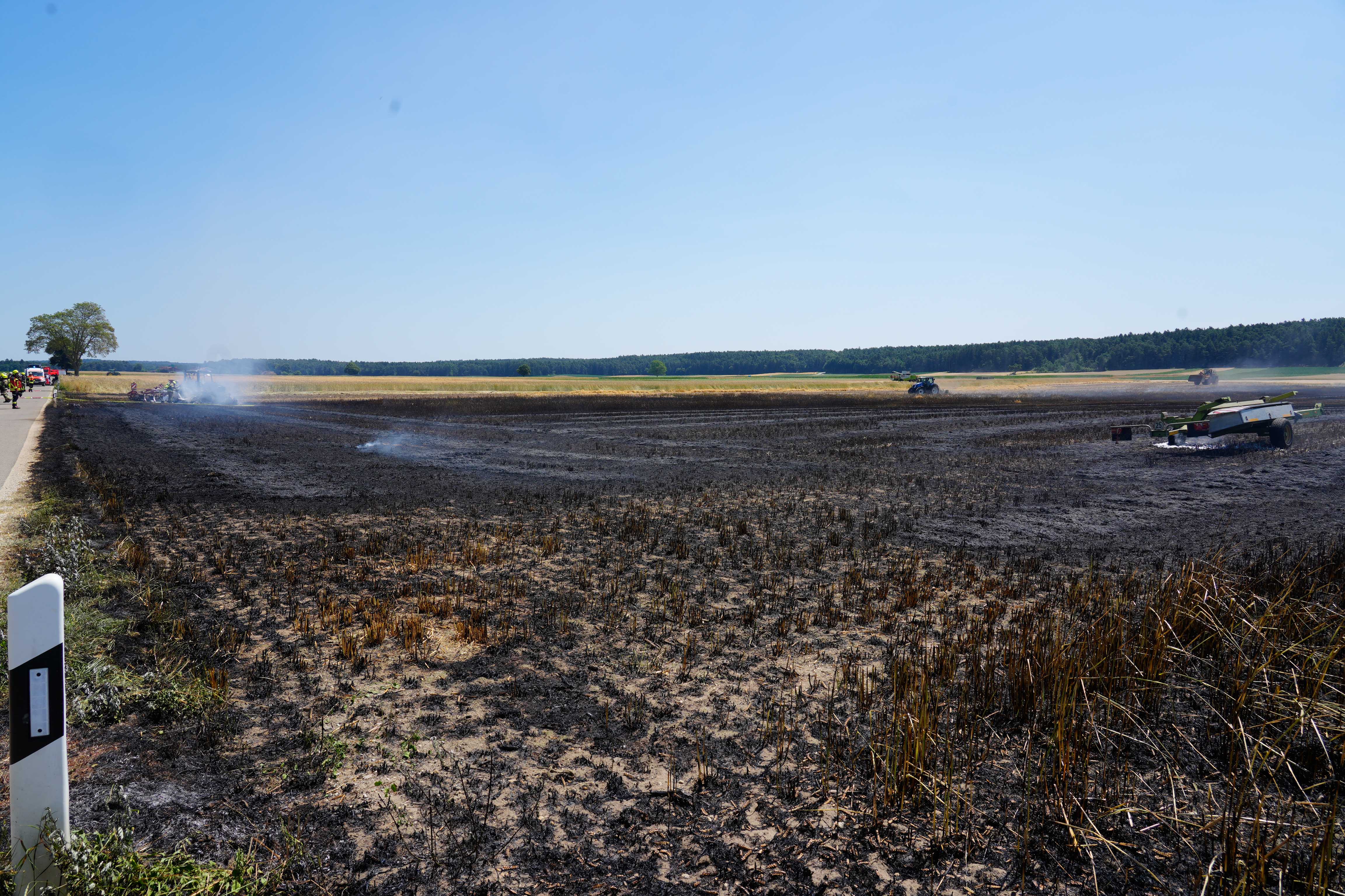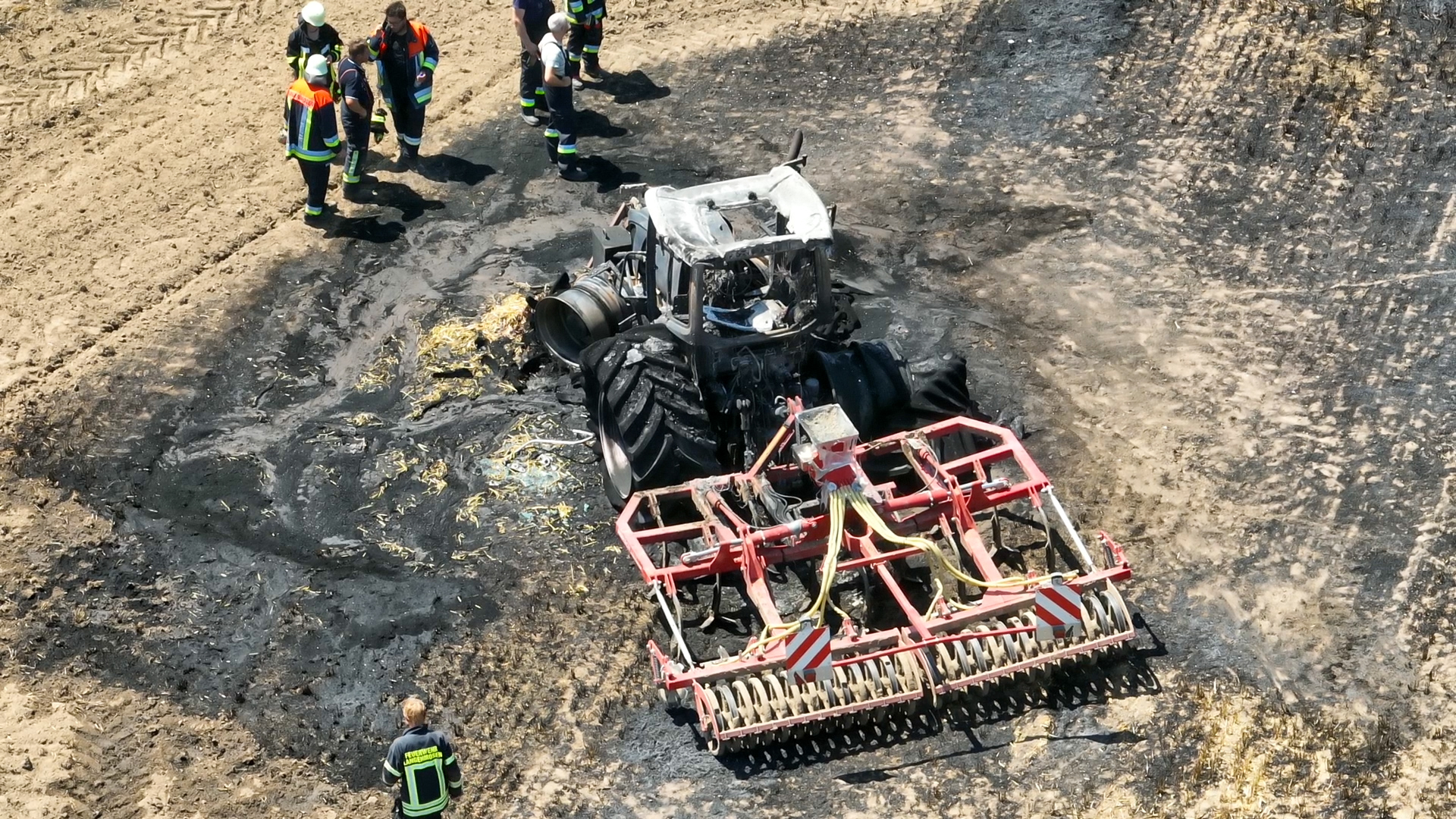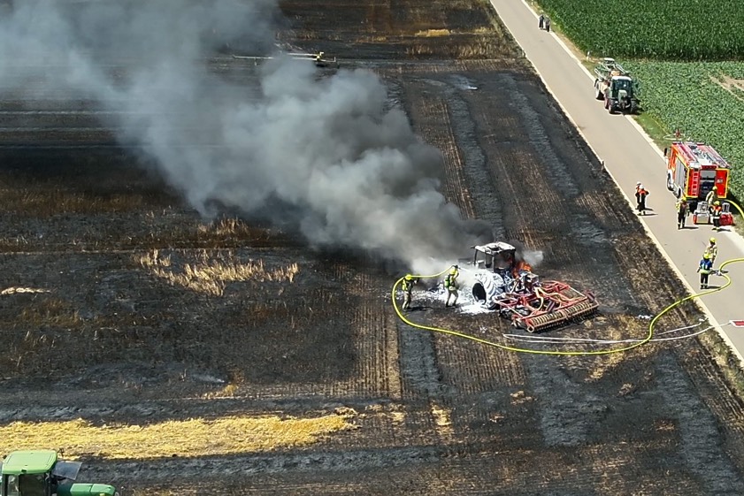Die Einsatzkräfte waren heute gegen 12.20 Uhr alarmiert worden. Als die Feuerwehrleute am Unglücksort eingetroffen seien, habe sich das Feuer bereits auf eine Fläche von ungefähr drei Hektar erstreckt. Ebenfalls zur Hilfe geeilten Traktor-Fahrern sei es schon gelungen gewesen, den Brand einzudämmen. Durch das brennende Feld sei allerdings auch einer der Traktoren in Flammen gefangen und schließlich ausgebrannt. Der Fahrer dieser Zugmaschine habe die Brand-Verletzungen erlitten. Der an diesem Traktor entstandene Sachschaden wurde von den Streifenbeamten in einer Größenordnung von 200 000 Euro beziffert.