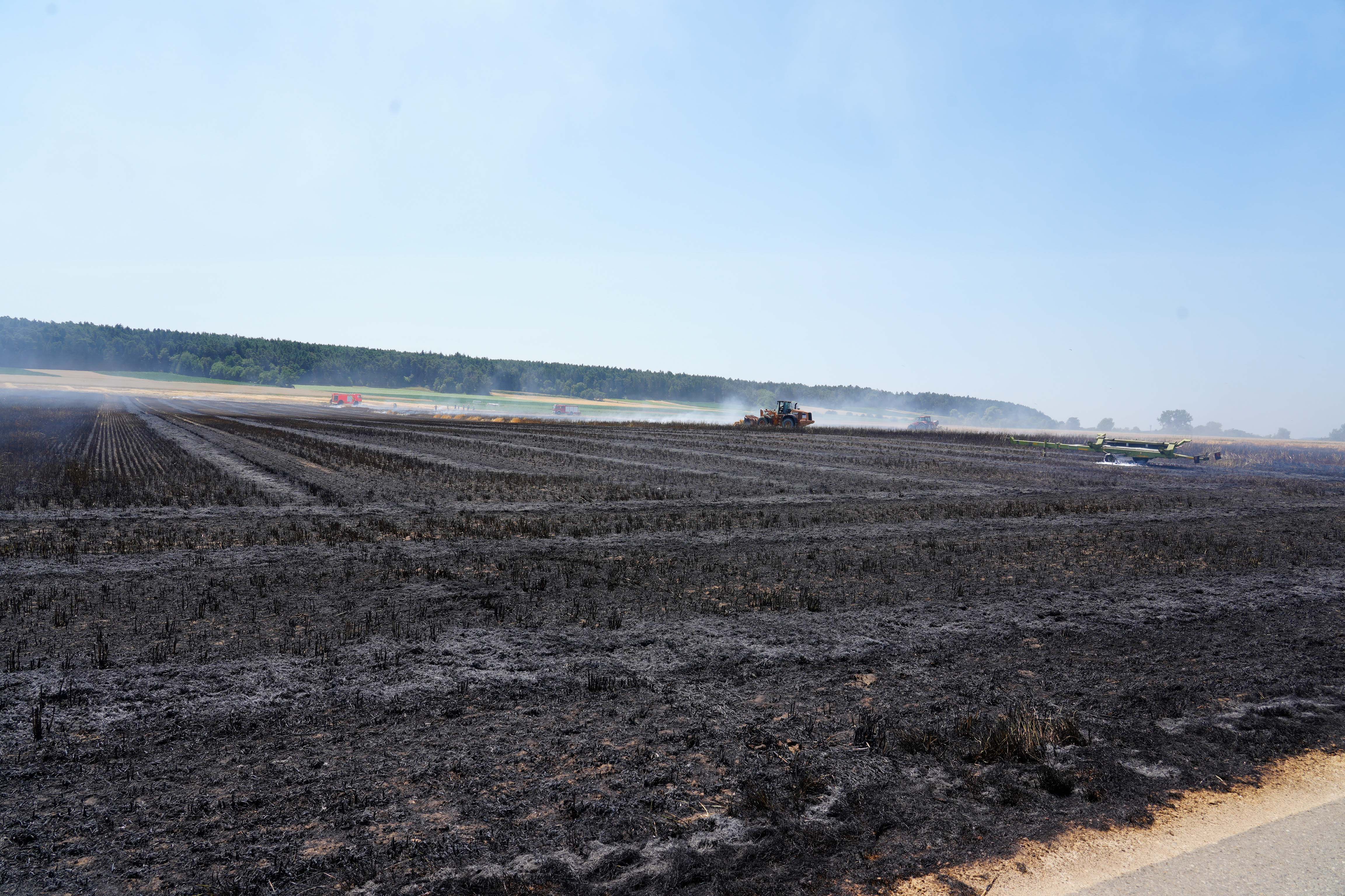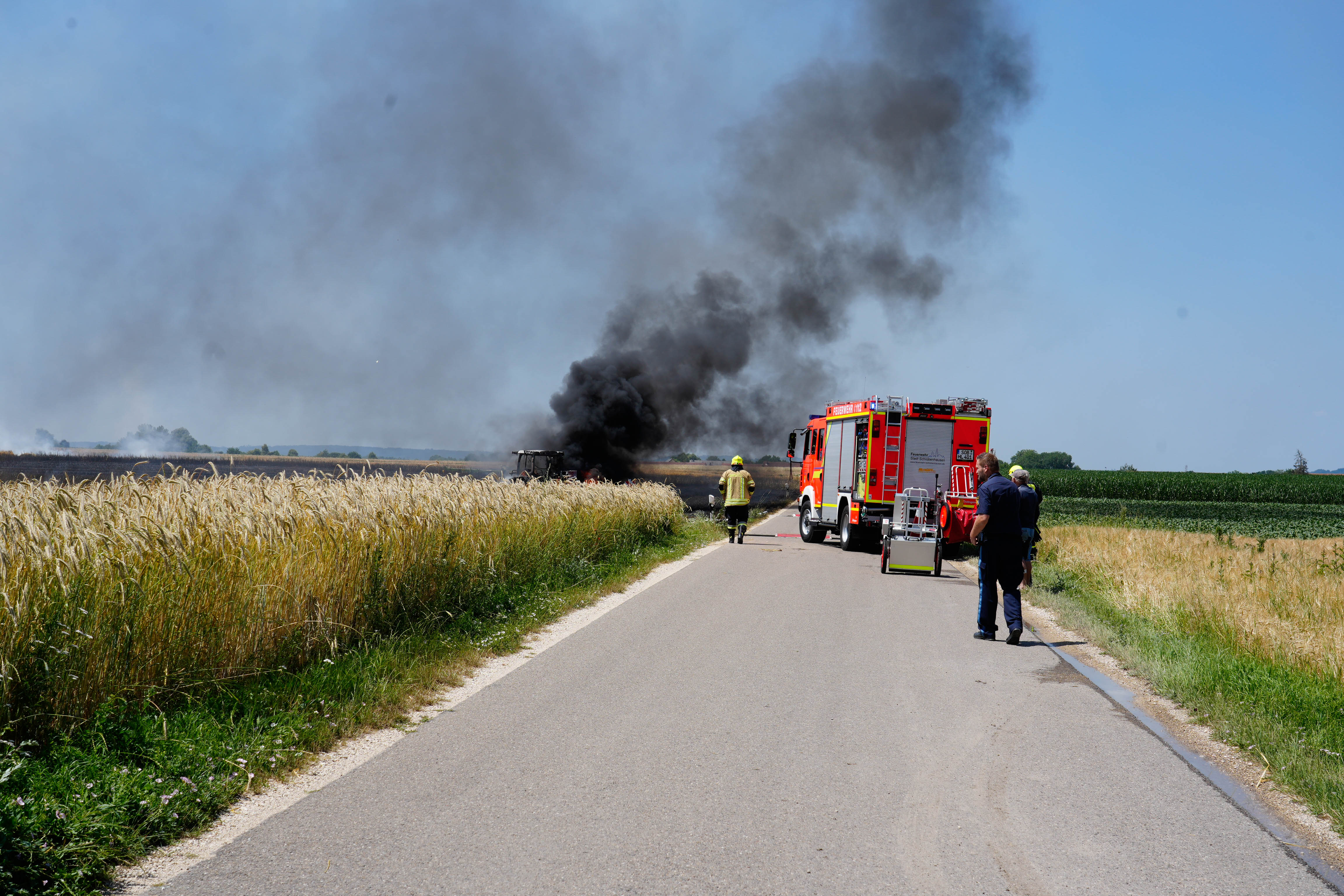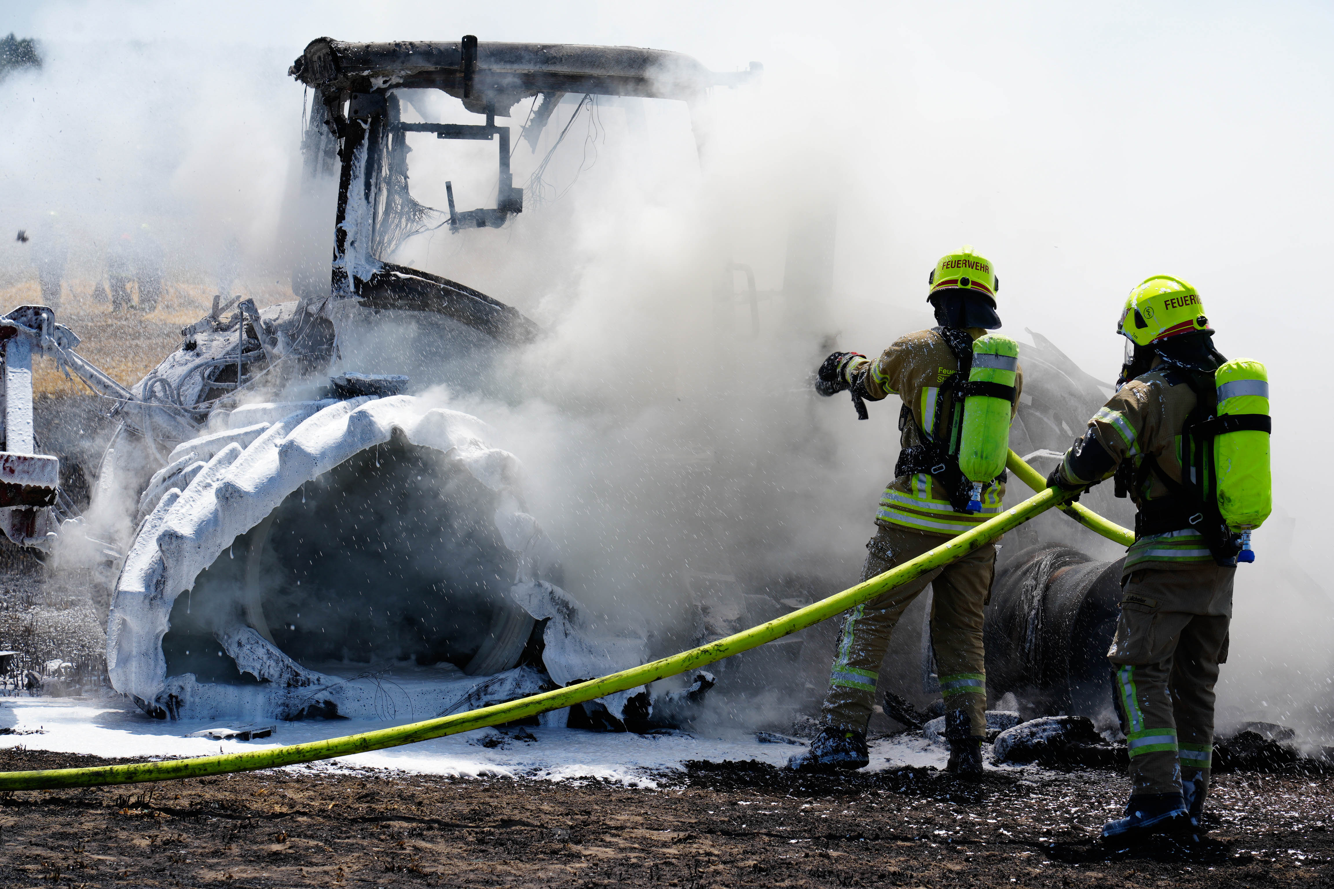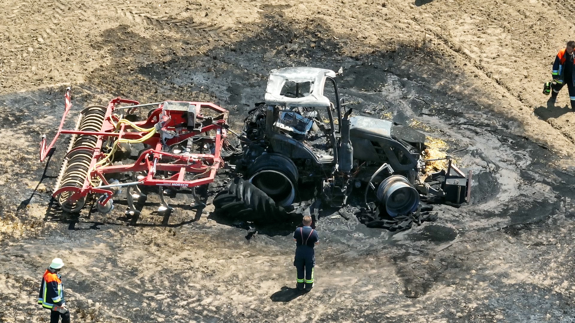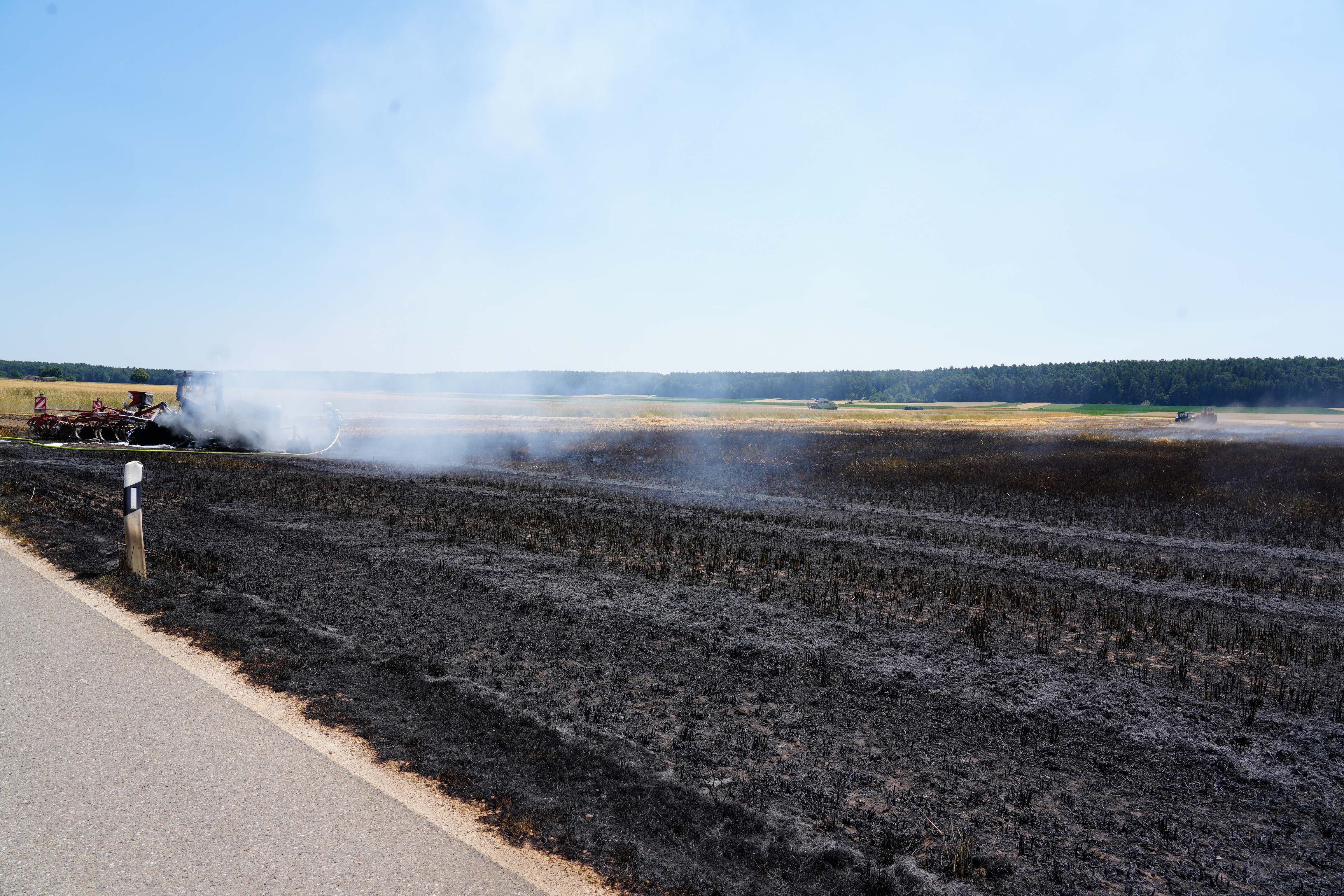 Die Einsatzkräfte waren heute gegen 12.20 Uhr alarmiert worden. Als die Feuerwehrleute am Unglücksort eingetroffen seien, habe sich das Feuer bereits auf eine Fläche von ungefähr drei Hektar erstreckt. Ebenfalls zur Hilfe geeilten Traktor-Fahrern sei es schon gelungen gewesen, den Brand einzudämmen. Durch das brennende Feld sei allerdings auch einer der Traktoren in Flammen gefangen und schließlich ausgebrannt. Der Fahrer dieser Zugmaschine habe die Brand-Verletzungen erlitten. Der an diesem Traktor entstandene Sachschaden wurde von den Streifenbeamten in einer Größenordnung von 200 000 Euro beziffert.