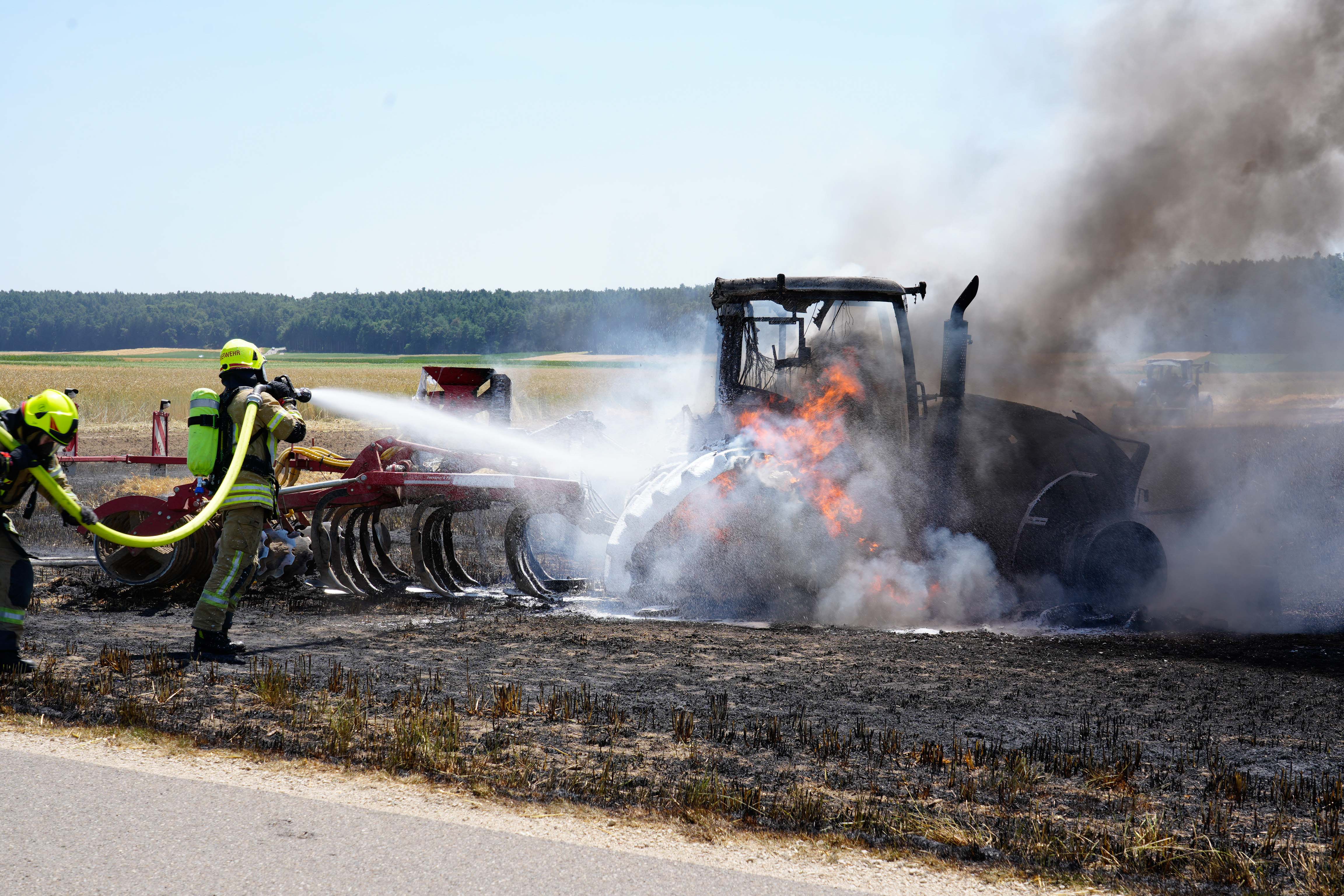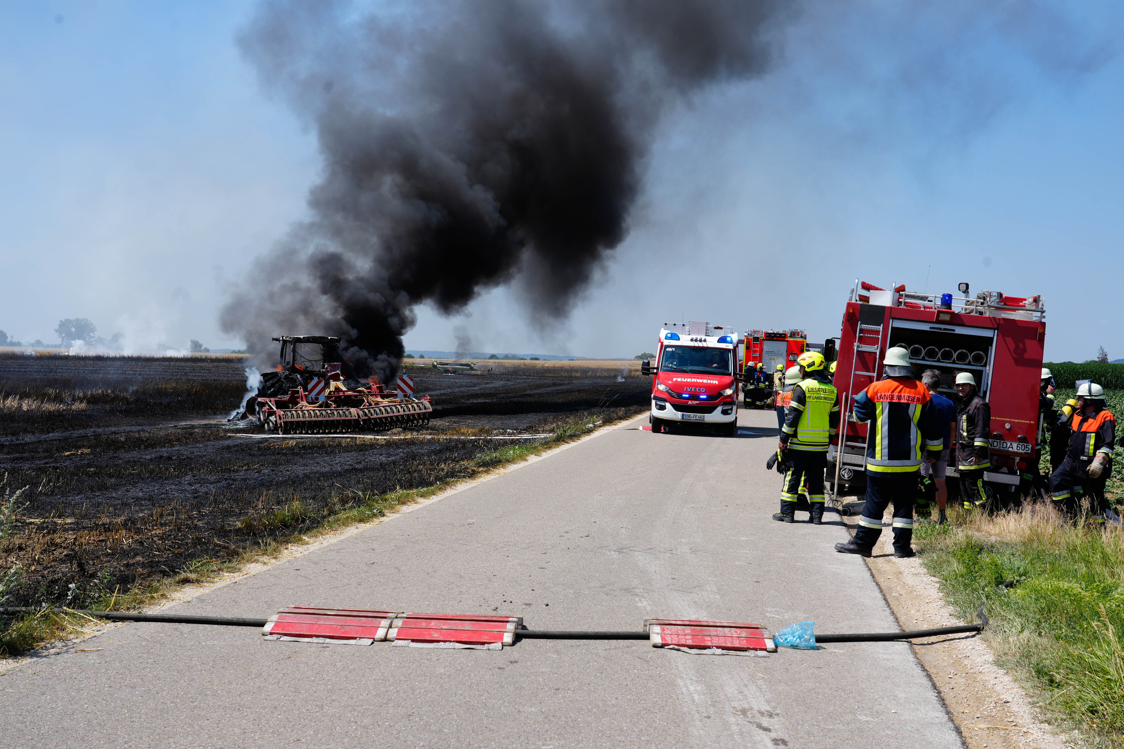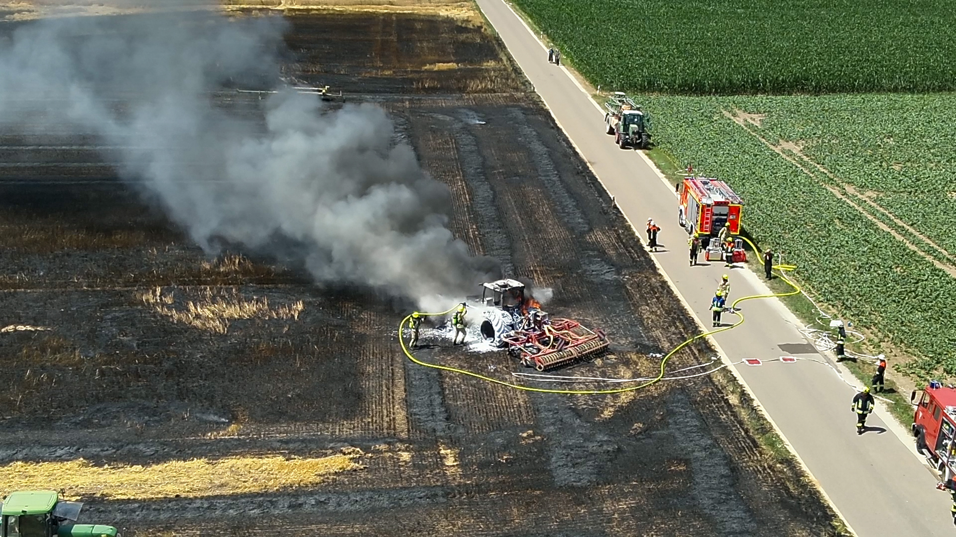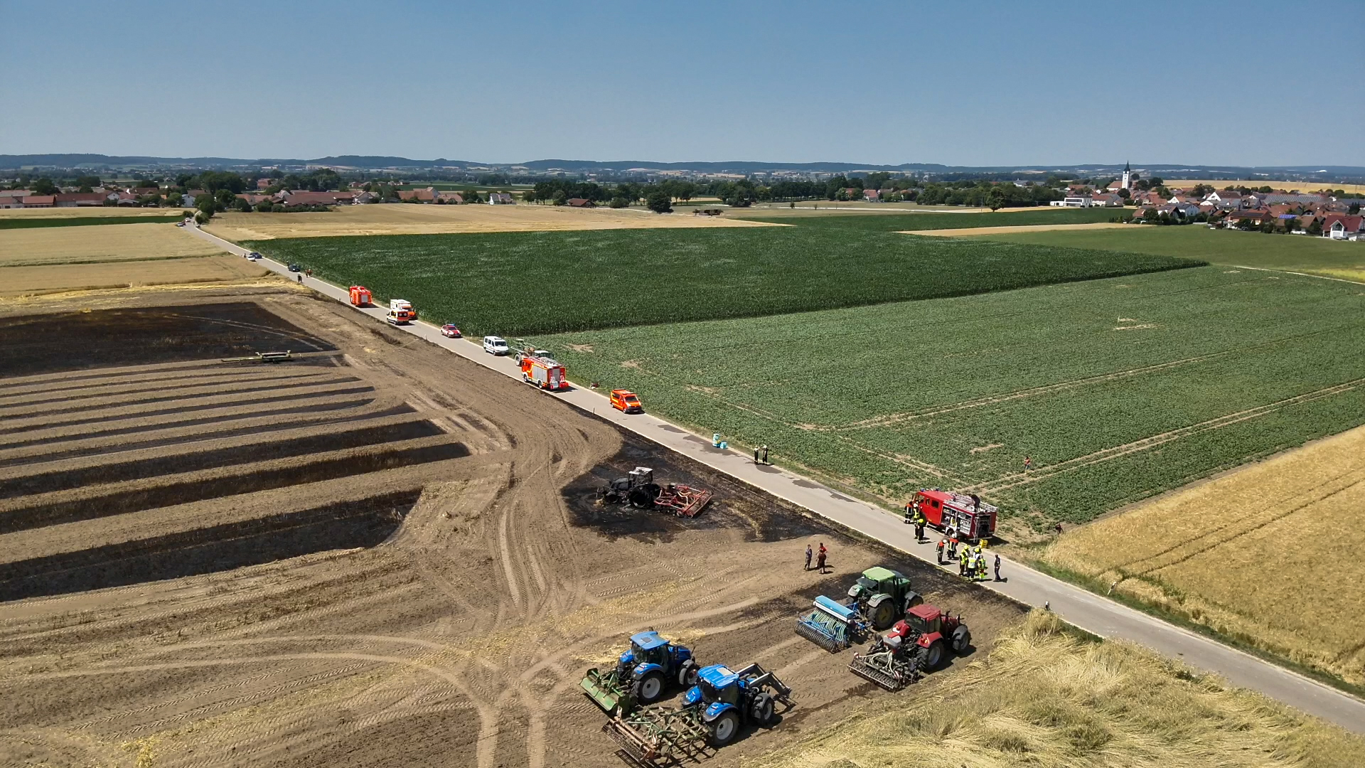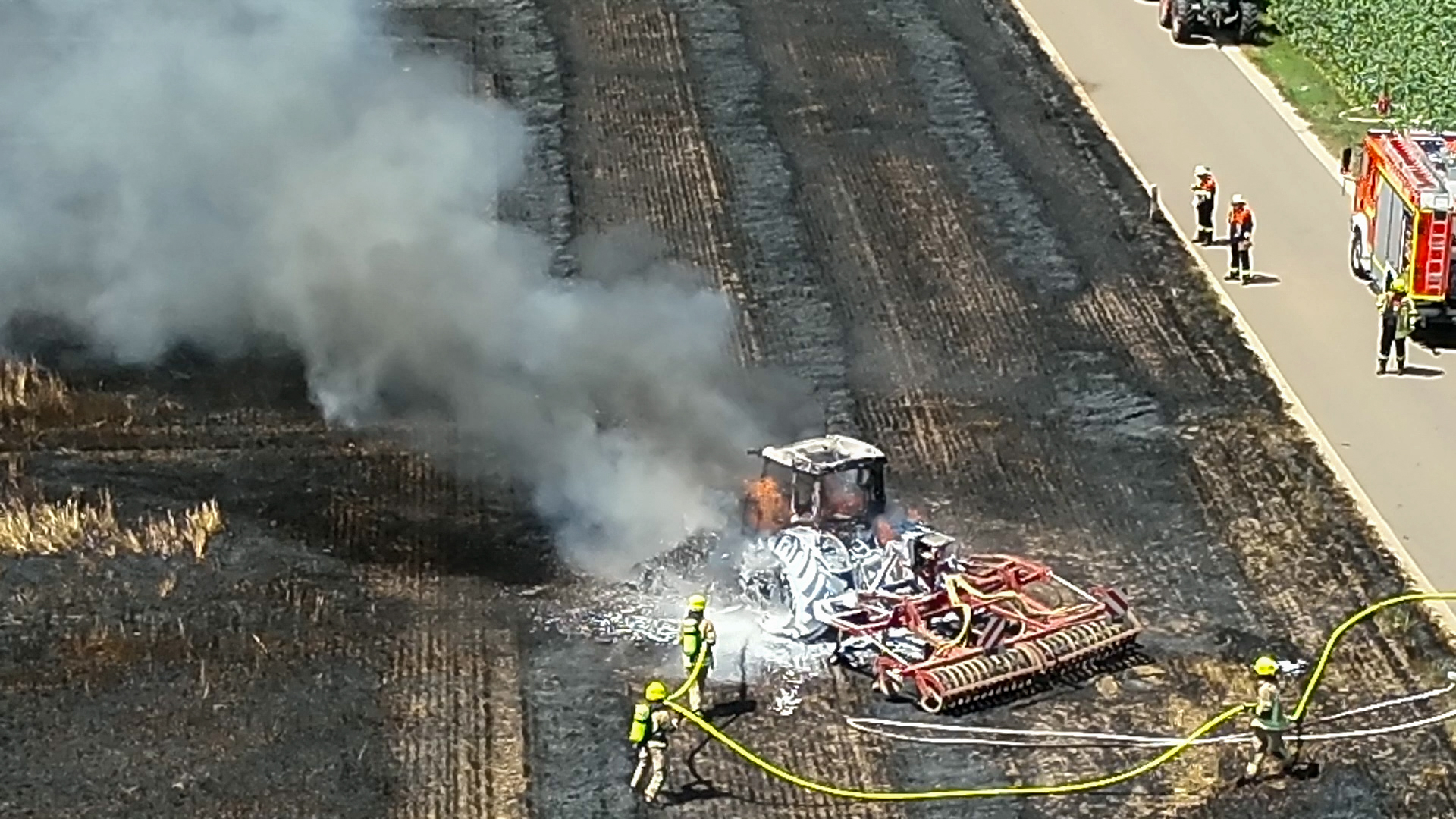 Die Einsatzkräfte waren heute gegen 12.20 Uhr alarmiert worden. Als die Feuerwehrleute am Unglücksort eingetroffen seien, habe sich das Feuer bereits auf eine Fläche von ungefähr drei Hektar erstreckt. Ebenfalls zur Hilfe geeilten Traktor-Fahrern sei es schon gelungen gewesen, den Brand einzudämmen. Durch das brennende Feld sei allerdings auch einer der Traktoren in Flammen gefangen und schließlich ausgebrannt. Der Fahrer dieser Zugmaschine habe die Brand-Verletzungen erlitten. Der an diesem Traktor entstandene Sachschaden wurde von den Streifenbeamten in einer Größenordnung von 200 000 Euro beziffert.