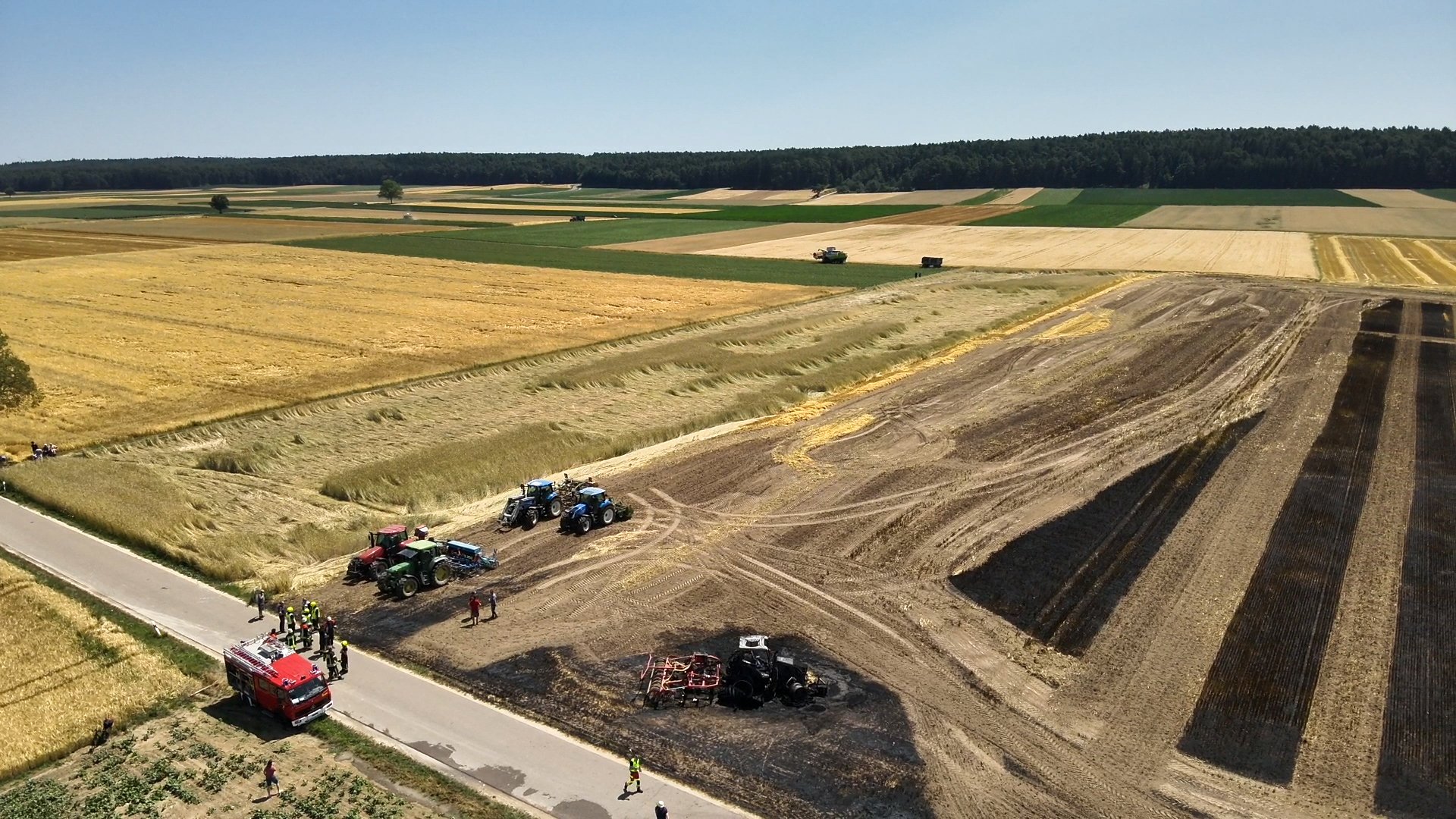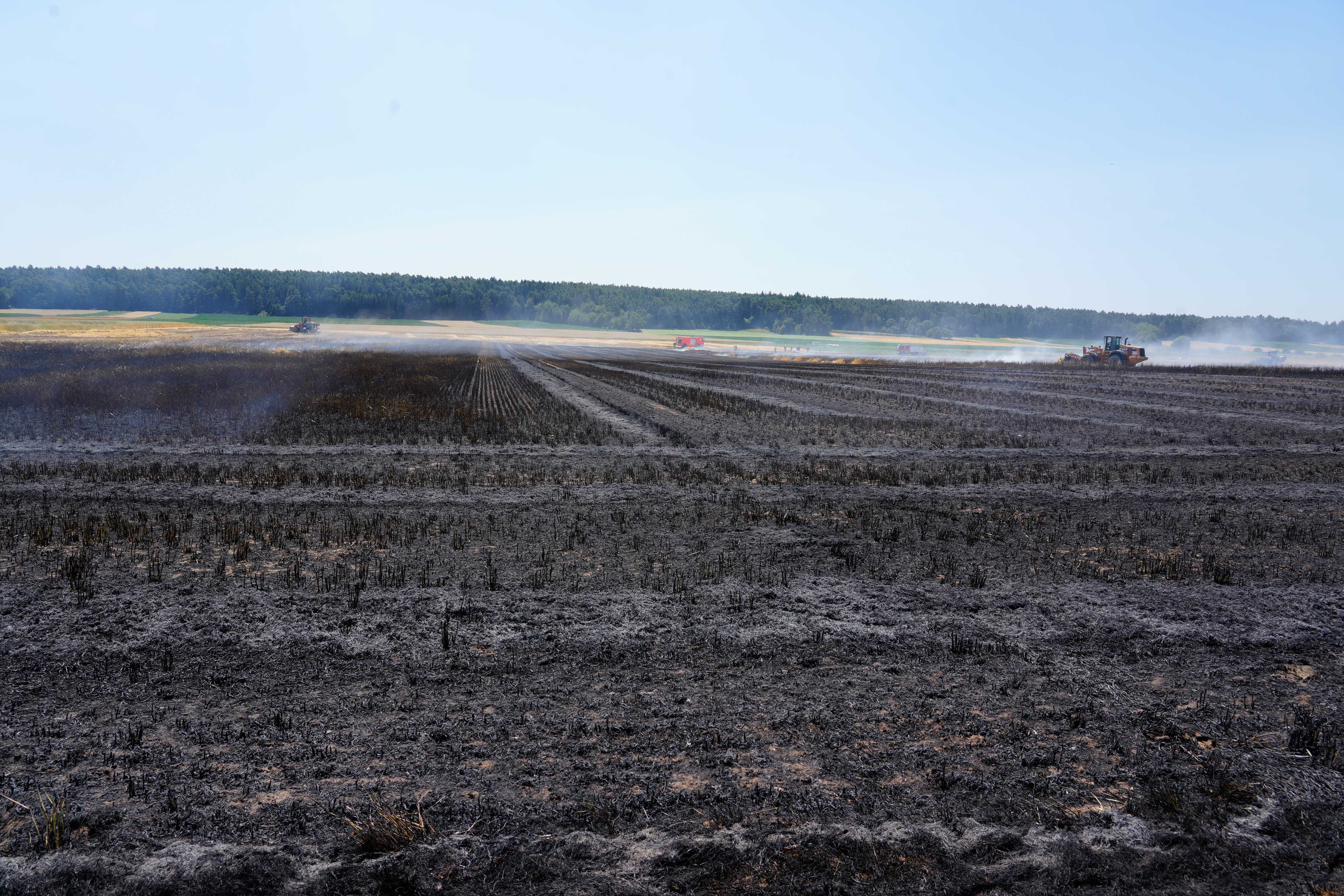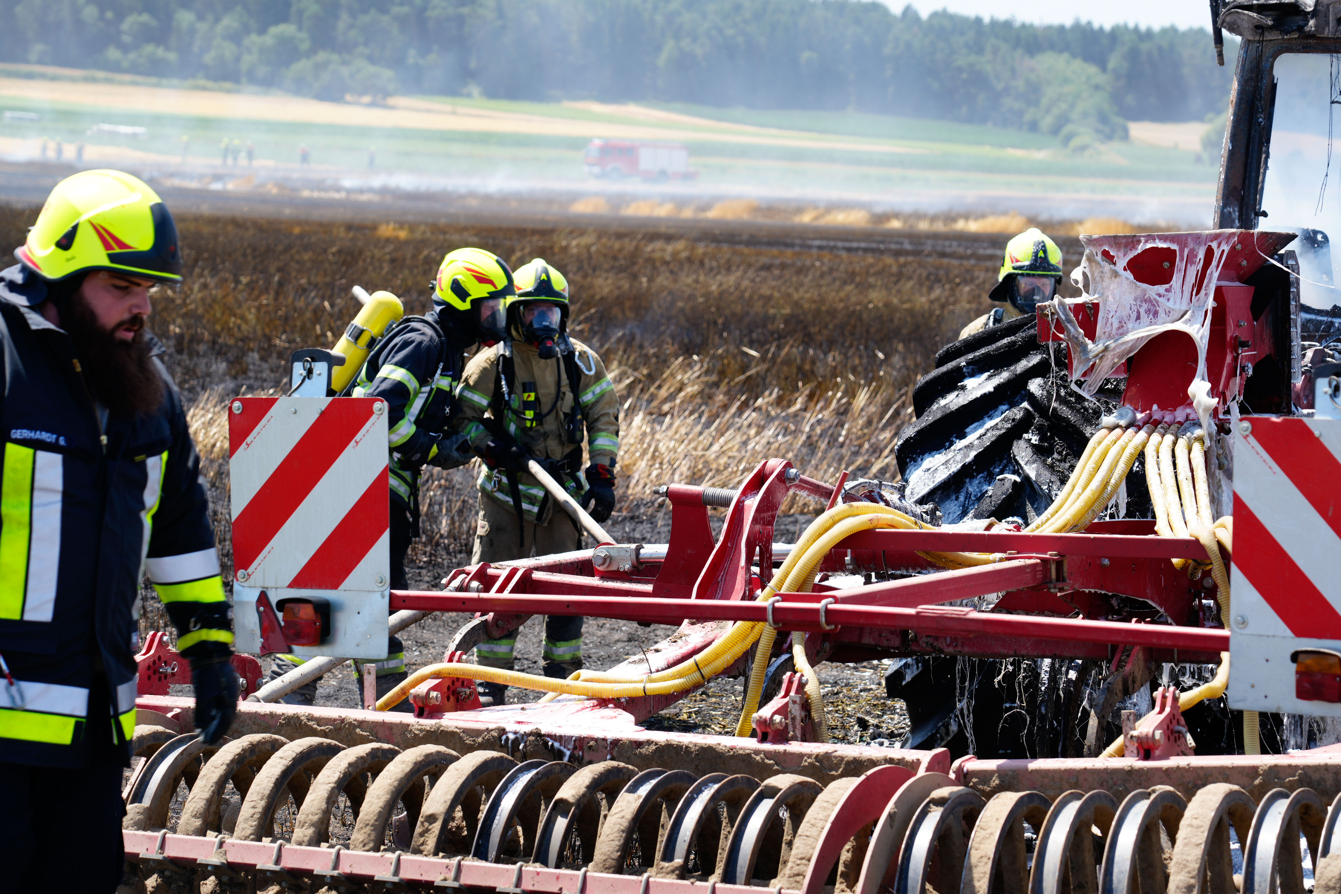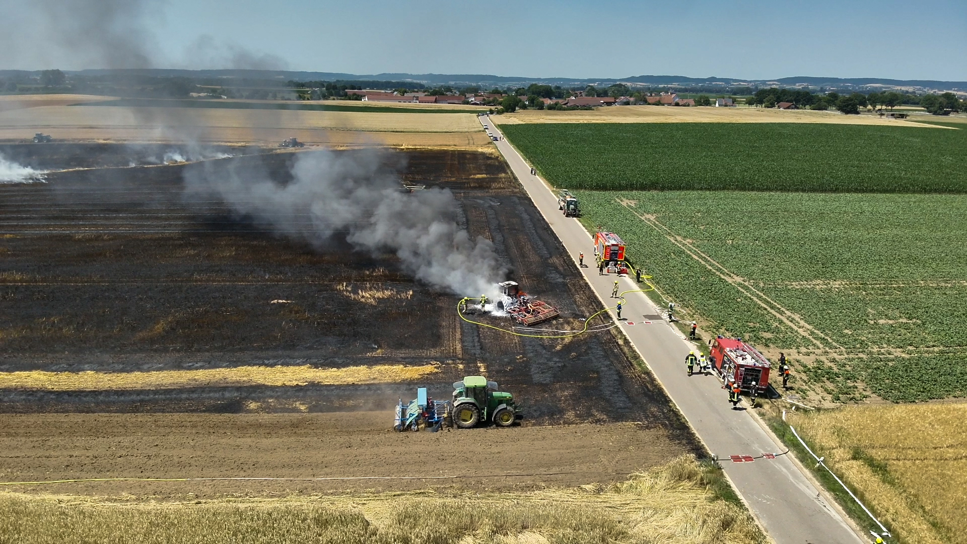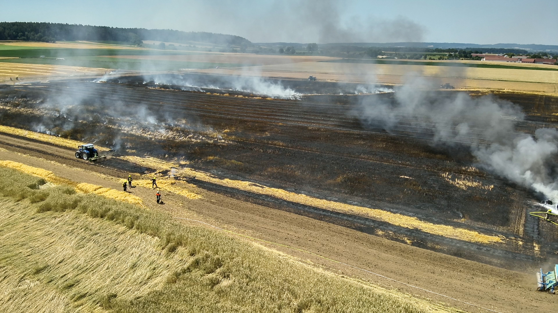Die Einsatzkräfte waren heute gegen 12.20 Uhr alarmiert worden. Als die Feuerwehrleute am Unglücksort eingetroffen seien, habe sich das Feuer bereits auf eine Fläche von ungefähr drei Hektar erstreckt. Ebenfalls zur Hilfe geeilten Traktor-Fahrern sei es schon gelungen gewesen, den Brand einzudämmen. Durch das brennende Feld sei allerdings auch einer der Traktoren in Flammen gefangen und schließlich ausgebrannt. Der Fahrer dieser Zugmaschine habe die Brand-Verletzungen erlitten. Der an diesem Traktor entstandene Sachschaden wurde von den Streifenbeamten in einer Größenordnung von 200 000 Euro beziffert.