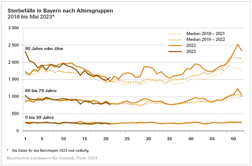 (ty) Wie das Expertenteam des bayerischen Landesamts für Statistik nach Auswertung vorläufiger Daten jetzt mitgeteilt hat, lag die Zahl an verstorbenen Menschen im Freistaat im Mai dieses Jahres mit 11 288 Personen insgesamt auf ähnlichem Niveau wie der Median der Jahre 2019 bis 2022 mit 11 215 Verstorbenen. Bei Personen unter 60 Jahren und der Gruppe der 60-Jährigen bis Unter-80-Jährigen verzeichnete die Behörde im Betrachtungs-Monat einen leichten Rückgang der Sterbefälle um zwei beziehungsweise drei Prozent. Bei den 80-Jährigen und Älteren lagen die Sterbefall-Zahlen dagegen um rund vier Prozent über dem Median der Jahre 2019 bis 2022.