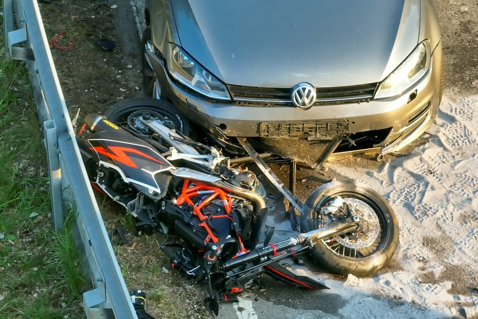 20-Jähriger verlor die Kontrolle über seine Maschine und stürzte, schlitterte auf die Gegenspur und wurde unter einem Pkw eingeklemmt.