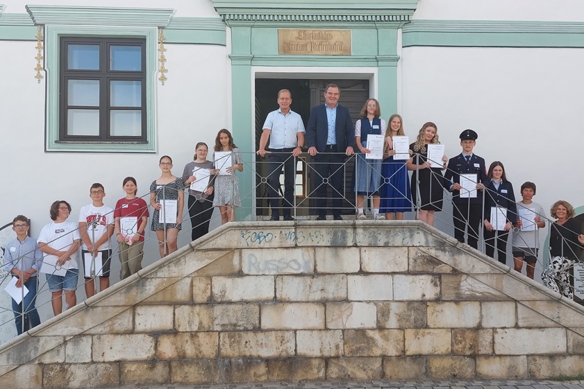 Landrat Albert Gürtner und Bürgermeister Paul überreichten die Ehrenamts-Zeugnisse an die Schülerinnen und Schüler. Das Landkreis-Oberhaupt freute sich sehr darüber, dass das Projekt wieder angeboten werden und sich Jugendliche ehrenamtlich engagieren konnten. "Ihr habt Euren Mitmenschen ein sehr wertvolles Geschenk gemacht, indem ihr Ihnen Eure Zeit geschenkt habt", so Gürtner an die Adresse der jungen Leute. "Man ist nie zu alt, um etwas Neues zu beginnen, aber auch nie zu jung, sich ehrenamtlich zu engagieren", unterstrich er: "Ihr habt für Eure Einsätze für unsere Gesellschaft ganz besonderen Respekt und Wertschätzung verdient."