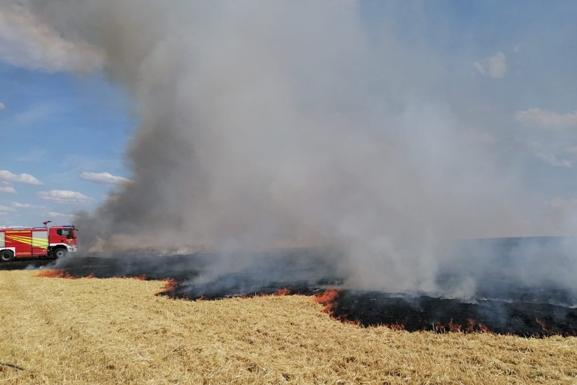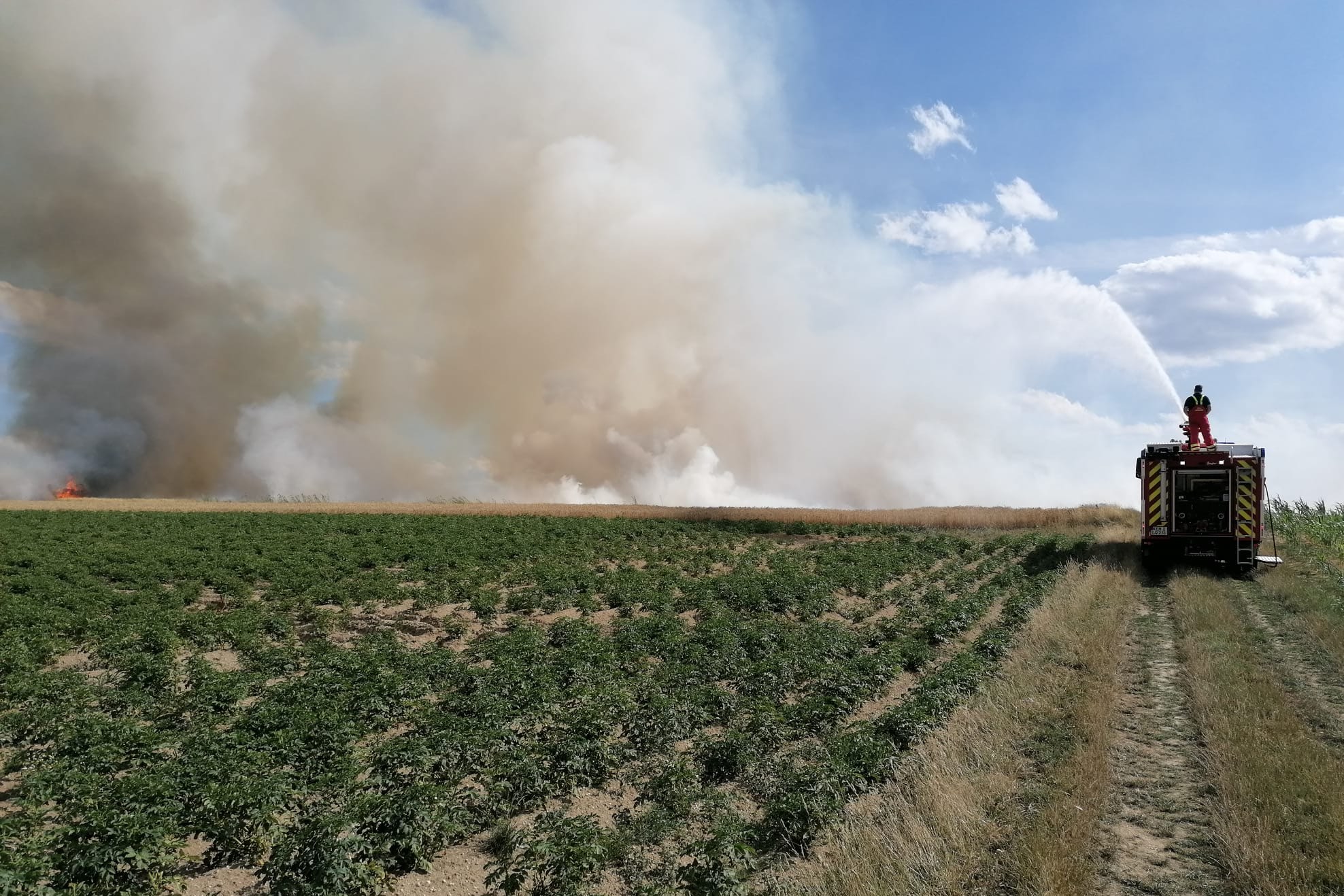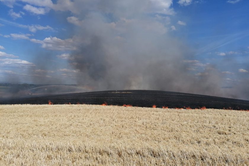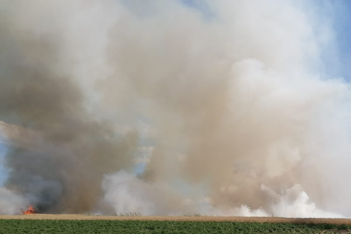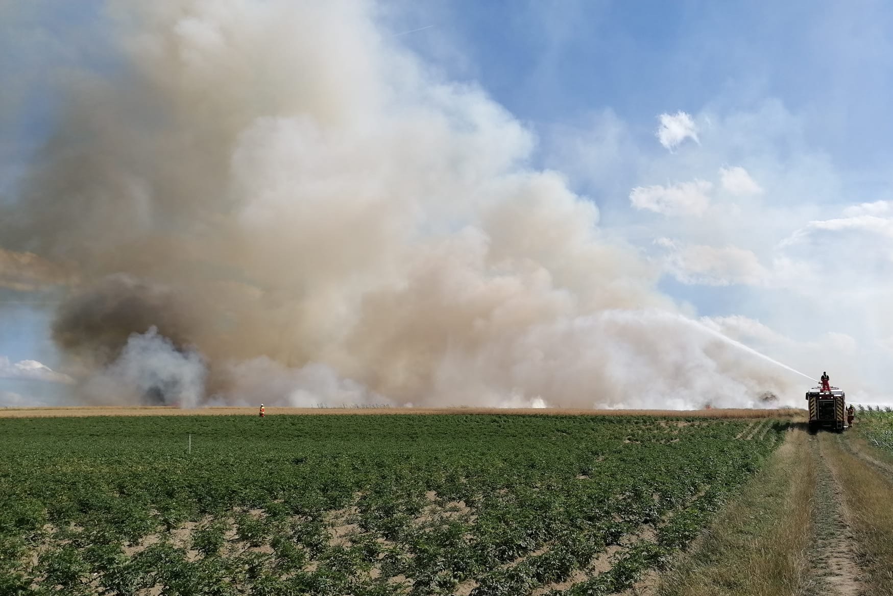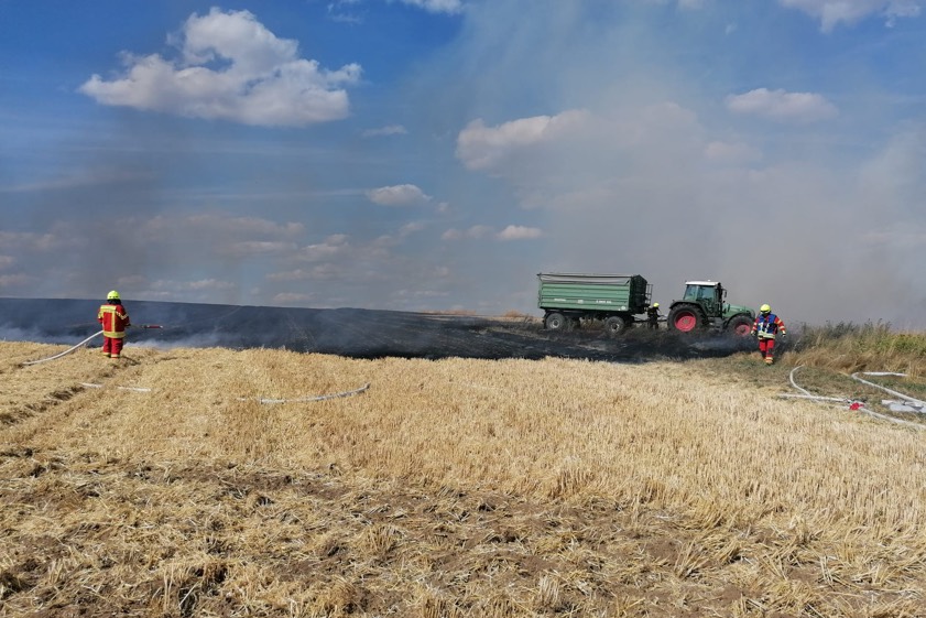 Offenbar löste ein Mähdrescher das Feuer aus, die Flammen breiteten sich rasch aus. Landwirtschaftliches Gespann wurde Raub der Flammen.