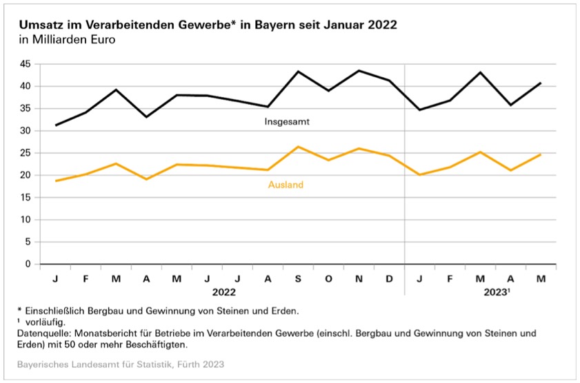 (ty) Im Mai hat das verarbeitende Gewerbe im Freistaat ein Umsatz-Plus von nominal 7,3 Prozent (auf rund 40,8 Milliarden Euro) gegenüber dem entsprechenden Vorjahres-Zeitraum verbucht. Das verarbeitende Gewerbe, bezogen auf Betriebe mit 50 oder mehr Beschäftigten, umfasst dabei auch immer den Bergbau und die Gewinnung von Steinen und Erden. Wie das bayerische Landesamts für Statistik weiter mitteilt, entfielen von dem Gesamt-Umsatz rund 24,7 Milliarden Euro auf Umsätze mit dem Ausland (plus 10,0 Prozent) und darunter rund 7,7 Milliarden Euro auf Umsätze mit den Ländern der Euro-Zone (plus 7,9 Prozent). Die Anteile der Auslands-Umsätze und der Umsätze mit den Euro-Zonen-Ländern am Gesamt-Umsatz betrugen 60,5 beziehungsweise 19,0 Prozent.
