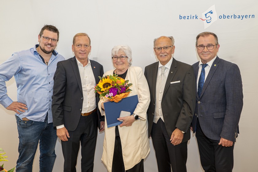 Von links: Bezirksrat Josef Robin, der Geisenfelder Bürgermeister Paul Weber, die geehrte Henriette Staudter, der oberbayerische Bezirkstags-Präsident Josef Mederer und der Pfaffenhofener Vize-Landrat Karl Huber.