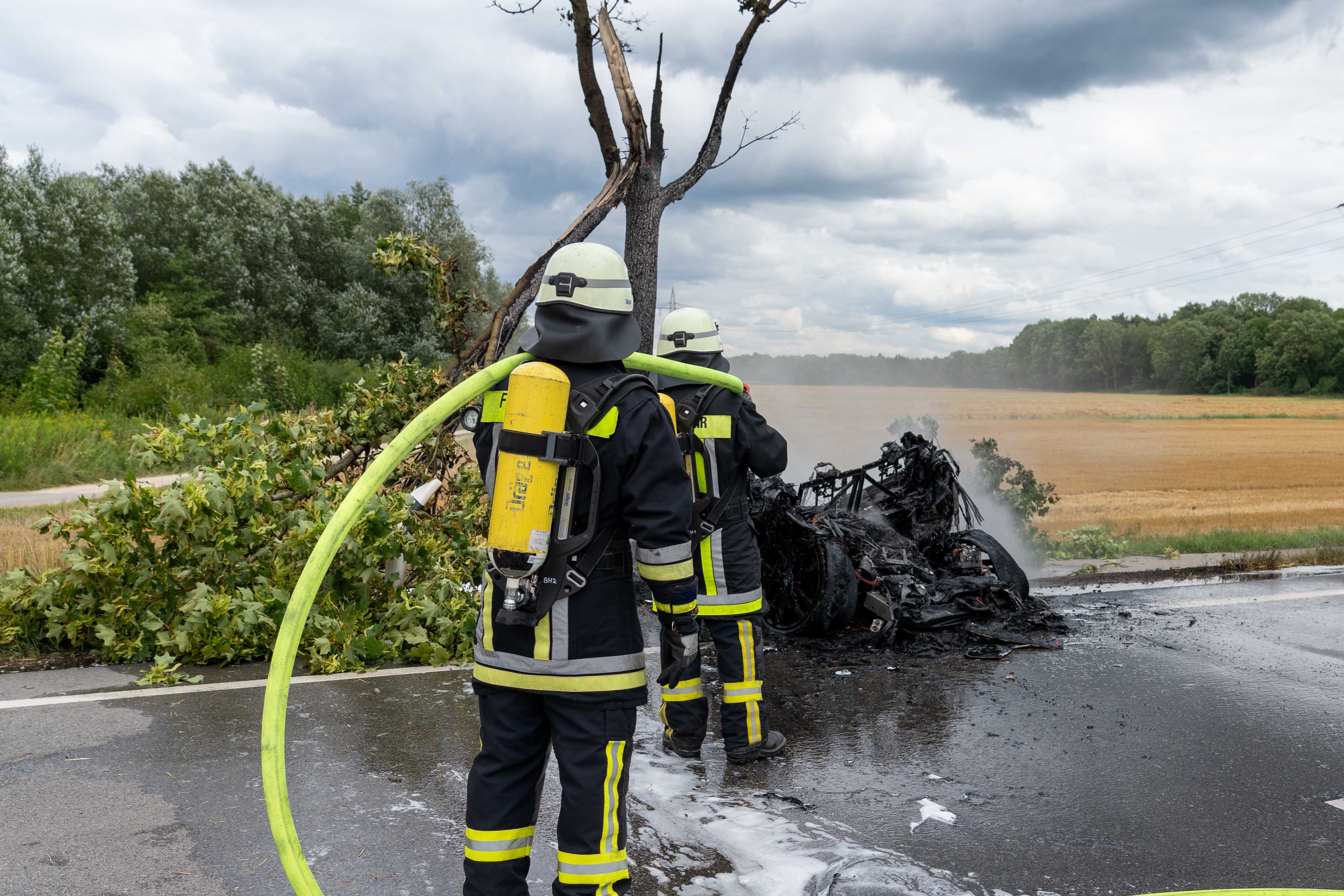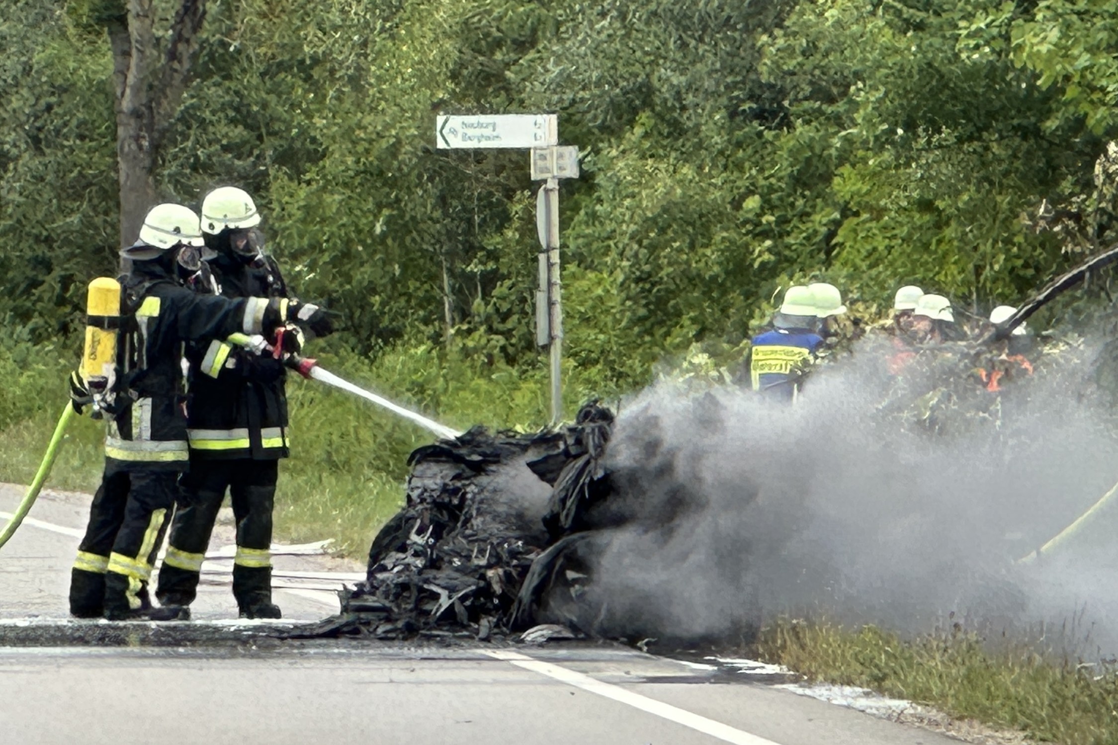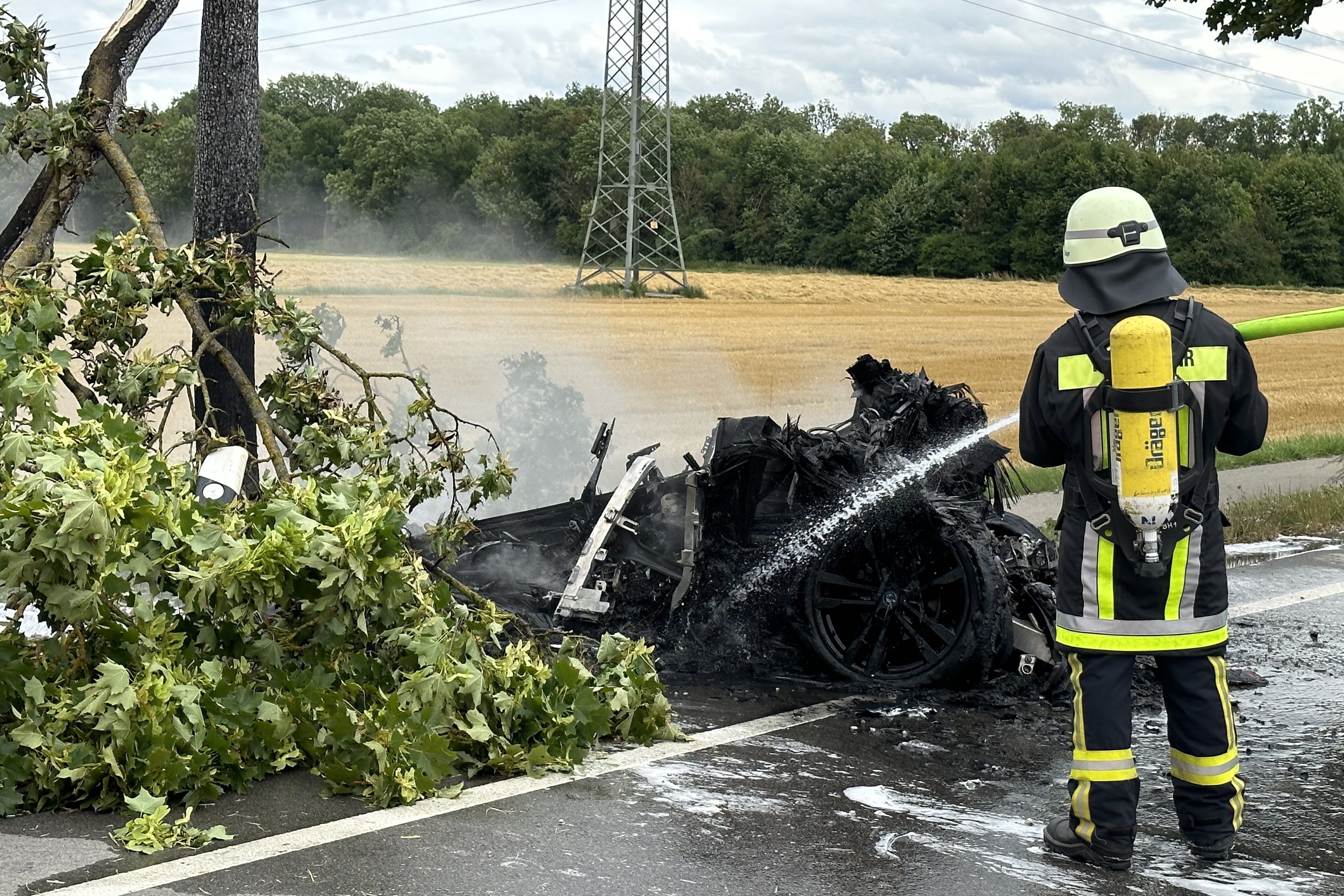 Schwerer Unfall bei Bergheim. Ersthelfer konnten den bewusstlosen Fahrer noch retten, ehe der Wagen zum Raub der Flammen wurde.