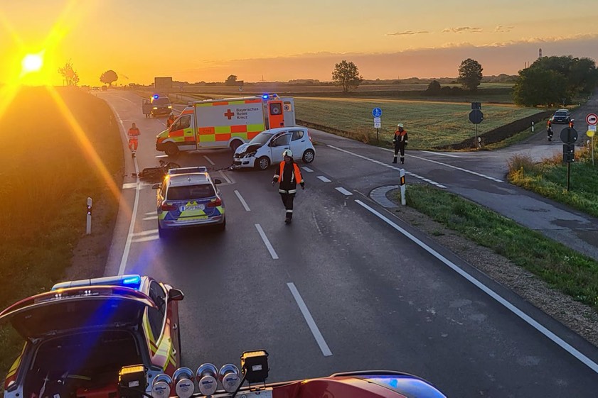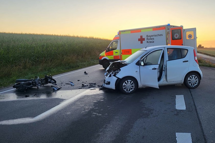 Unfall auf der Staatsstraße zwischen Neuburg und Bergheim, weil Pkw-Lenkerin (55) beim Links-Abbiegen das Zweirad nicht bemerkt hatte.