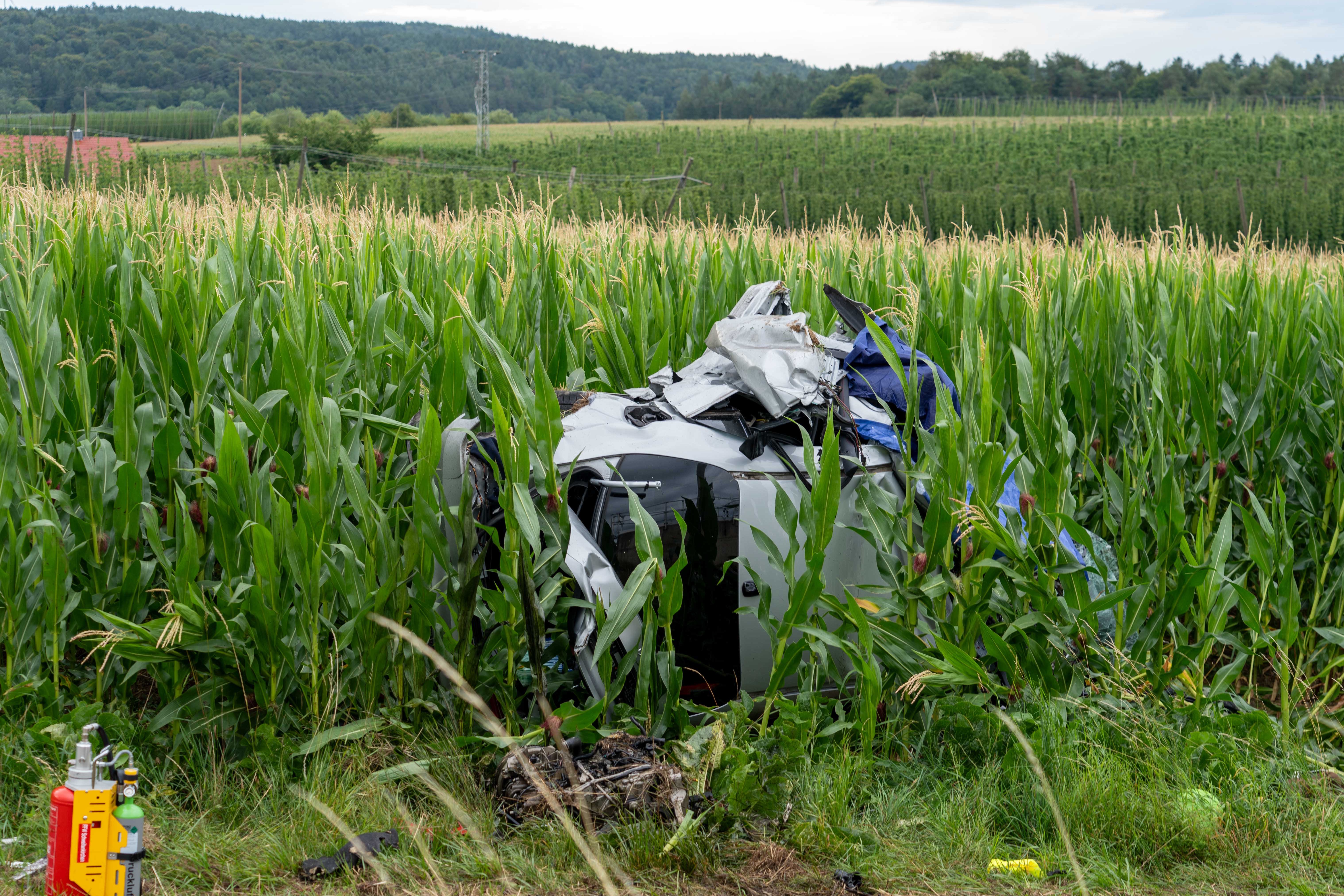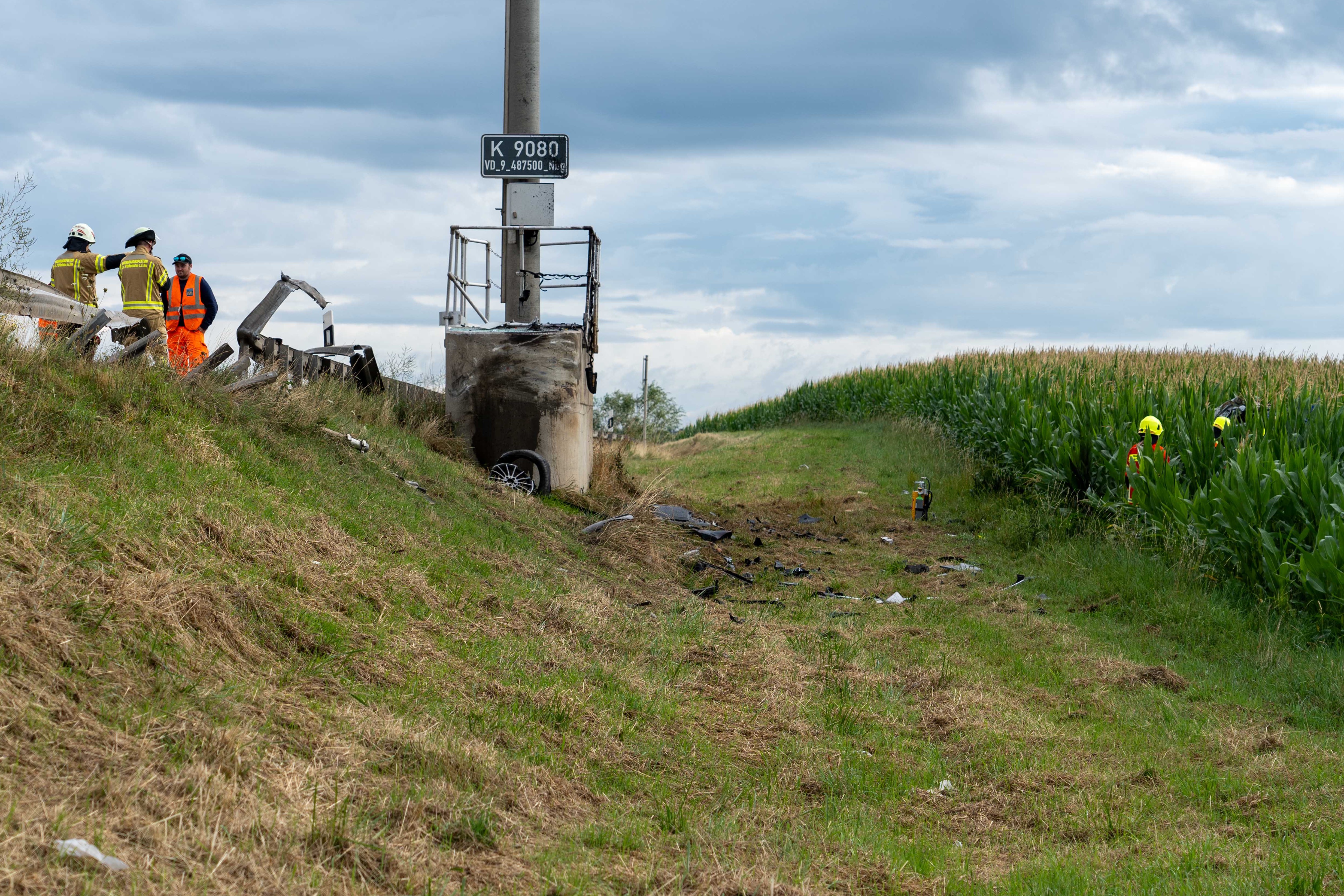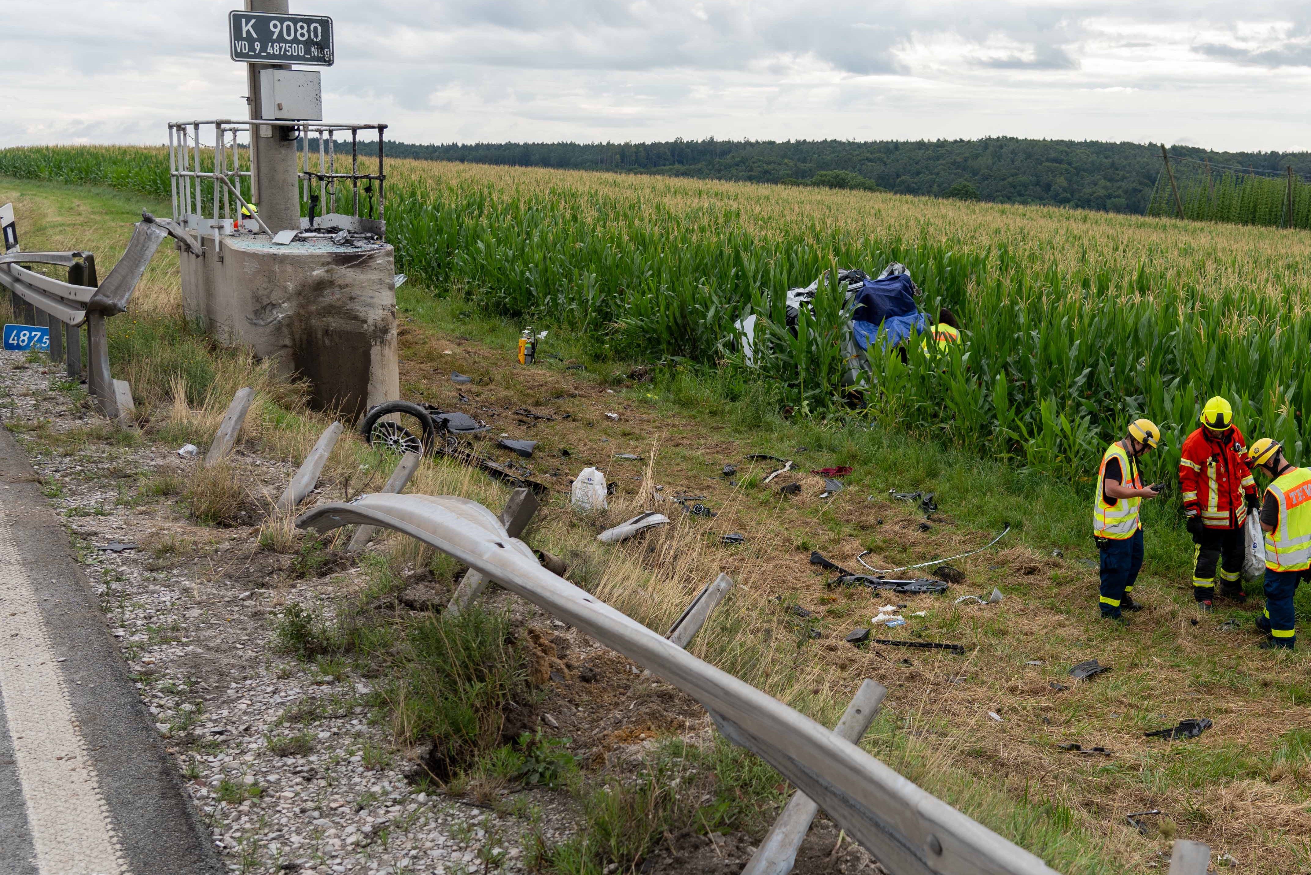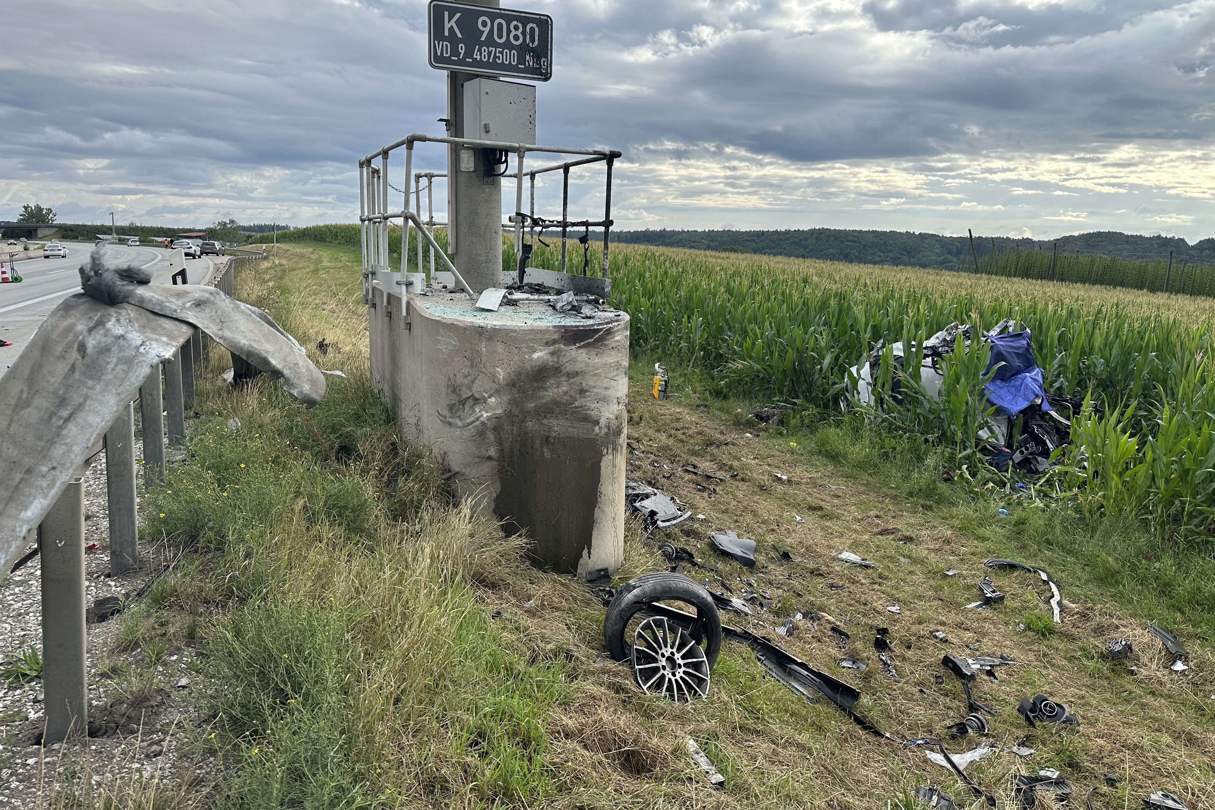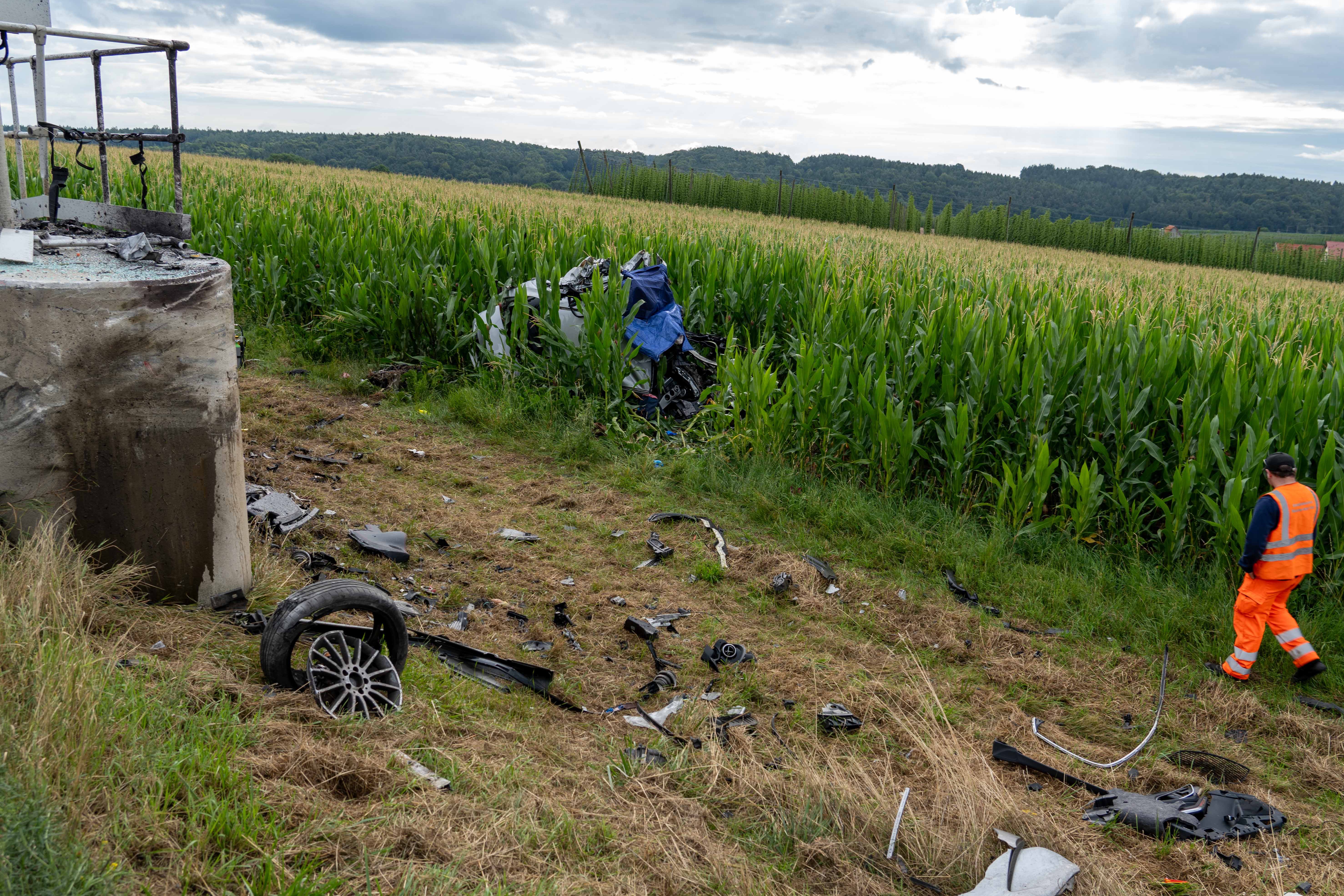 Pkw kam heute Morgen nach Überhol-Manöver rechts von der Strecke ab, durchbrach Leitplanke, prallte frontal gegen Beton-Sockel und landete in Maisfeld.