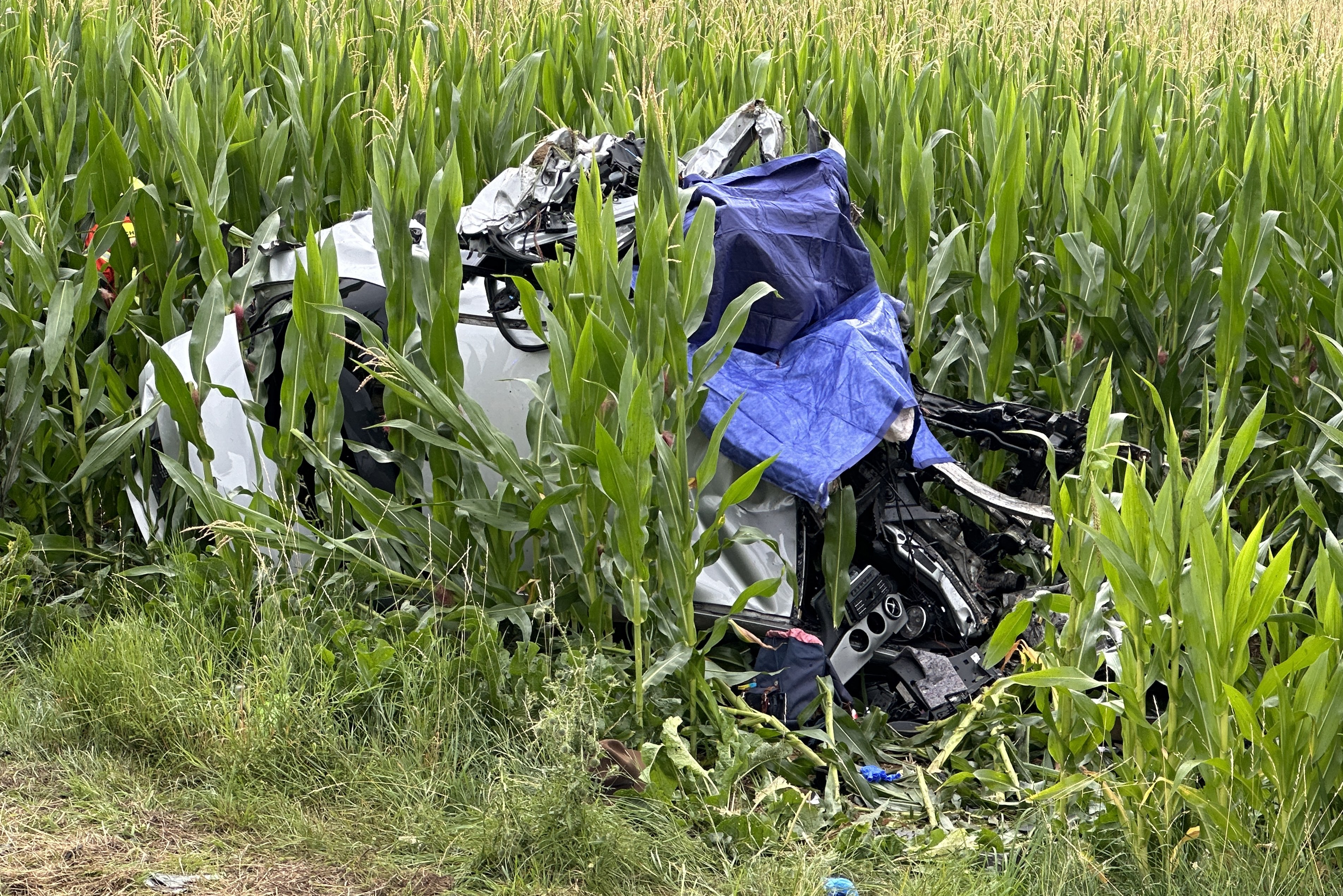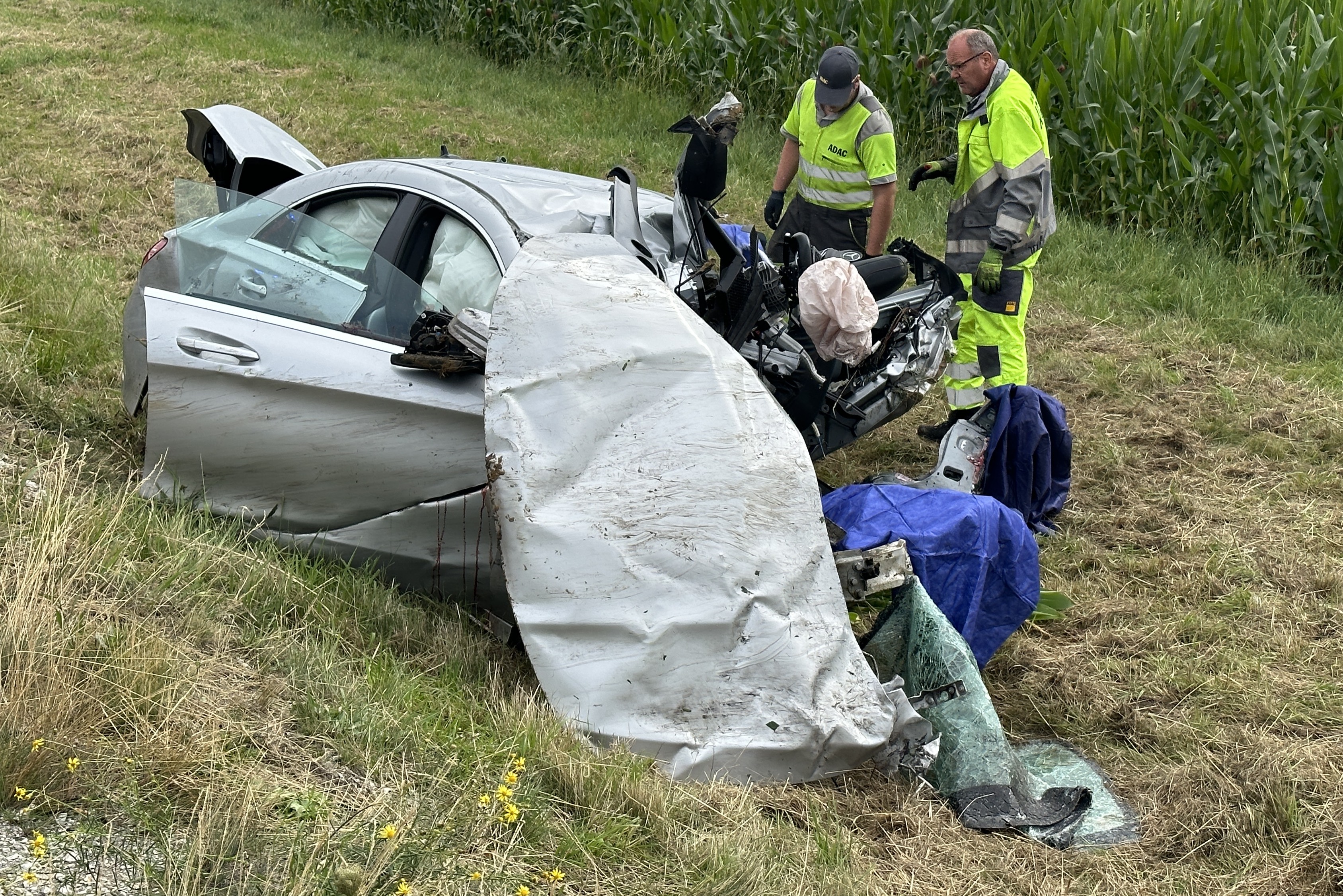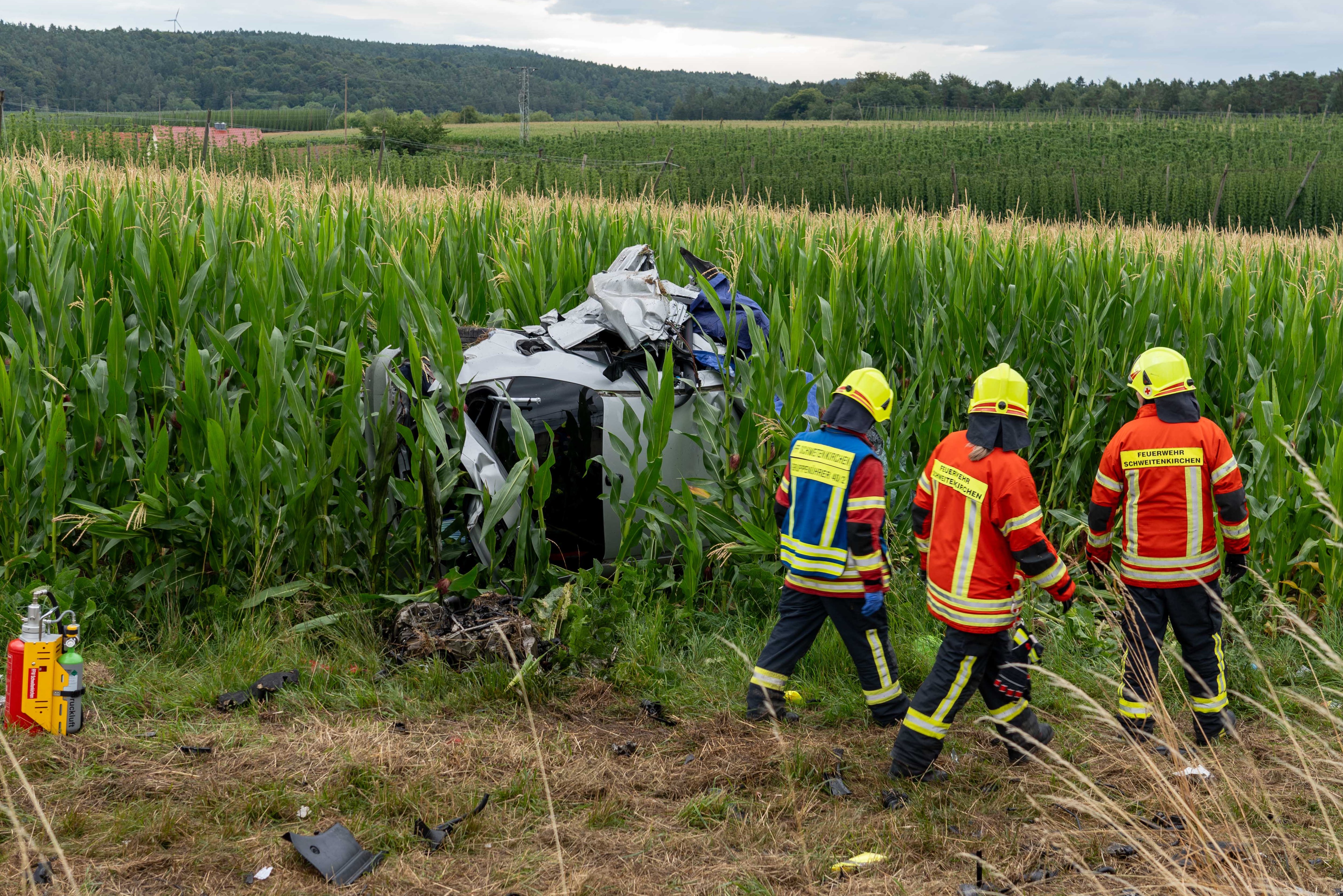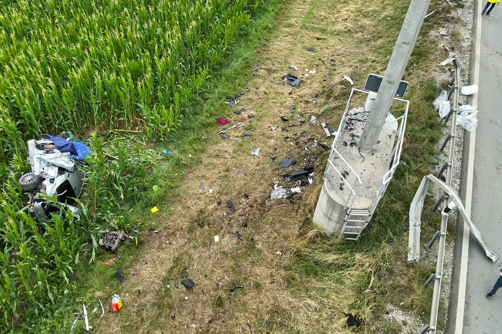 Pkw kam heute Morgen nach Überhol-Manöver rechts von der Strecke ab, durchbrach Leitplanke, prallte frontal gegen Beton-Sockel und landete in Maisfeld.