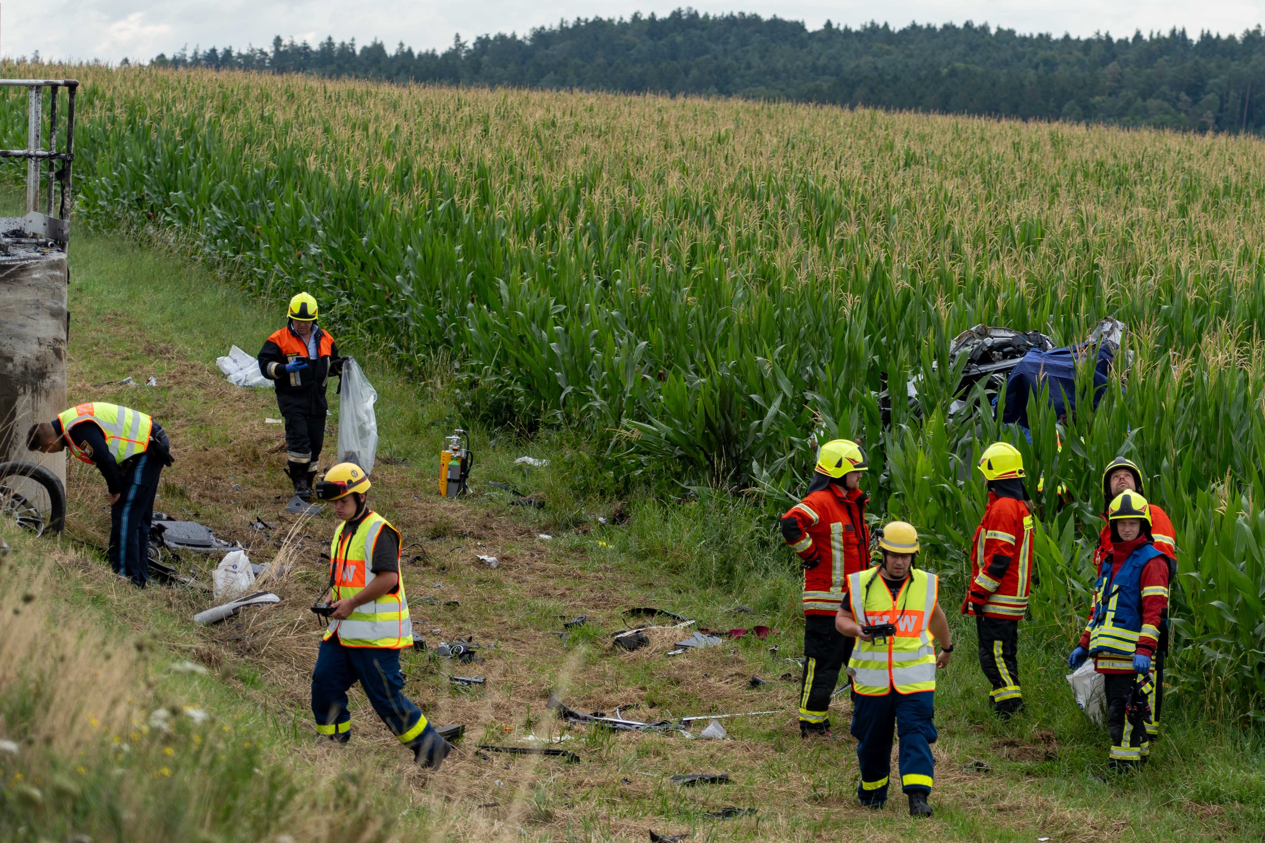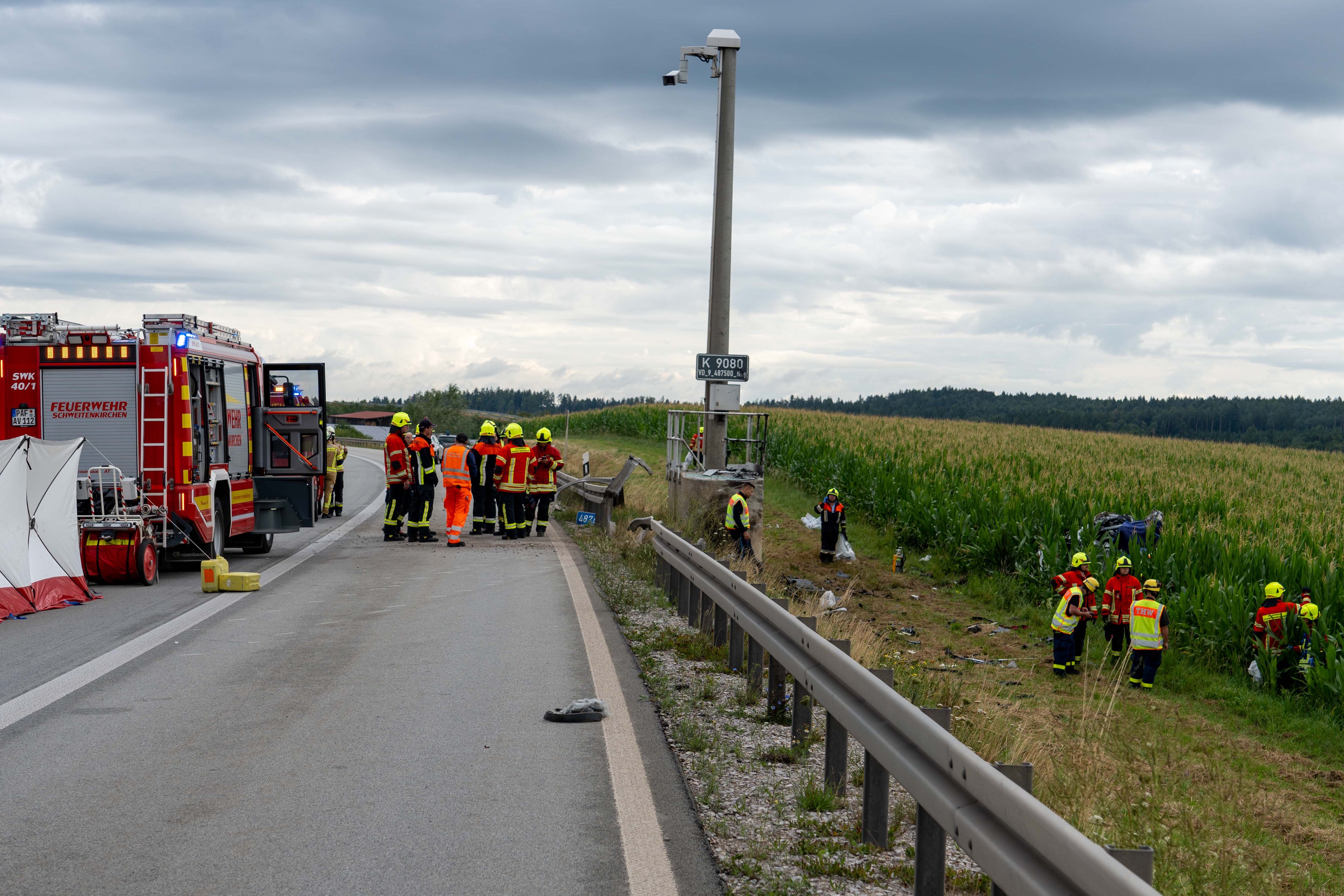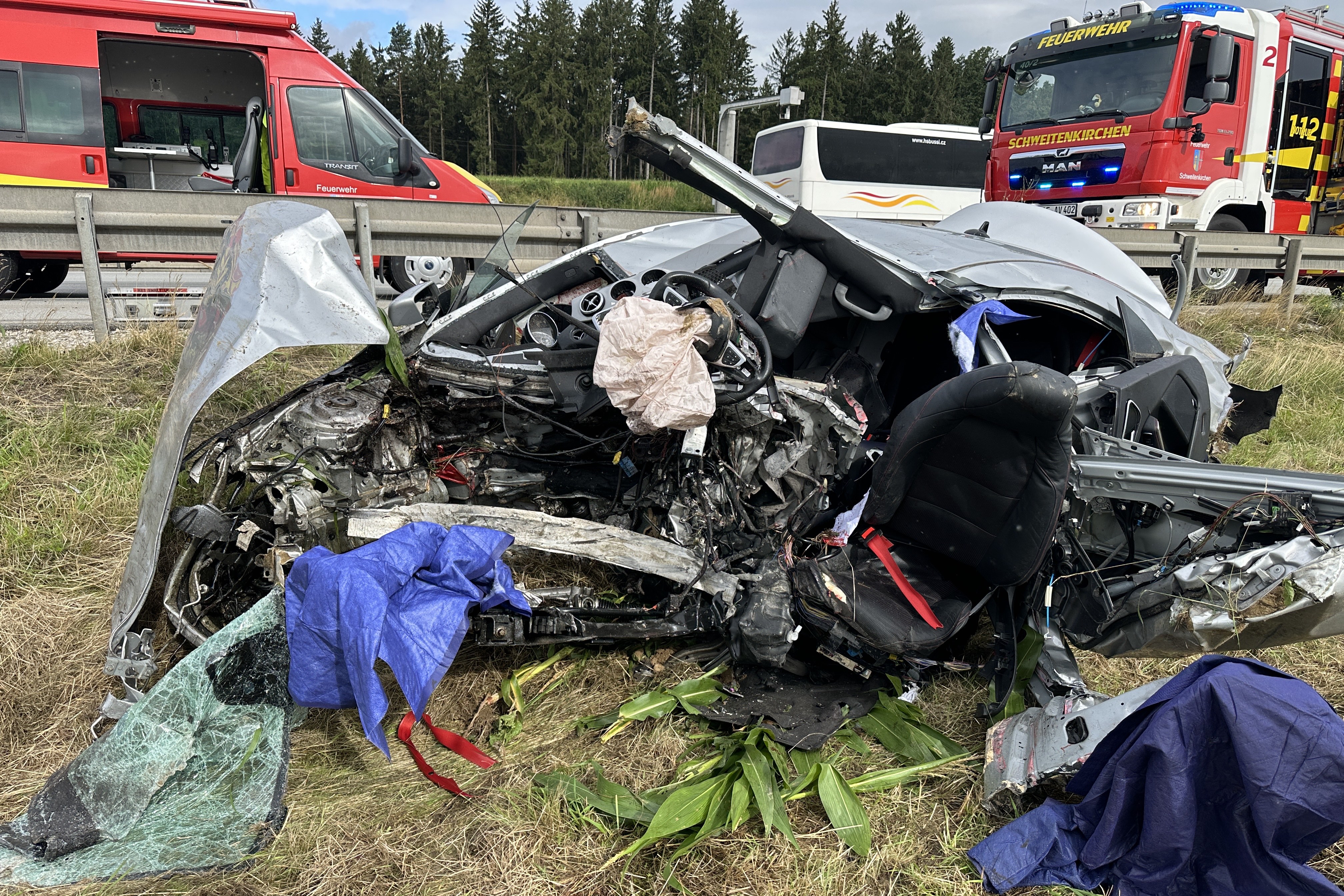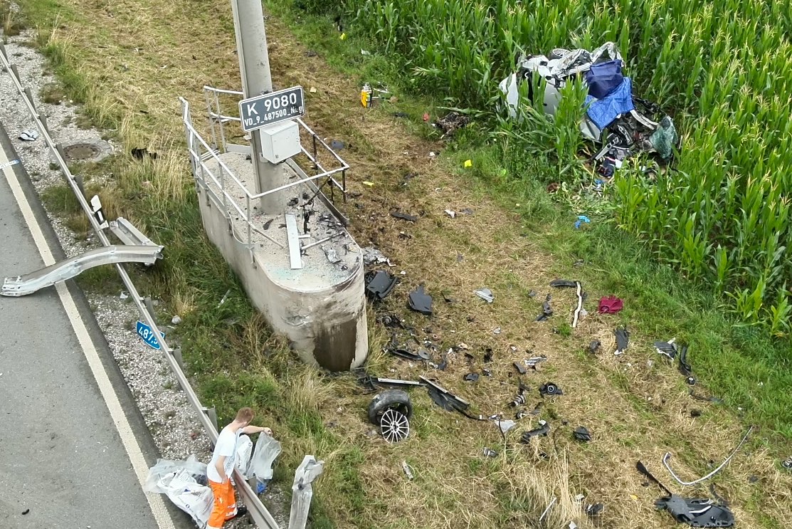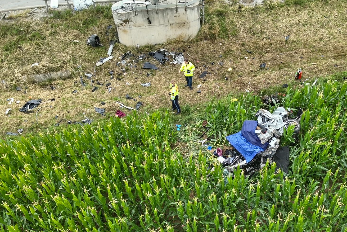 Pkw kam heute Morgen nach Überhol-Manöver rechts von der Strecke ab, durchbrach Leitplanke, prallte frontal gegen Beton-Sockel und landete in Maisfeld.