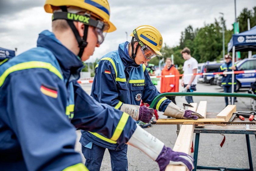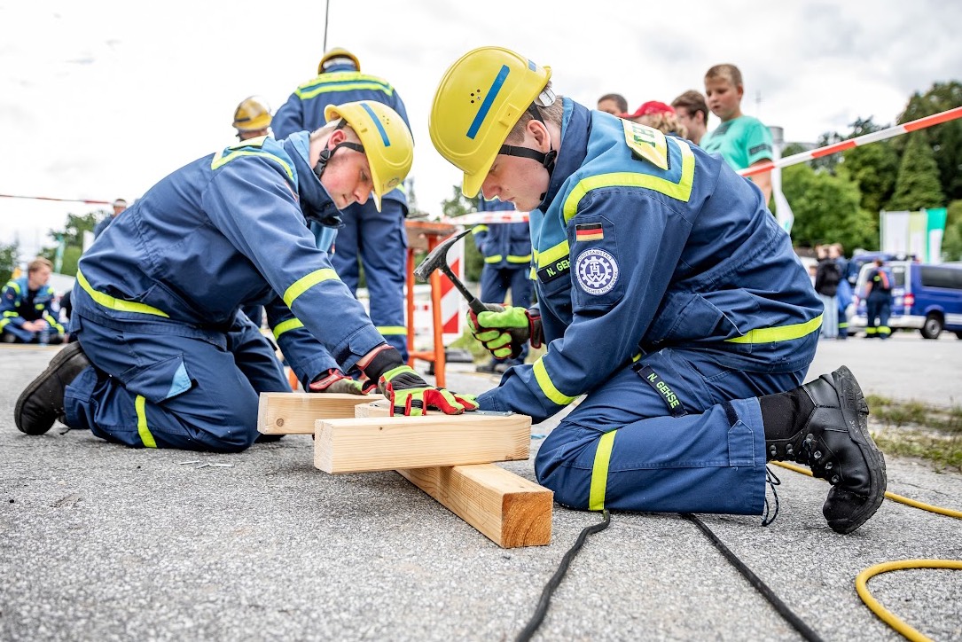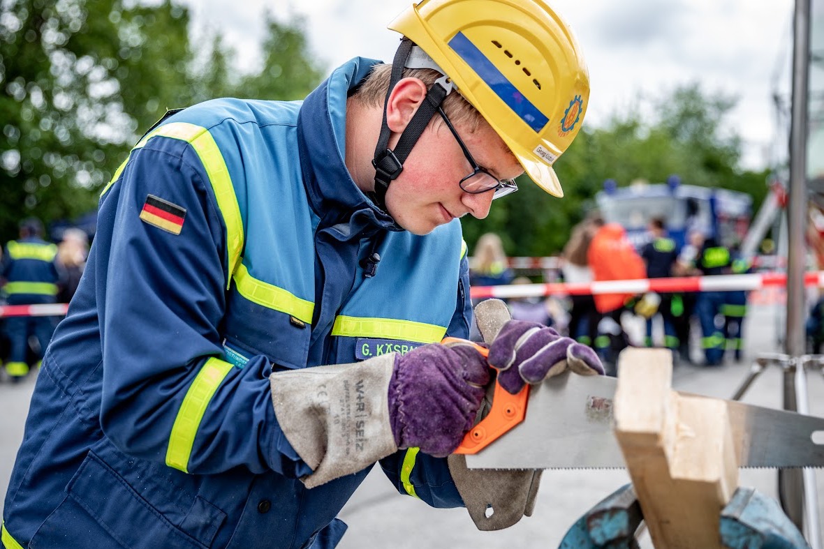 Es galt vier Einsatz-Abschnitte zu bewältigen, darunter das Abpumpen von Wasser im Keller. Eine lange Hindernis-Tür versperrte den Weg, doch die Jugendlichen bewiesen Geschick und Entschlossenheit, indem sie mit einem Greifzug den Baum entfernten und das Wasser fließen ließen.