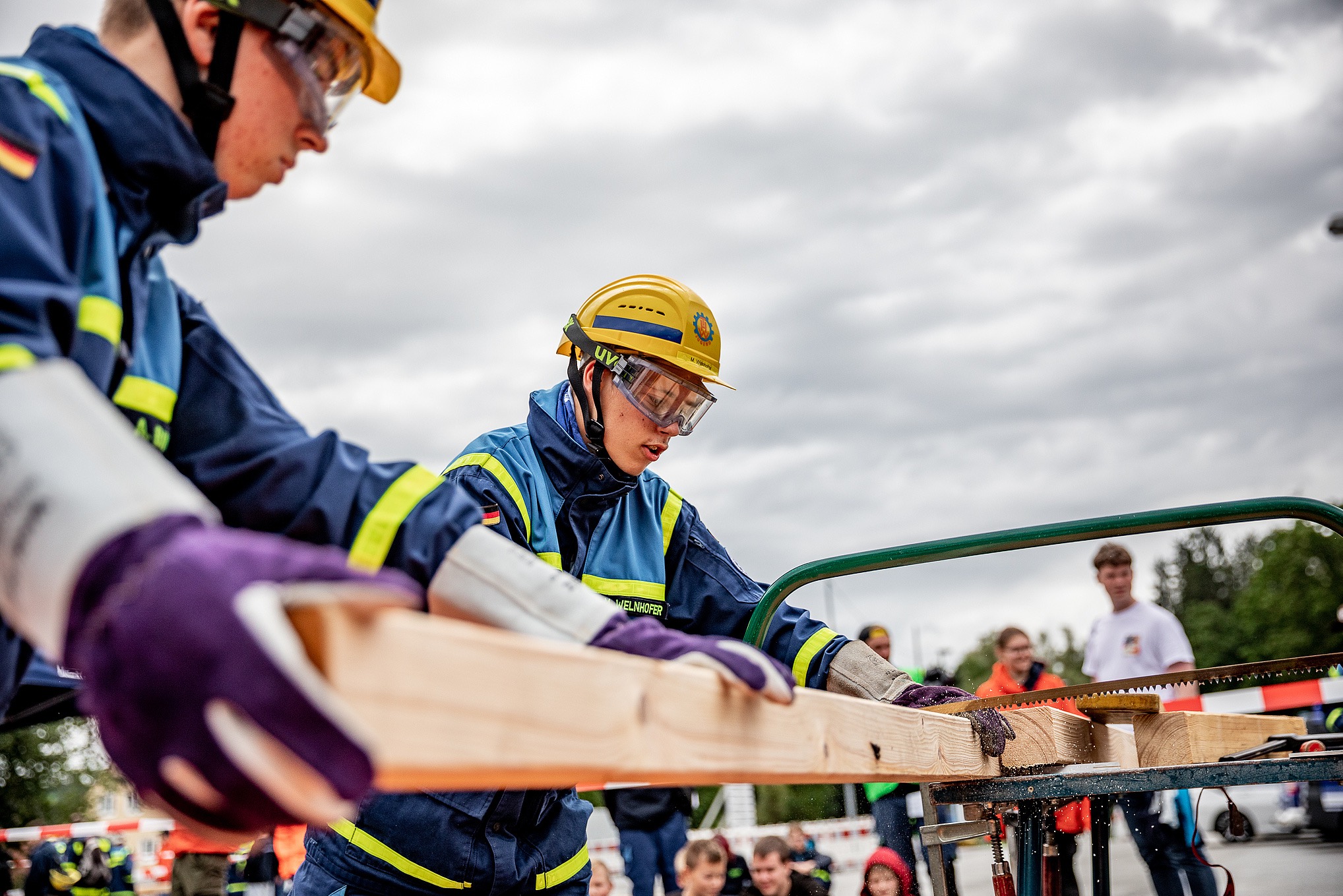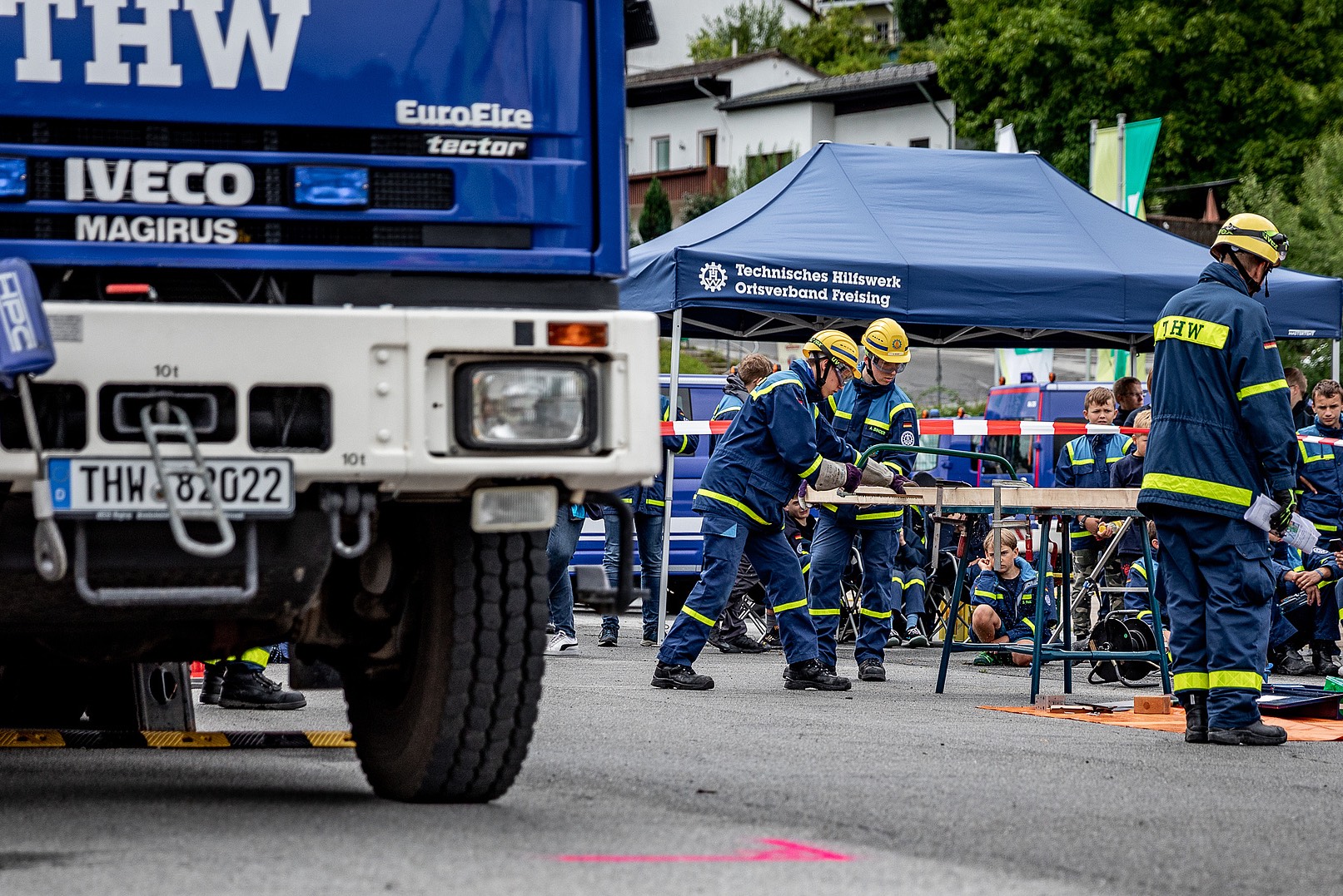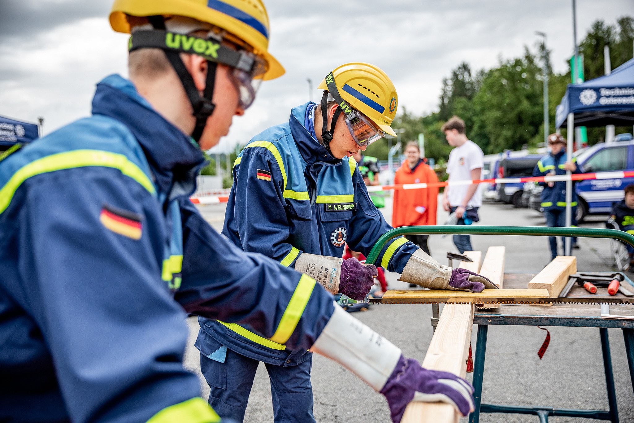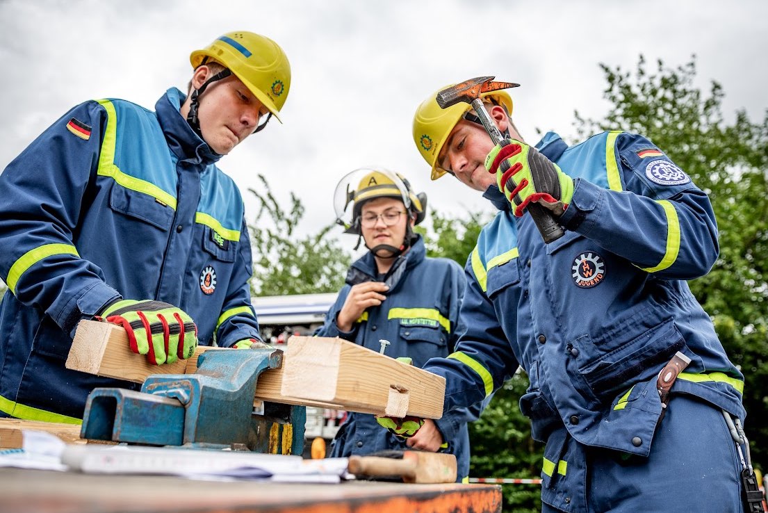 Parallel zu diesen Aufgaben begannen viele Jugend-Gruppen mit der Holz-Bearbeitung. Ein langes Kantholz diente als Grundlage für den Zusammenbau der Buchstaben T, H und W – und zwar gemäß genauer Anleitung. Die zahlreichen Zuschauer verfolgten das Sägen und Hämmern gespannt; sie genossen dabei Bratwurst-Semmeln vom THW-Ortsverband Vilshofen.