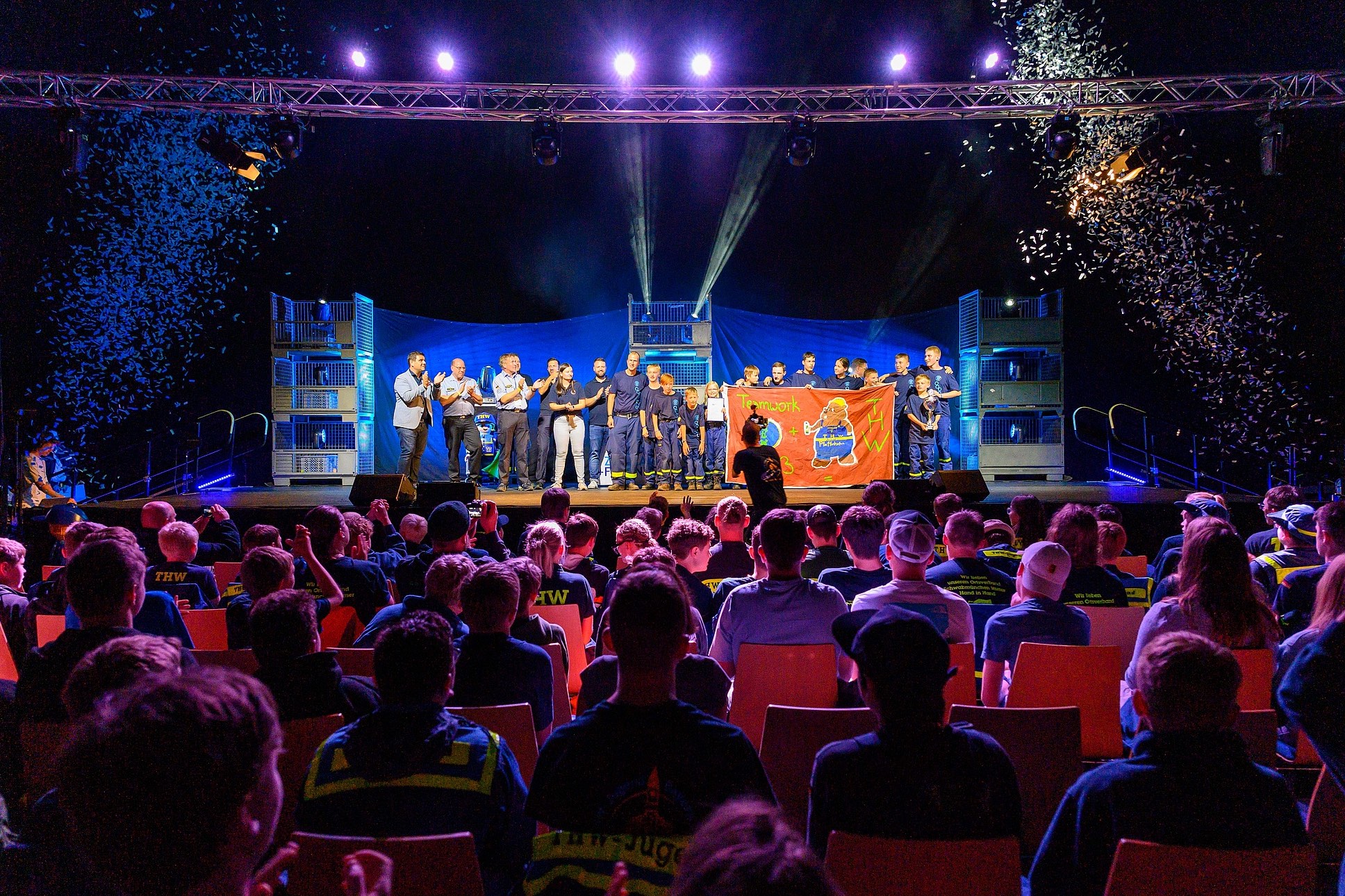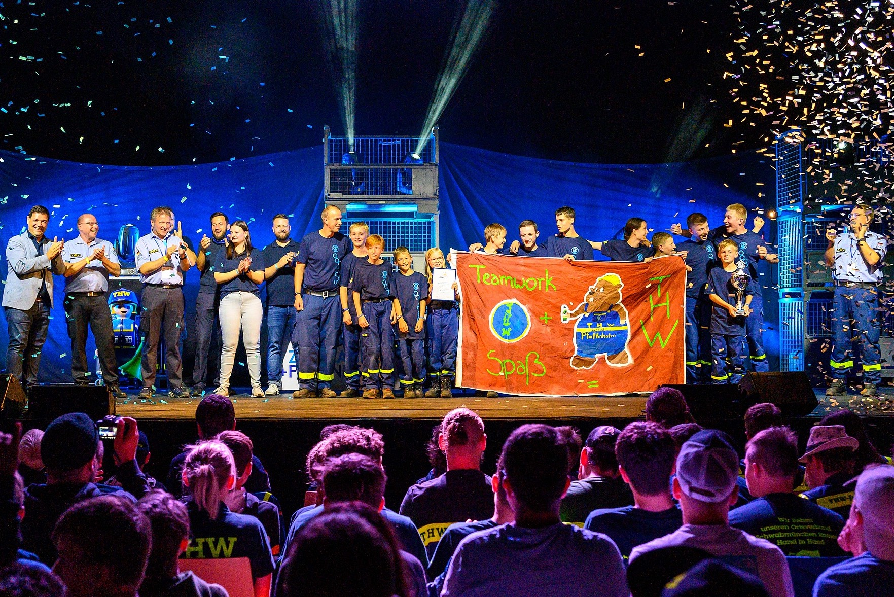 Schließlich erfolgte die mit Spannung erwartete Verkündung des Siegers. Die Teams auf den ersten beiden Plätzen trennten dieses Mal nur wenige Sekunden. Pfaffenhofen ging letztlich mit fünf Punkten Vorsprung vor Landshut als diesjähriger Landes-Sieger hervorging. Damit qualifizierte sich die Jugend-Gruppe des THW aus Pfaffenhofen als bayerischer Vertreter für den Bundes-Wettkampf, der im kommenden Jahr in Nordrhein-Westfalen steigt. Die Pokal-Übergabe wurde von Konfetti-Regen und einer kleinen Umbau-Pause begleitet, bevor alle gemeinsam bei der After-Wettkampf-Party zur Musik von DJ Ryan Dale ausgelassen feierten.