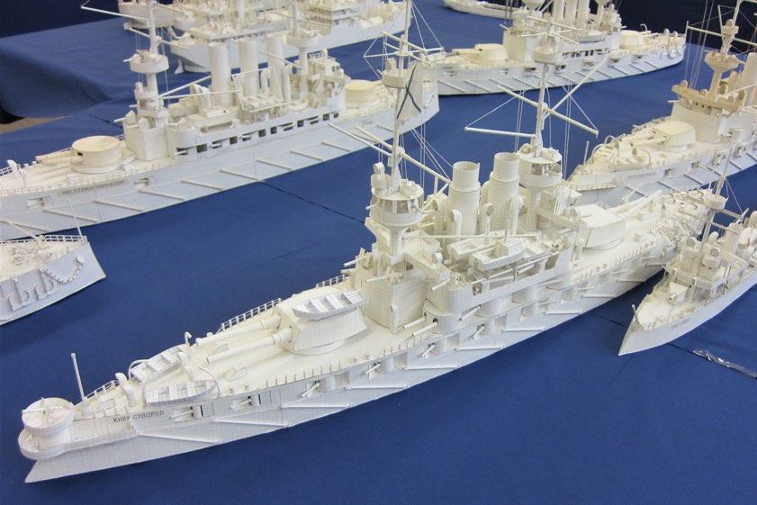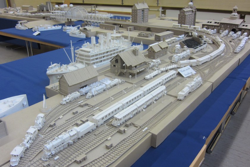 "Seit 40 Jahren bastelt Oliver Stoll Modelle, die sich zu kompletten Hafen- und Eisenbahn-Anlagen fügen", erklärt die Stadtverwaltung zum Künstler. "In Größen von einem Zentimeter bis zu über 125 Zentimeter werden 230 Schiffe und 60 Lokomotiven mit 170 Waggons zu vollständigen Hafen- und Werft-Szenerien sowie Bahnhofs-Arealen aufgebaut." Ergänzt werde dies unter anderem durch Fahrzeuge, Waffen und Gebäude. "So entstand eine Ausstellung mit über 200 Quadratmetern Fläche – geschaffen aus handelsüblichem, kariertem Papier." Stoll habe seine ganz eigene Technik des Modellbaus entwickelt. Die Modelle würden mehrmals verklebt und seien dadurch besonders fest.