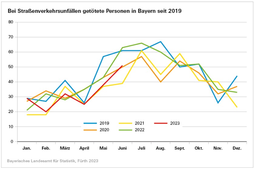 Ebenfalls rückläufig gewesen sei die Zahl der bei den Unfällen verunglückten Personen: Sie ging um 7,7 Prozent auf 6109 zurück. Nach Angaben des Landesamts für Statistik kamen im Juni dieses Jahres bei Verkehrsunfällen auf bayerischen Straßen insgesamt 51 Menschen ums Leben. Im Vorjahres-Monat waren es 63 Verkehrstote. Die Zahl der bei Verkehrsunfällen verletzten Personen ist um 7,6 Prozent zurückgegangen. Neben den "Unfällen mit Personenschaden" wurden im Juni heuer noch 26 855 "Unfälle mit nur Sachschaden" aufgenommen – das waren 0,2 Prozent weniger als im Juni vergangenen Jahres.