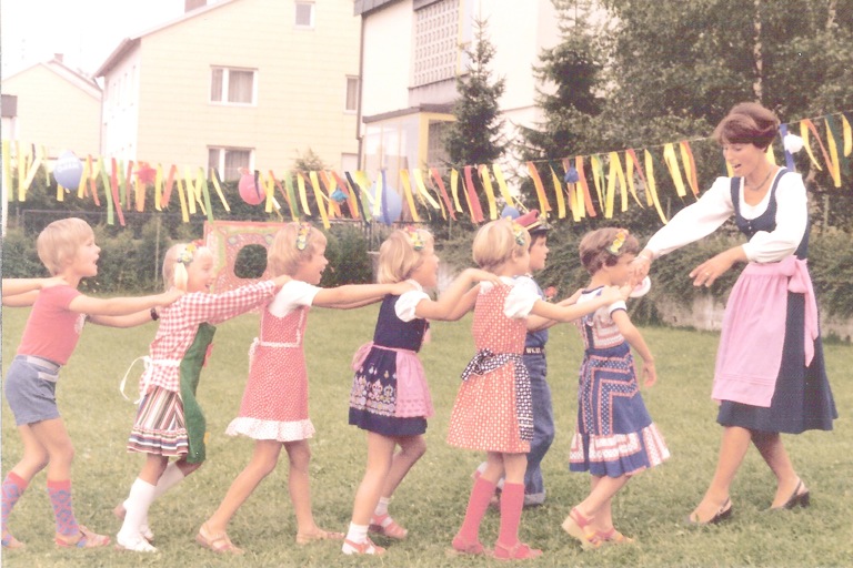 Helga Wagner, die langjährige Kindergartenleiterin, mit den Niederscheyerer Kindern. Ein Bild aus dem Jahr 1974.