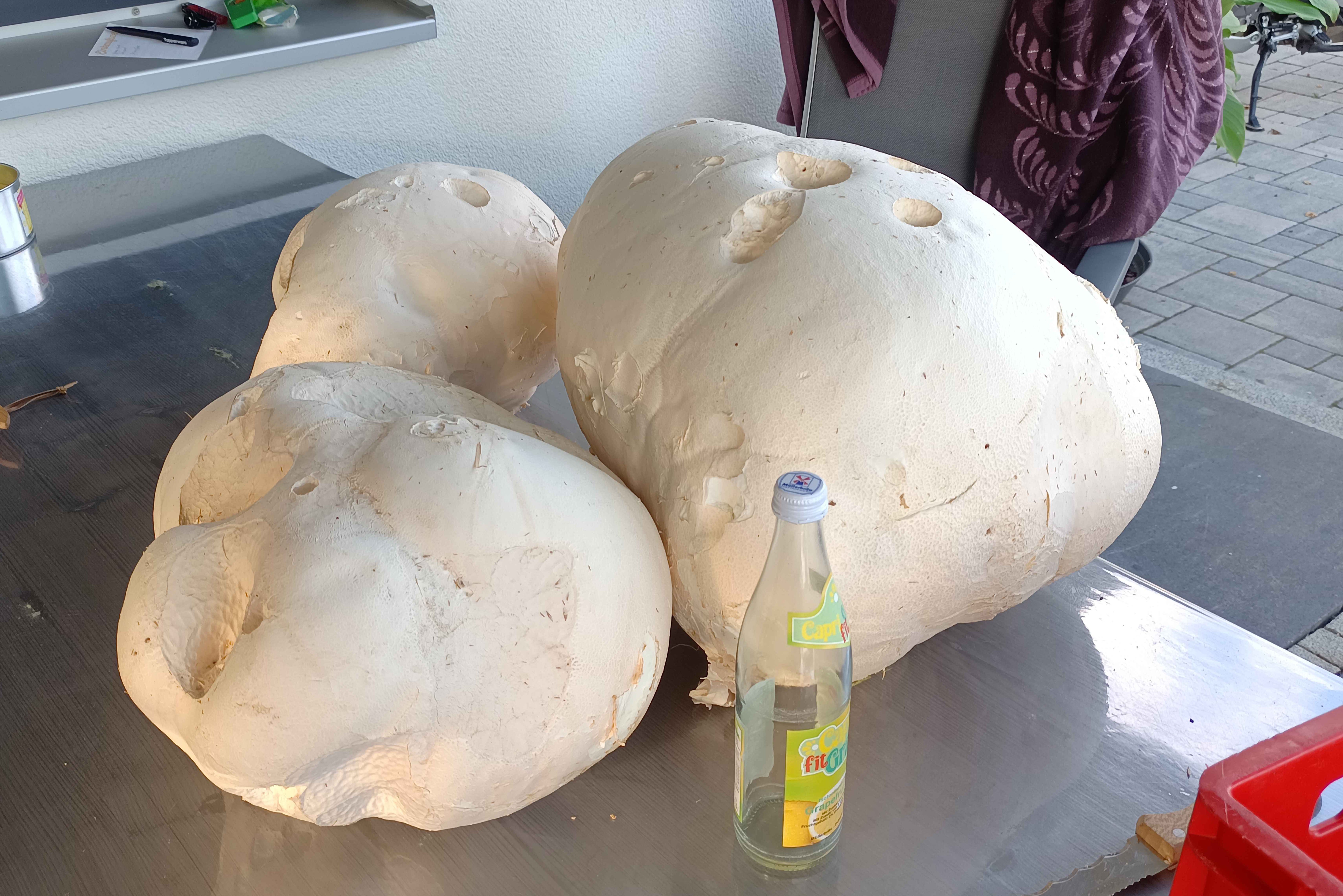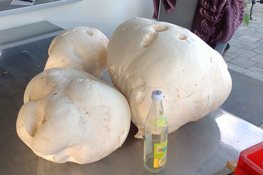 (ty) Und schon geht sie weiter, die Serie von interessanten und eindrucksvollen Fotos aus der Region, die uns unsere Leserinnen und Leser nach wie vor übermitteln. Die Bilder (siehe auch unten), die wir Ihnen heute zeigen können, hat uns Martin Kölbl aus Kreutenbach in der Gemeinde Scheyern geschickt. Er und sein Bruder Ludwig haben nach eigenem Bekunden diese drei beachtlichen Riesenboviste entdeckt. Dem Pilz-Fund vorausgegangen sei ein Tipp von einem Spezl. Bei ihm, er heißt Mane, wollen sich die beiden auch noch einmal bedanken. Wie groß die Boviste sind, wird durch die Limo-Flasche beziehungsweise die Plastik-Wanne anschaulich.