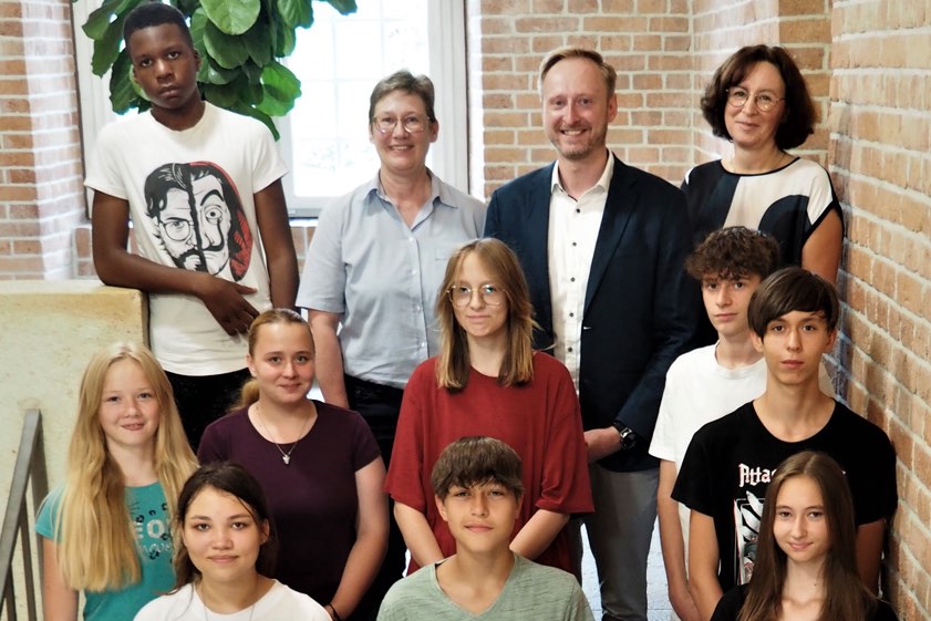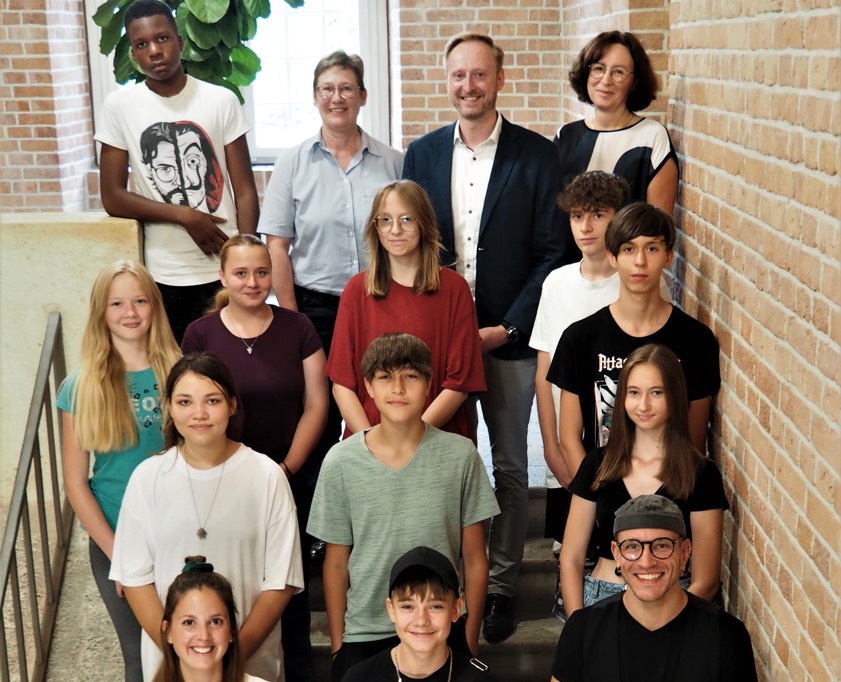 Astrid Kutz und Hagen Baumbach von der Agentur für Arbeit, Heike Bürkl vom Schulamt in Ingolstadt, Janina Stens von "Phase BE" und Camp-Leiter Kevin Taeger mit Schülerinnen und Schülern.