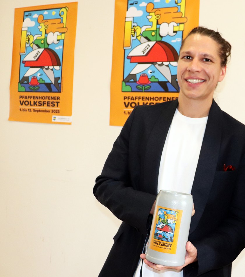 Seit 2009 gibt es zu jedem Pfaffenhofener Volksfest ein neues, von einem Künstler oder Grafiker ganz individuell gestaltetes Plakat. Heuer wurde das Motiv von Sebastian Schwamm gestaltet. Er studierte Kommunikations-Design an der Fachhochschule München und arbeitet heute als freiberuflicher Illustrator, unter anderem für bekannte Zeitschriften. Sein Name ist seinen Worten zufolge zugleich sein Programm: Er sauge alles auf, was das Leben auf ihn werfe, und wringe es auf dem Papier aus. Das diesjährige Volksfest-Motiv zeigt sich abstrakter als in den vergangenen Jahren: Zu sehen ist eine Frau in Tracht, im Laufschritt mit wehenden Haaren und einer Maß Bier in der Hand – der Himmel ist blau und Musik liegt in der Luft.