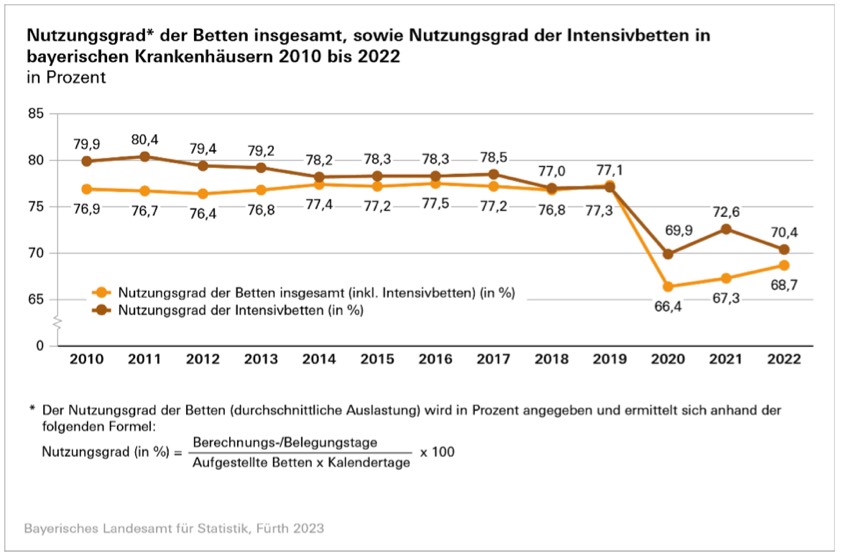 In den bayerischen Krankenhäusern waren im vergangenen Jahr im Jahresdurchschnitt insgesamt 75 098 Betten aufgestellt (minus 0,4 Prozent gegenüber Vorjahr), darunter 3704 Intensivbetten (minus 3,6 Prozent im Vergleich zum Vorjahr). Die durchschnittliche Bettenauslastung betrug im Jahr 2022, bezogen auf alle bayerischen Krankenhäuser, 68,7 Prozent (Vorjahr 2021: 67,3 Prozent; Jahr 2019: 77,3 Prozent). Bei den Intensivbetten lag der jahresdurchschnittliche Nutzungsgrad bei 70,4 Prozent (Vorjahr: 72,6 Prozent; Jahr 2019: 77,1 Prozent). Somit wiesen sowohl die Gesamtbetten-Auslastung als auch die Auslastung der Intensivbetten, bezogen auf den Vergleichs-Zeitraum seit 2010, weiterhin jeweils einen relativ niedrigen Jahresdurchschnittswert auf (siehe Grafik).