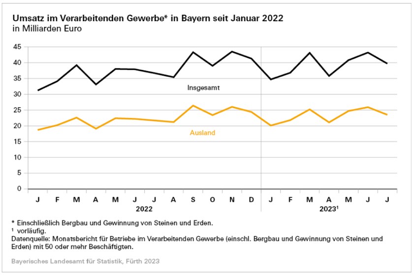 (ty) Im Juli dieses Jahres hat das verarbeitende Gewerbe im Freistaat gegenüber dem Vorjahres-Monat ein Umsatz-Plus von nominal 8,3 Prozent verbucht – und zwar auf rund 39,7 Milliarden Euro. Das verarbeitende Gewerbe, bezogen auf Betriebe mit 50 oder mehr Beschäftigten, umfasst dabei auch immer den Bergbau und die Gewinnung von Steinen und Erden, wie aus dem bayerischen Landesamt für Statistik gemeldet wird.