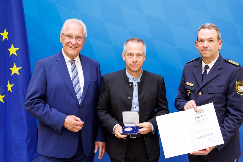 Die "Medaille für Verdienste um die Innere Sicherheit" wurde gestern an Reiner Jäschock aus Winden am Aign in der Gemeinde Reichertshofen verliehen, weil er in der bayerischen Landeshauptstadt couragiert einschritt, als es zu einem Übergriff auf eine sehbehinderte Frau kam. Offiziell wurde dazu gestern bei der Ehrungs-Veranstaltung folgendes dargelegt: "Am Morgen des 10. Mai 2019 sprach ein 27-Jähriger eine sehbehinderte Frau auf dem Querbahnsteig des Münchner Hauptbahnhofs an und fragte sie nach ihrer Handy-Nummer. Als die Frau die Herausgabe der Nummer verweigerte, umarmte der Mann sie und öffnete den Verschluss ihres Rucksacks, worauf dieser zu Boden fiel."