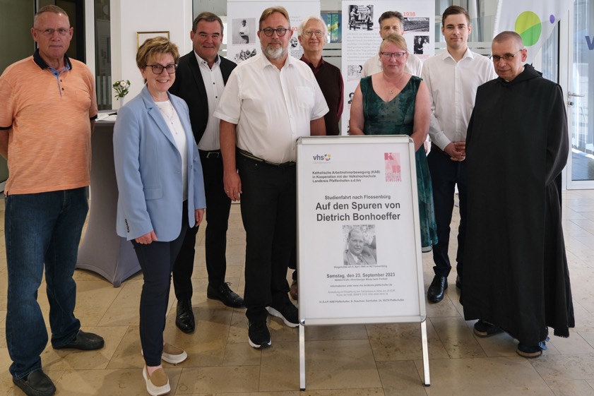 (ty) Die Volkshochschule des Landkreis Pfaffenhofen (VHS) lädt in Kooperation mit der katholischen Arbeitnehmer-Bewegung (KAB) zu einer Ausstellung über das Leben und Wirken von Dietrich Bonhoeffer sowie zu einer Bildungsfahrt in die KZ-Gedenkstätte Flossenbürg und die alte Synagoge in Floß ein. Bonhoeffer (1906-1945) war evangelischer Theologe; er wurde am 9. April 1945 im Konzentrationslager Flossenbürg hingerichtet. Die Ausstellung im Foyer des Landratsamts, die noch bis 22. September zu den üblichen Öffnungszeiten der Behörde besichtigt werden kann, wurde kürzlich im Kreise der Kooperations-Partner eröffnet. Die Bildungsfahrt findet am 23. September statt; Anmeldungen sind noch bis 16. September möglich.