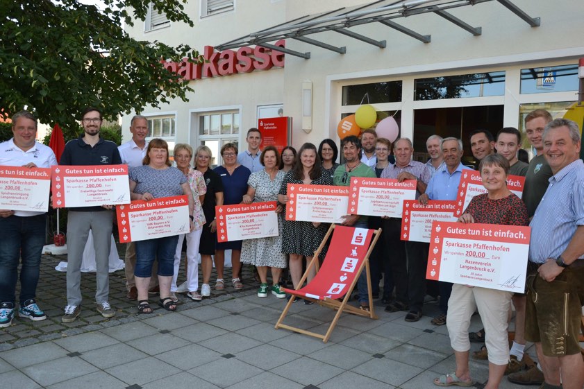 Der zuständige Marktbereichs-Leiter Mathias Gump, die Geschäftsstellen-Leiterin Marina Utz sowie das weitere für die Bereiche Langenbruck, Rohrbach und Pörnbach zuständige Sparkassen-Team bedankten sich anlässlich des Jubiläums mit besonderen Präsenten bei den Kundinnen und Kunden für die jahrzehntelange Treue. Besonders freuen durften sich die Kindergärten aus Langenbruck und Hög sowie insgesamt acht Vereine. Sie erhielten jeweils einen Scheck über 200 Euro für ihr soziales Engagement, sodass von dem Geldinstitut hier unterm Strich 2000 Euro gespendet wurde (Foto oben).