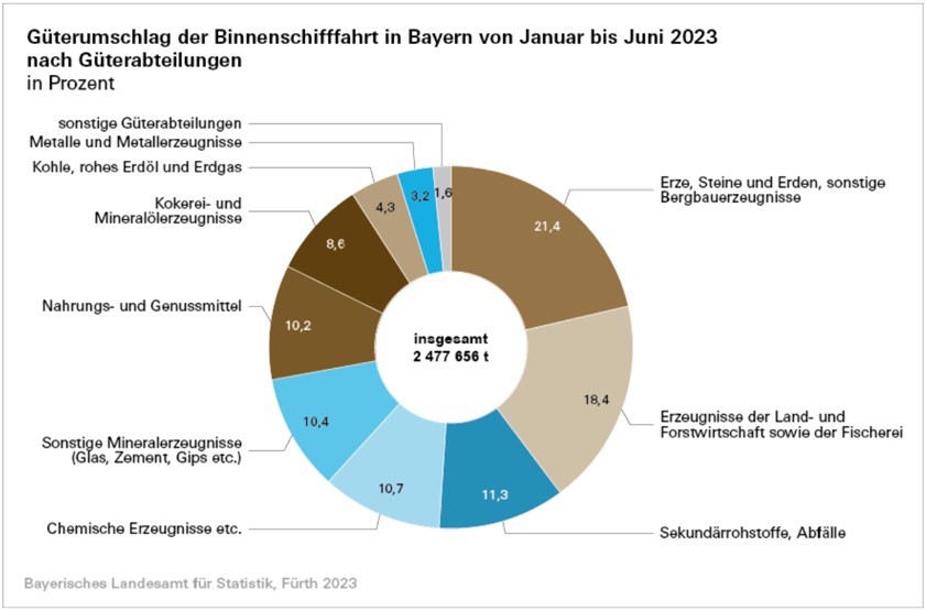 Auf den bayerischen Bundeswasserstraßen wurden im ersten Halbjahr heuer hauptsächlich "Erze, Steine und Erden" (21,4 Prozent) sowie "Erzeugnisse der Land- und Forstwirtschaft" (18,4 Prozent) transportiert. Weitere 11,3 Prozent entfielen auf "Sekundärrohstoffe, Abfälle".