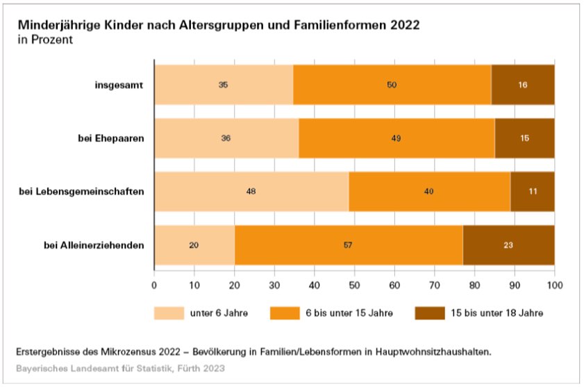 Gut ein Drittel (35 Prozent) der minderjährigen Kinder war im Jahr 2022 jünger als sechs Jahre, rund die Hälfte war im Alter von sechs bis 14 Jahren und 16 Prozent waren 15 bis unter 18 Jahre alt. Während diese Verteilung für minderjährige Kinder, die bei verheirateten Elternpaaren lebten, nahezu identisch war, unterschied sie sich von der Altersstruktur der Kinder in Lebensgemeinschaften beziehungsweise bei Alleinerziehenden. In Lebensgemeinschaften lebten eher jüngere Kinder, bei Alleinerziehenden dagegen eher ältere.