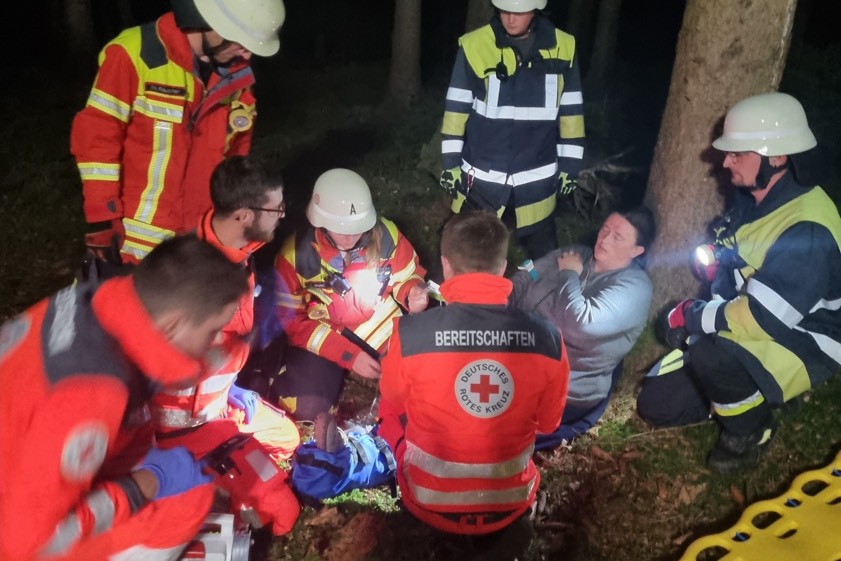Kurz danach kamen auch das BRK und die Floriansjünger an. Während der Versorgung der verletzten Frau stellte sich – so das weitere Übungs-Szenario – dann heraus, dass eine weitere Frau im tiefdunklen Wald vermisst wird. Folgendes Geschehen wurde nämlich angenommen: Die beiden Frauen waren beim Schwammerl-Suchen, als eine von ihnen unglücklich stürzte und dadurch das Bewusstsein verlor. Wegen des fehlenden Mobilfunk-Empfangs marschierte die andere Frau los, um Hilfe zu holen. Sie verunglückte allerdings in dem unwegsamen Gelände ebenfalls und erlitt eine Unterschenkel-Fraktur.
