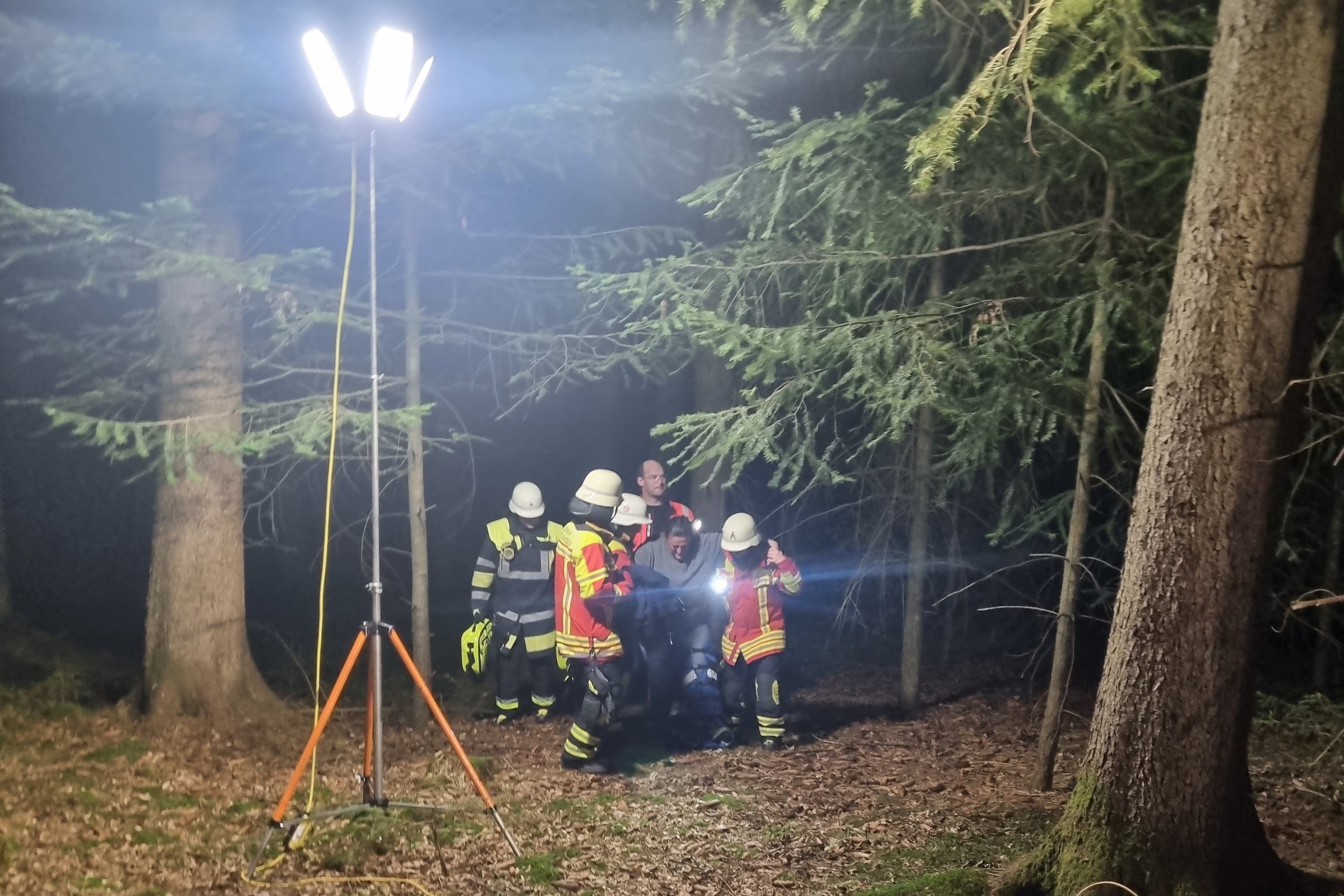 (ty) Gegen 19 Uhr waren die Feuerwehrleute aus Hettenshausen am Freitagabend zusammen mit der Motorrad-Staffel der Johanniter-Unfall-Hilfe aus Allershausen und dem Bayerischen Roten Kreuz (BRK) aus Pfaffenhofen zu einer gemeinsamen Übung in ein Waldstück zwischen Hettenshausen und dem Ortsteil Entrischenbrunn gerufen worden. Grund für die Alarmierung: "Hilfe-Rufe aus dem Wald." Zunächst erreichten zwei Johanniter den Einsatzort; nach wenigen Minuten hatten sie eine verletzte Frau lokalisiert. Doch das sollte erst der Anfang sein.