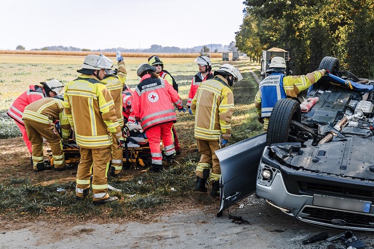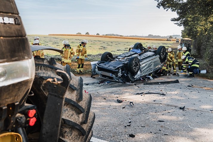Laut Polizei prallte der Pkw frontal in die linke Seite des abbiegenden Traktors. Nach dieser Kollision habe sich der Subaru überschlagen und sei auf dem Dach zum Liegen gekommen. Sowohl der Pkw-Fahrer als auch seine 67-jährige Beifahrerin mussten von der Feuerwehr befreit werden. "Entgegen der ursprünglichen Einsatz-Meldung waren die beiden Pkw-Insassen jedoch nicht eingeklemmt, sondern lediglich eingeschlossen", berichtet der Kreis-Feuerwehr-Verband von Dachau. Beide wurden laut Polizei schwer verletzt. Nach der Erstversorgung vor Ort wurden die zwei Verunglückten in Kliniken gefahren beziehungsweise geflogen.