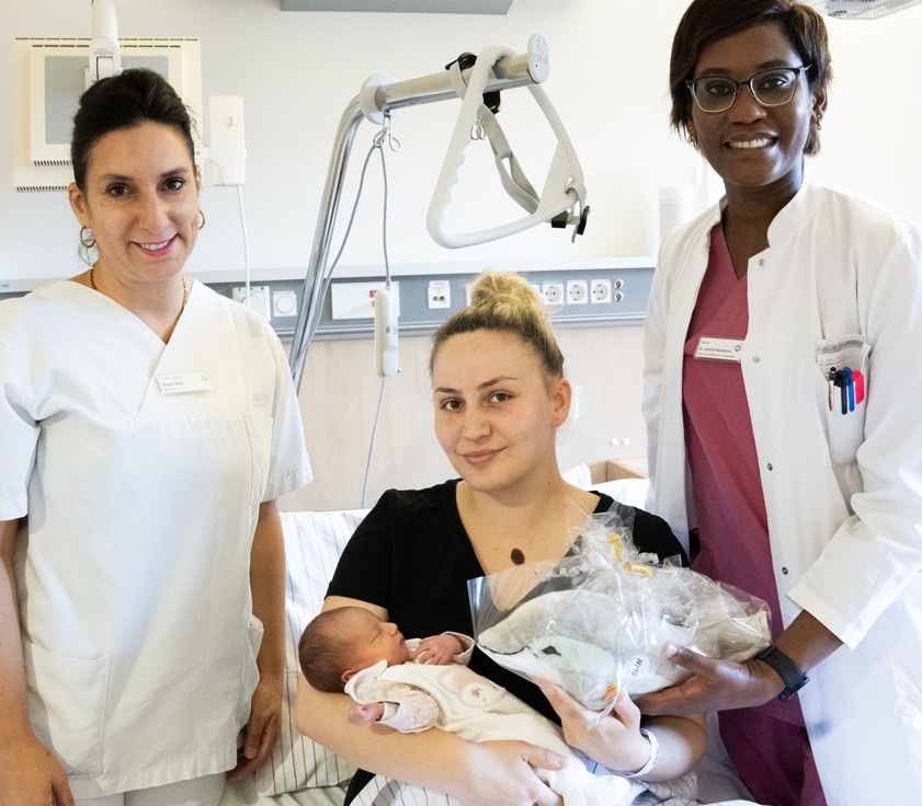 Die kleine Alea kam am Montag zur Welt. Glückwünsche und ein Stofftier überbrachten Krankenschwester Doris Wild (links) sowie Funktions-Oberärztin Laeticia Nwaeburu (rechts).