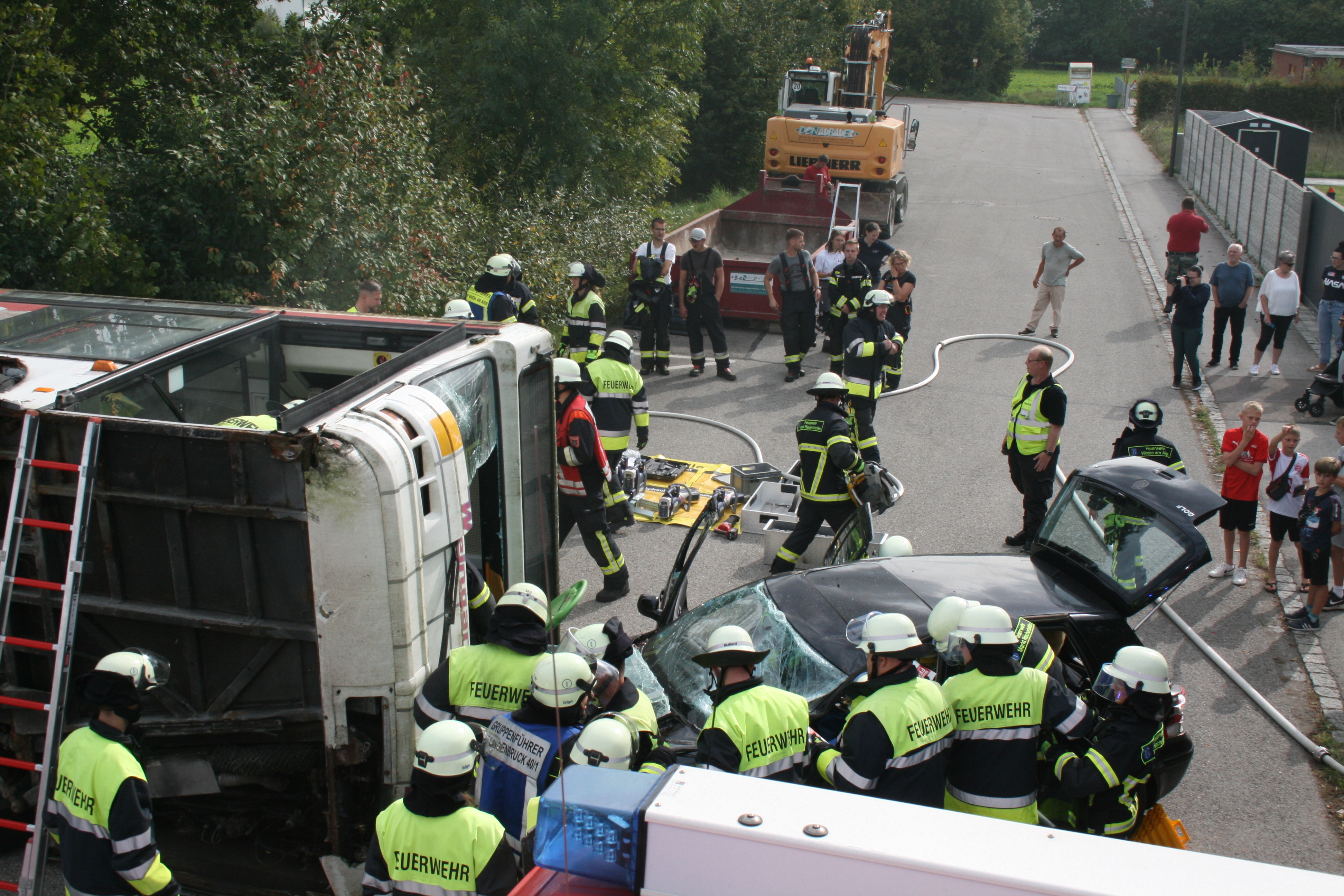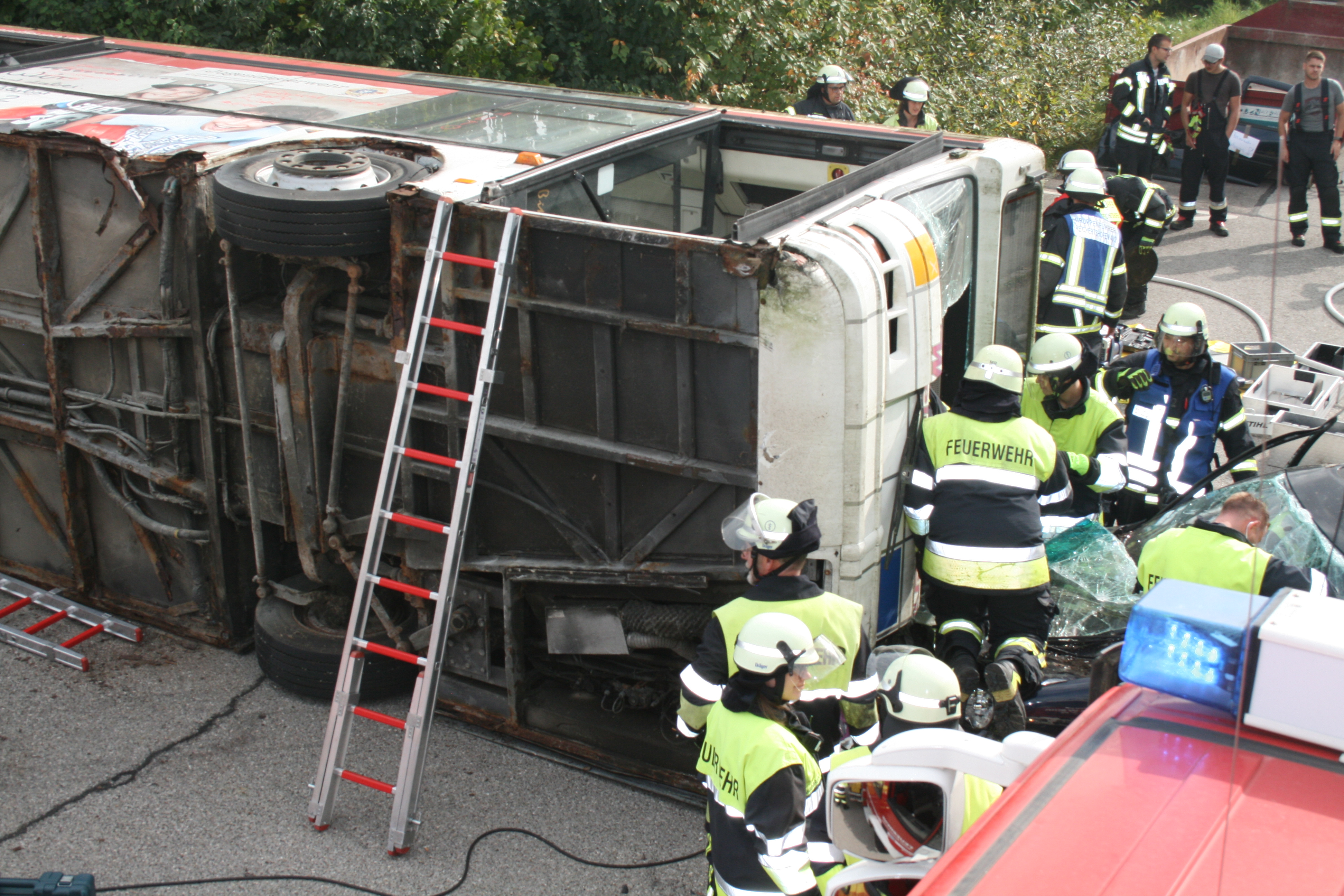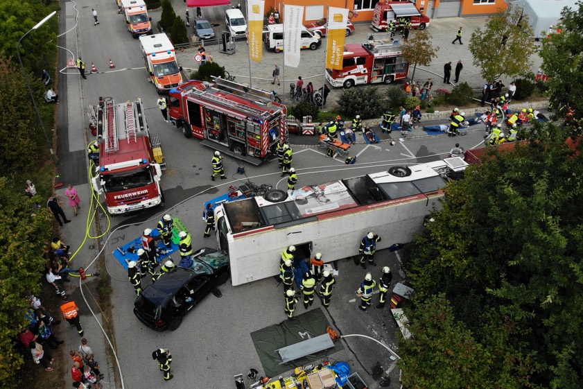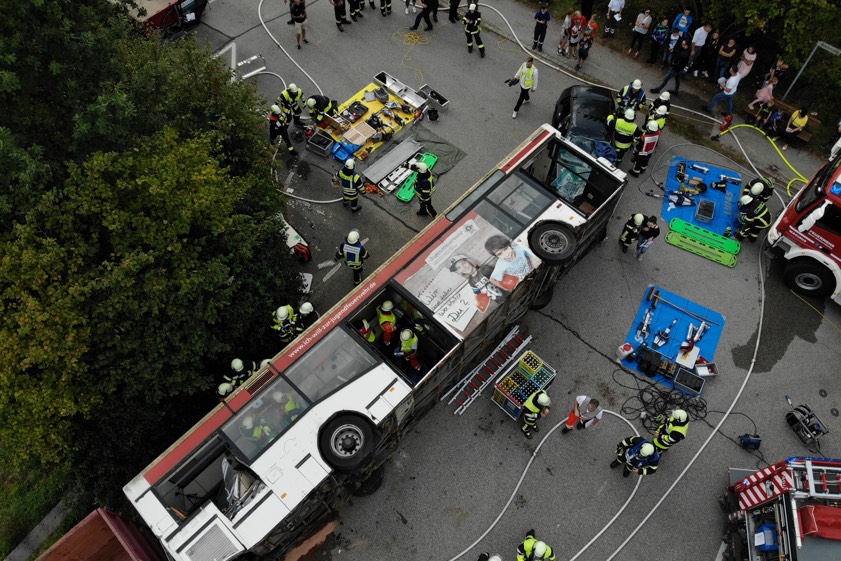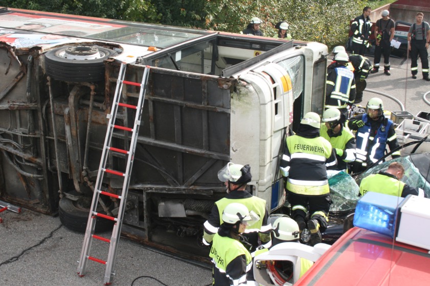 "Die letzten verunglückten Personen waren gut 70 Minuten nach Übungs-Beginn aus dem Bus beziehungsweise aus dem Pkw befreit", fasst die Feuerwehr zusammen. Aus Sicht des Rettungsdienstes seien für dieses Szenario sowohl umliegende als auch weiter entfernte Krankenhäuser für die Verletzten reserviert worden. Zudem seien fiktiv fünf Rettungs-Hubschrauber angefordert worden – die zur Übung jedoch nicht wirklich anrückten. Dies alles habe das Team um den leitenden Notarzt und um den organisatorischen Rettungsdienst-Leiter in Abstimmung mit der Leitstelle organisiert.