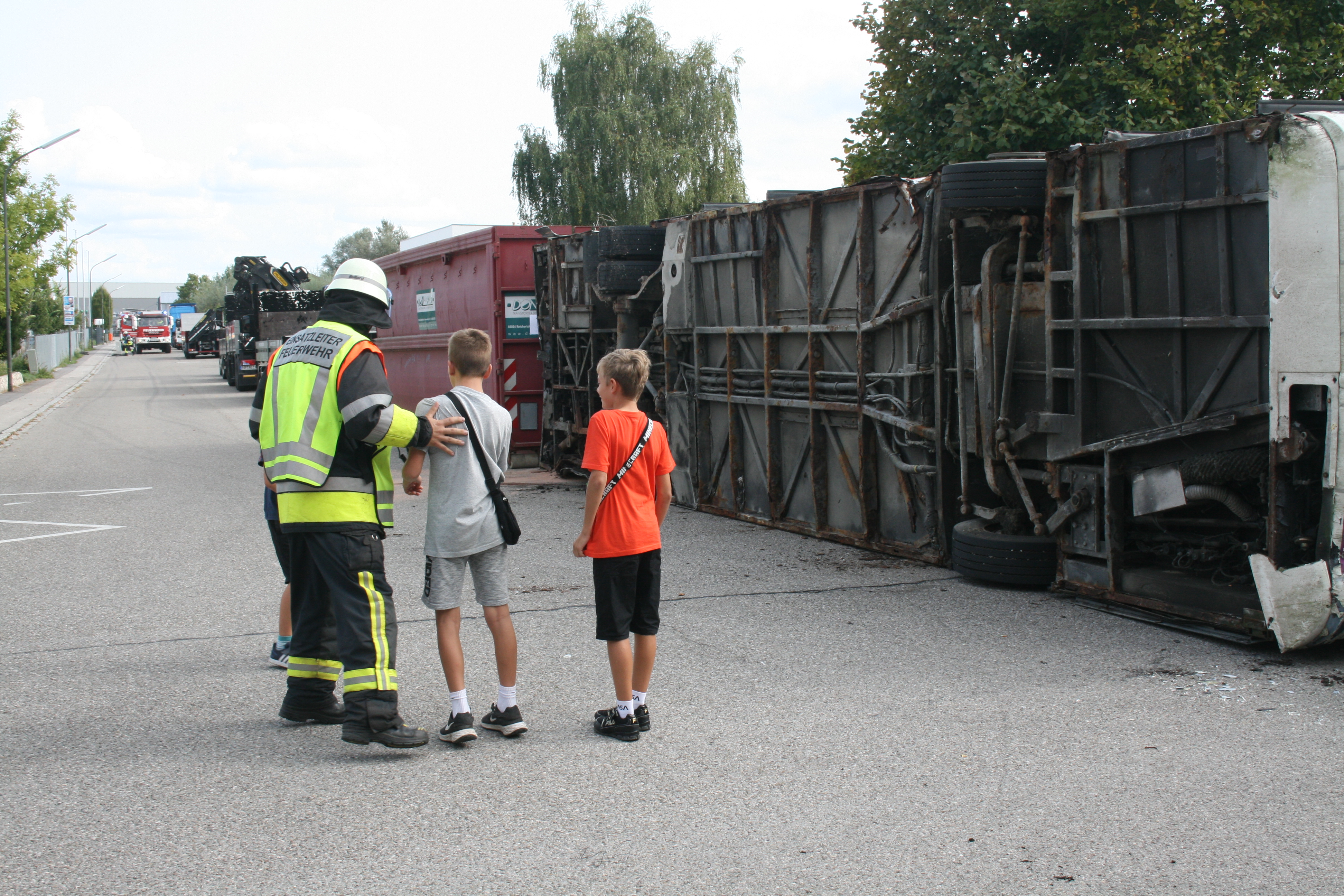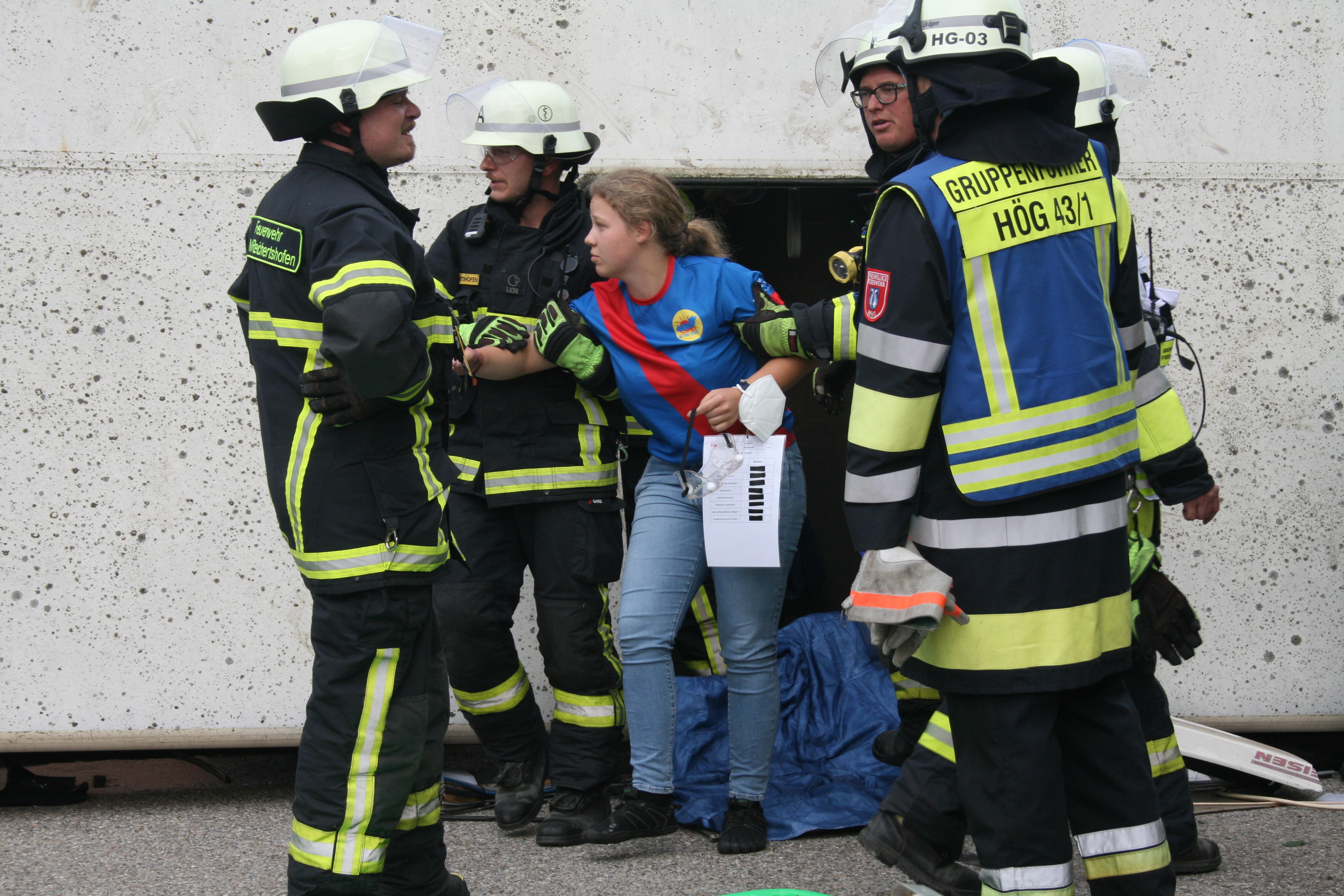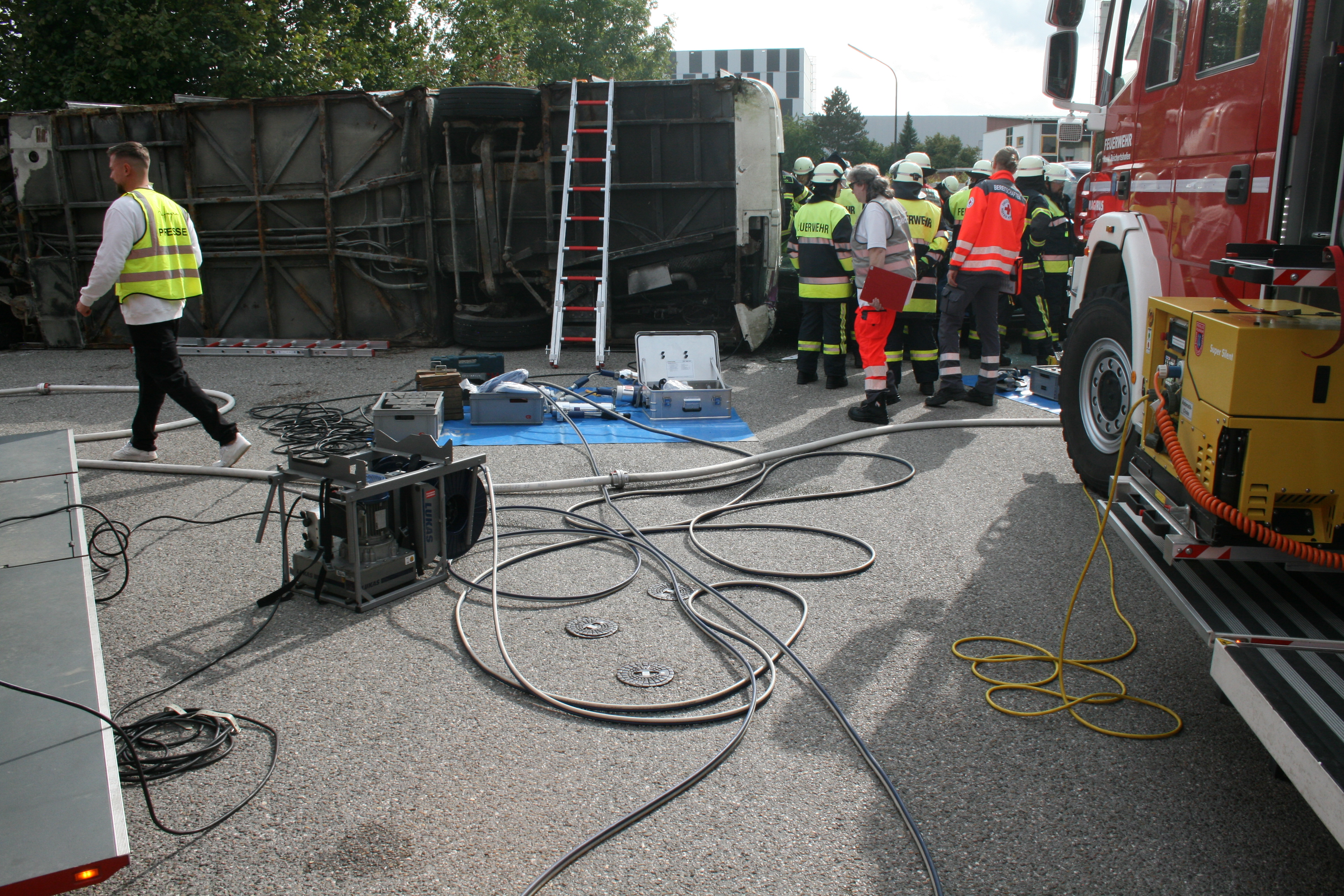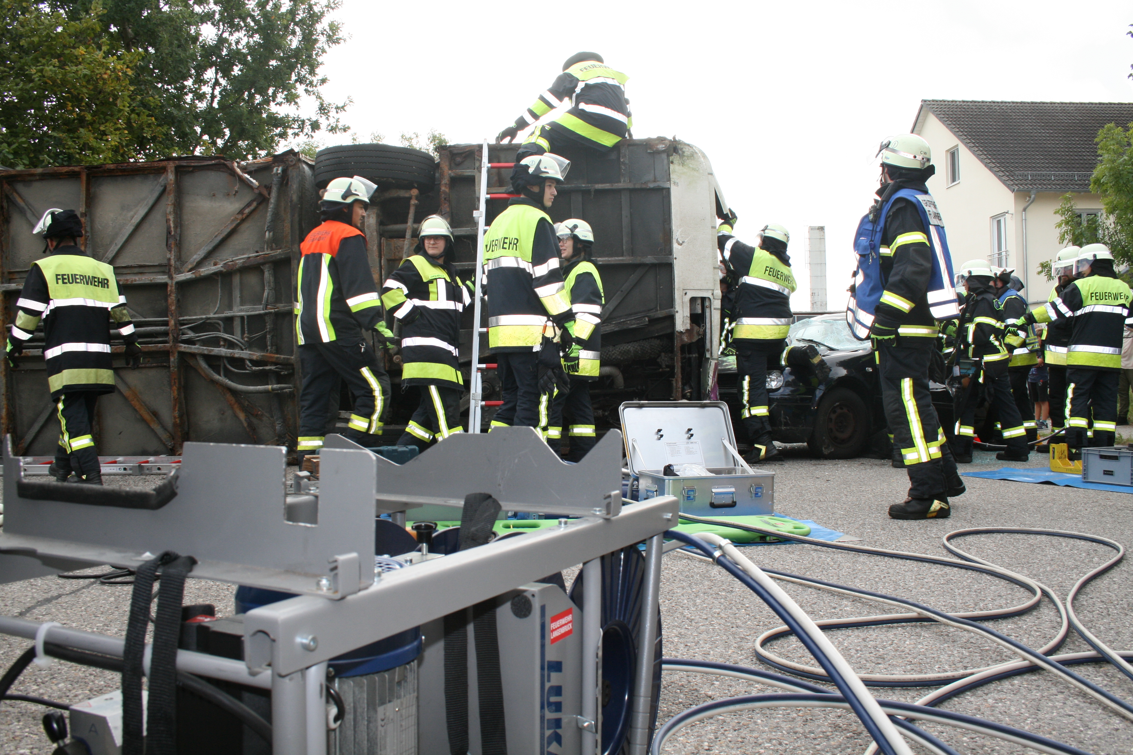 "Die letzten verunglückten Personen waren gut 70 Minuten nach Übungs-Beginn aus dem Bus beziehungsweise aus dem Pkw befreit", fasst die Feuerwehr zusammen. Aus Sicht des Rettungsdienstes seien für dieses Szenario sowohl umliegende als auch weiter entfernte Krankenhäuser für die Verletzten reserviert worden. Zudem seien fiktiv fünf Rettungs-Hubschrauber angefordert worden – die zur Übung jedoch nicht wirklich anrückten. Dies alles habe das Team um den leitenden Notarzt und um den organisatorischen Rettungsdienst-Leiter in Abstimmung mit der Leitstelle organisiert.