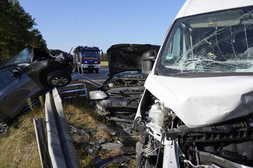 (ty) Ein heftiger und folgenreicher Verkehrsunfall hat sich am heutigen Morgen zwischen Schrobenhausen und Aichach auf der B300 ereignet. Gegen 7.20 Uhr geriet auf Höhe von Kühbach (Kreis Aichach-Friedberg) ein 39-Jähriger mit seinem Mercedes-Sprinter in den Gegenverkehr: Der Lieferwagen kollidierte zunächst mit einem entgegenkommenden Lastwagen und krachte anschließend frontal mit einem Toyota zusammen. Ein wiederum nachfolgender VW prallte in den Kleintransporter. Eine Pkw-Lenkerin (42) trug schwere Verletzungen davon, die andere Autofahrerin (24) sowie der Unfall-Verursacher erlitten leichte Verletzungen. Die Bundesstraße war für mehr als sechs Stunden komplett gesperrt.