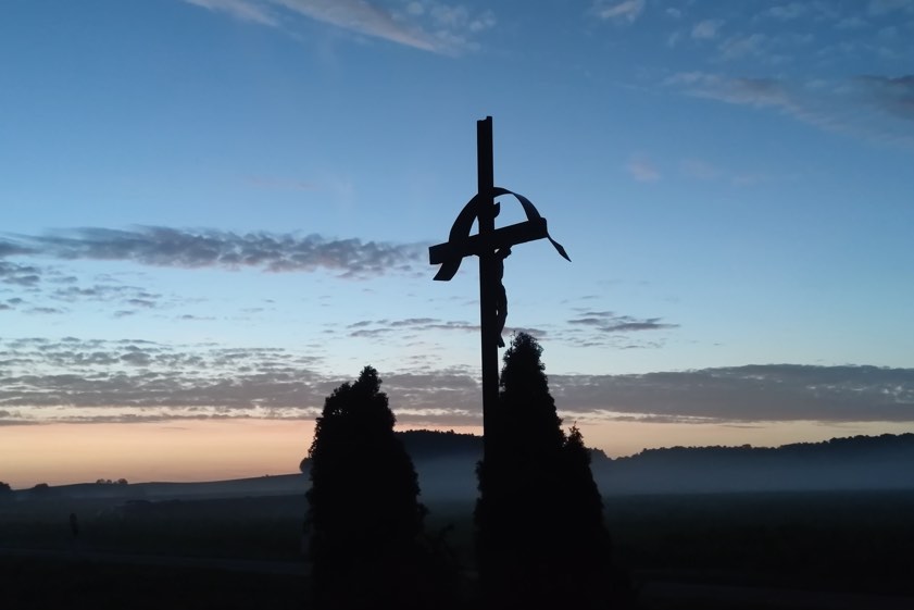 Seine Tour führte ihn nach eigenem Bekunden zunächst in die Gemeinde Karlskron, dort lichtete er beim Ortsteil Aschelsried ein Wegkreuz ab. Weiter ging es ebenfalls im Landkreis Neuburg-Schrobenhausen, und zwar in den Karlskroner Ortsteil Pobenhausen und zum Kalvarienberg beziehungsweise zur Wallfahrtskirche. "Im Vordergrund sieht man eine alte Stahlglocke der Pfarrkirche St. Quirinus von Pobenhausen, die hier ihren Bestimmungsort gefunden hat", erklärt Richard Bergmoser.