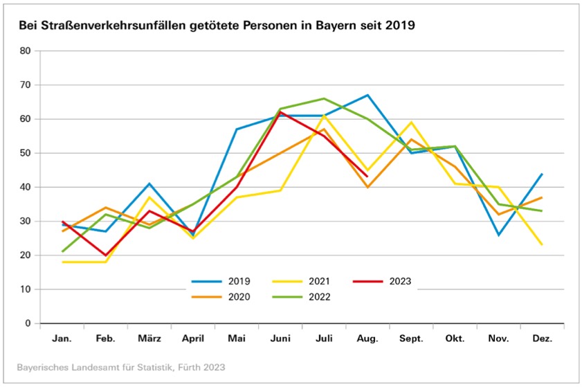 Im Zeitraum von Januar bis August des laufenden Jahres nahm die Polizei im Freistaat insgesamt 249 796 Unfälle auf bayerischen Straßen auf – das waren 1,4 Prozent mehr als im Vorjahres-Zeitraum. Dabei verunglückten 40 120 Verkehrsteilnehmer (minus 6,0 Prozent), davon 310 tödlich (minus 10,9 Prozent).